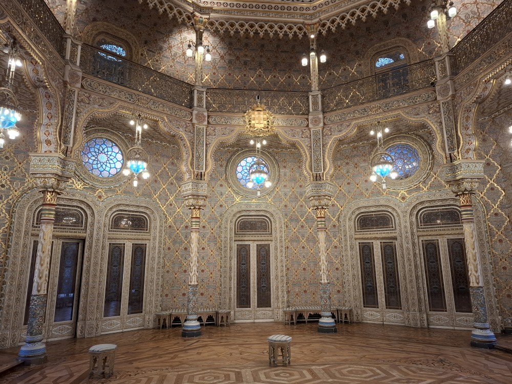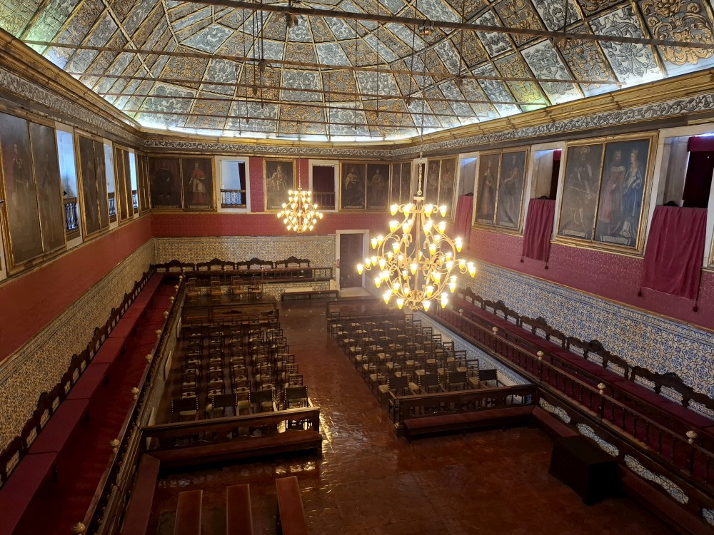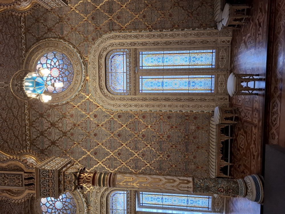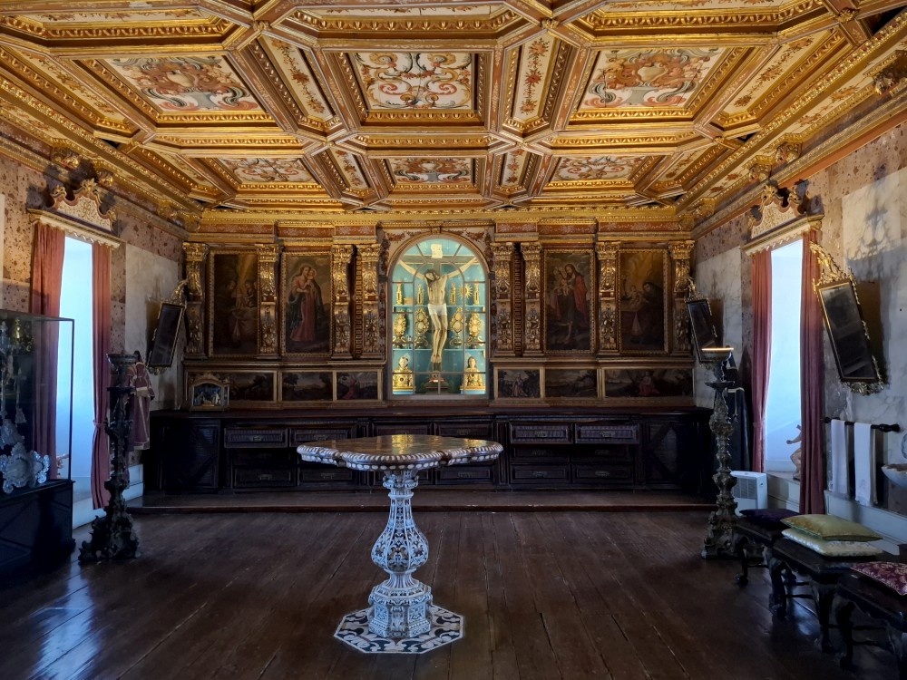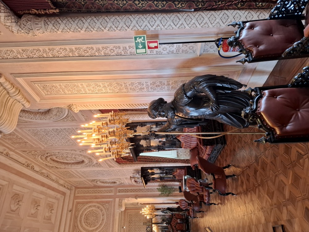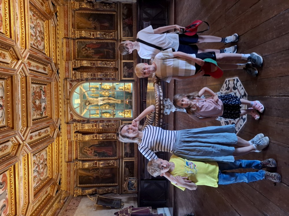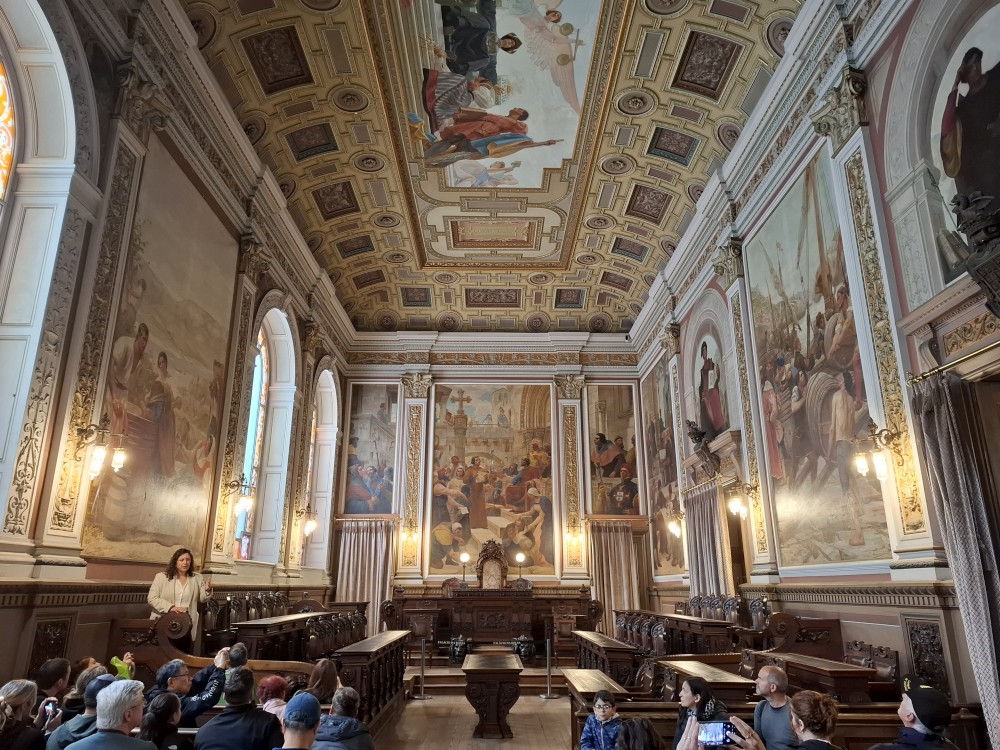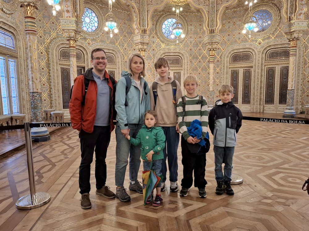 Prohlídka je s průvodcem, trvá asi 30 minut a je to v angličtině. Je to moc zajímavé a to nejhezší nás čeká na závěr - zlatý sál, prý nejkrásnější a nejreprezentativnější místnost v celém Portugalsku. Je tu také pracovna Luize, žáka Eifella, který navrhl ikonický kovový most v Portu. Po prohlídce si jdeme chvilku odpočinou na ubytování. Kluci dělají úkoly do školy, Jana opravuje písemnky.