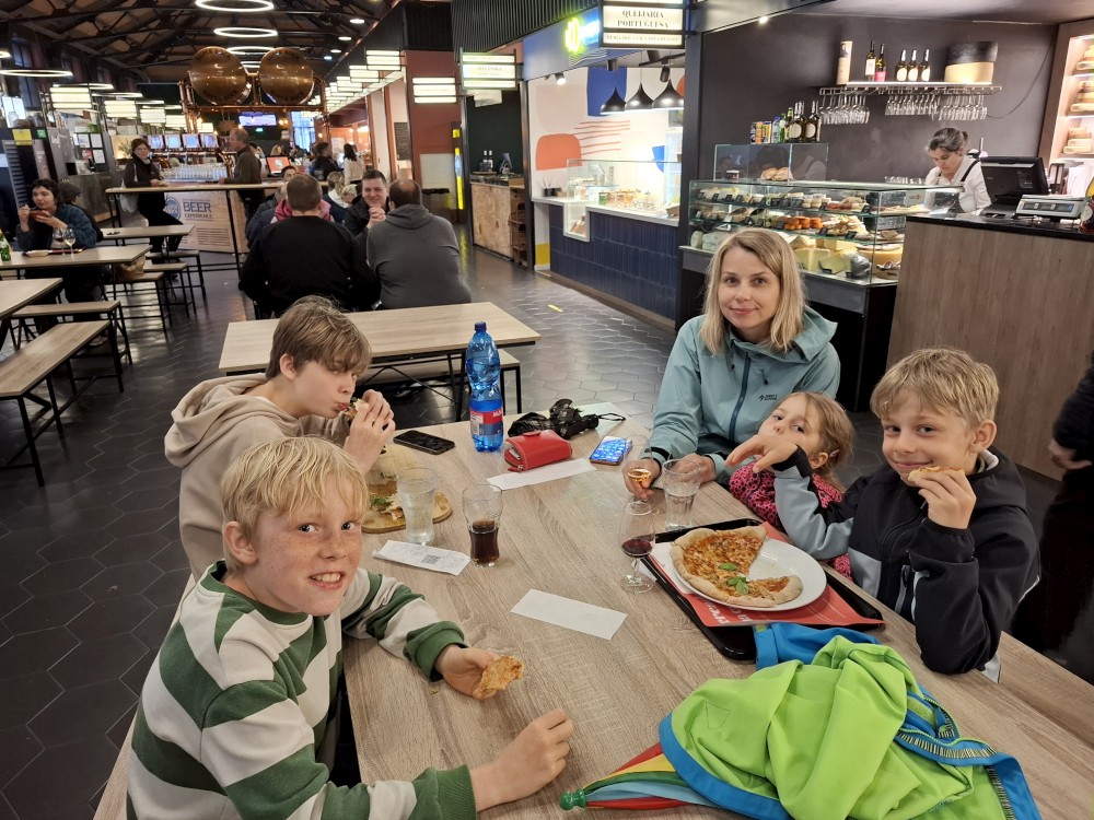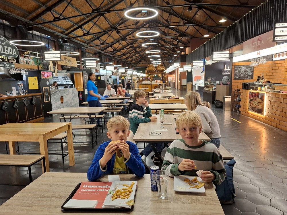 Kupujeme lístky na lanovku (asi 25 EUR) a jedeme nad budovami s Portským vínem na nábřeží. Jdeme do stejného foodcoartu jako včera - Mercado Beira-Rio. Dáváme si spoustu jídla (pizza, hamburger, hranolky, sýrečky, uzeniny), pijeme portské víno. Zkoušíme různé druhy portského, nejlepší je bílé.
