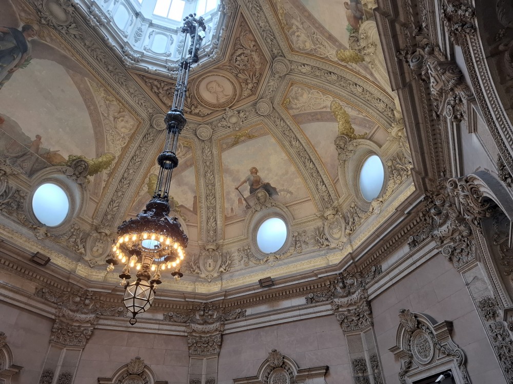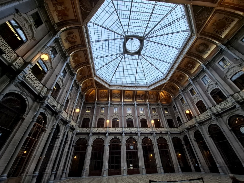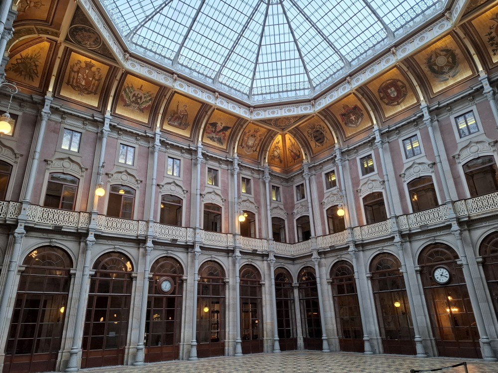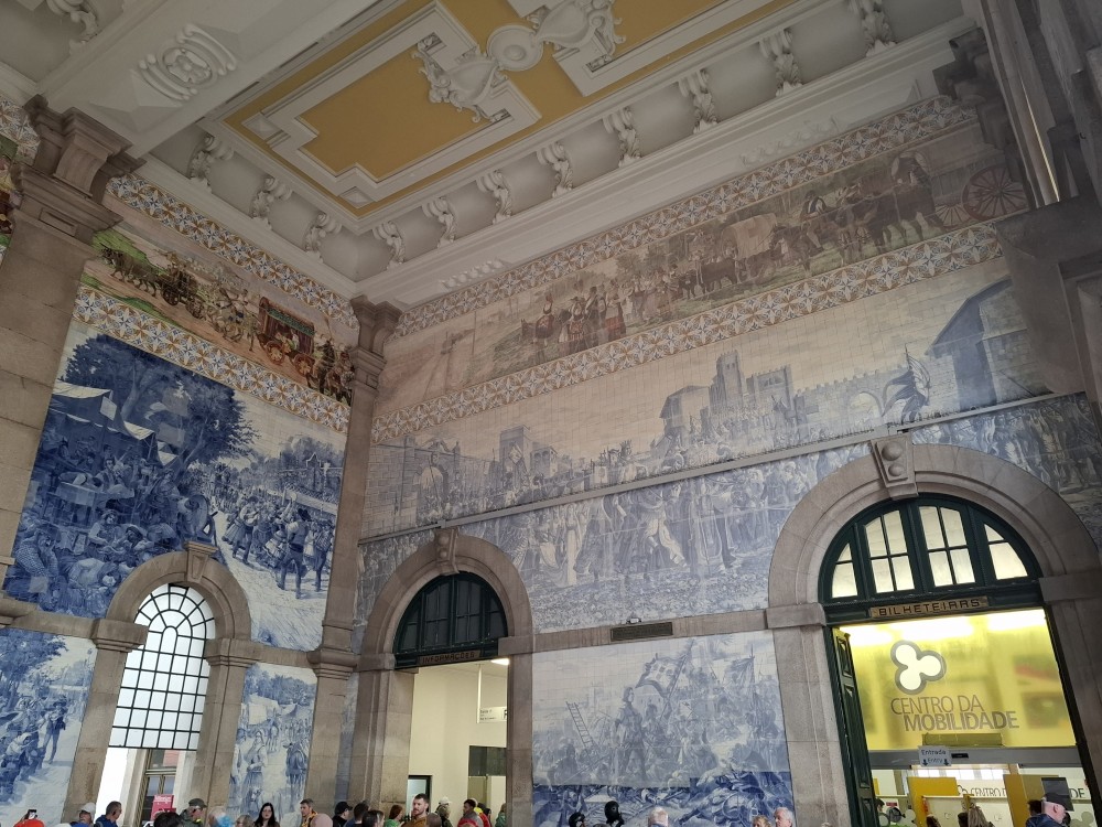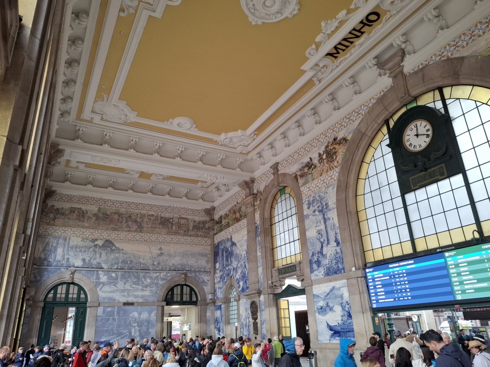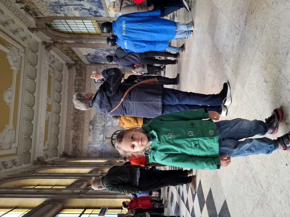 Procházíme uličkami ke katedrále Sé do Porto a pak na nádraží Porto Sao Bento s halou zdobenou Azulejos. Venku hodně prší a v hale je úplně narváno. Je zde přilehlé nádražní občerstvení. Sedáme sem a dáváme si nějaké zapečené sendviče a Bětuška palačinku. Pak už vyrážíme deštěm na prohlídku burzovního paláce.