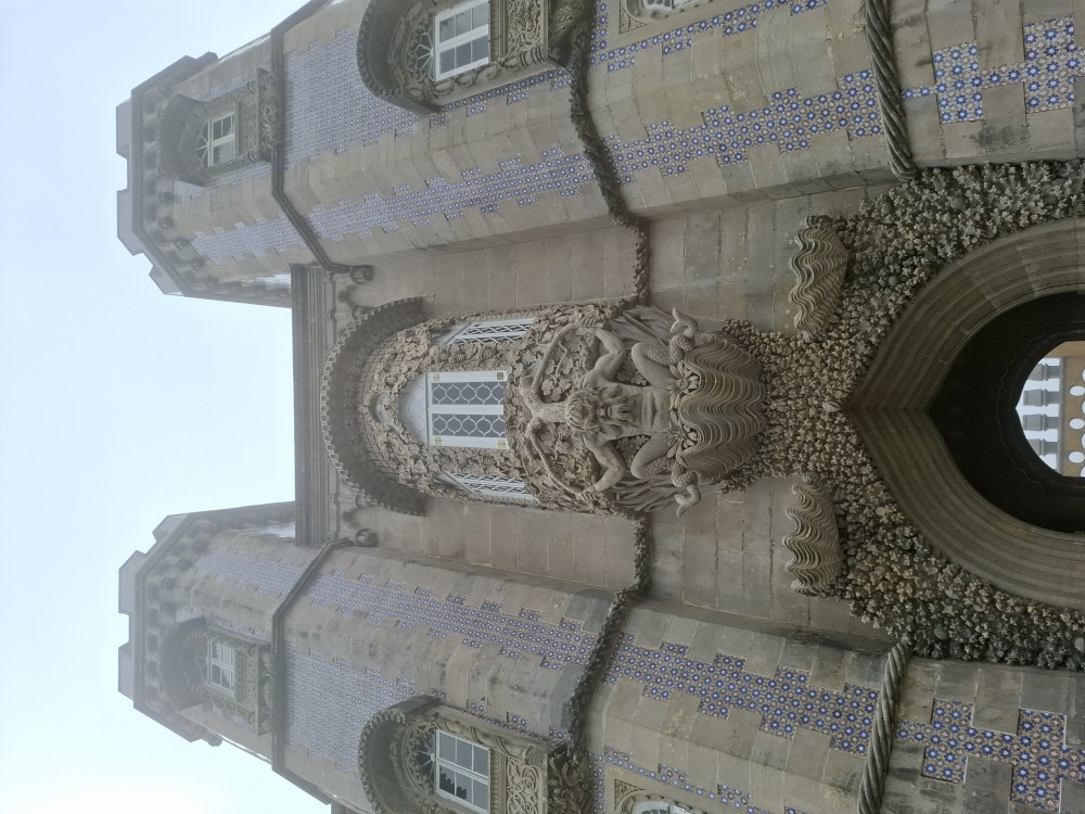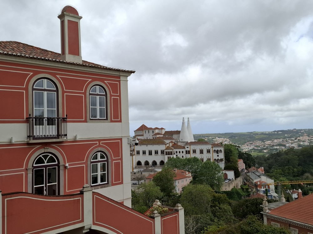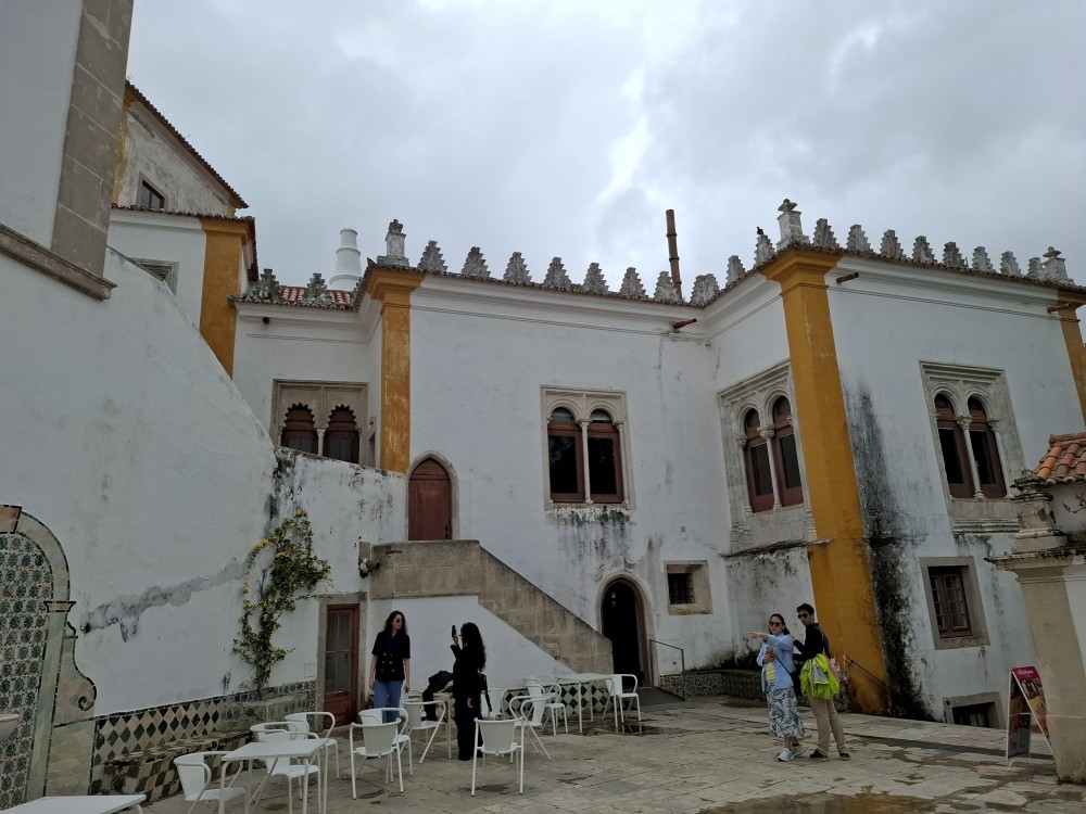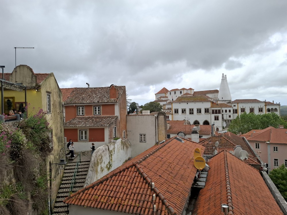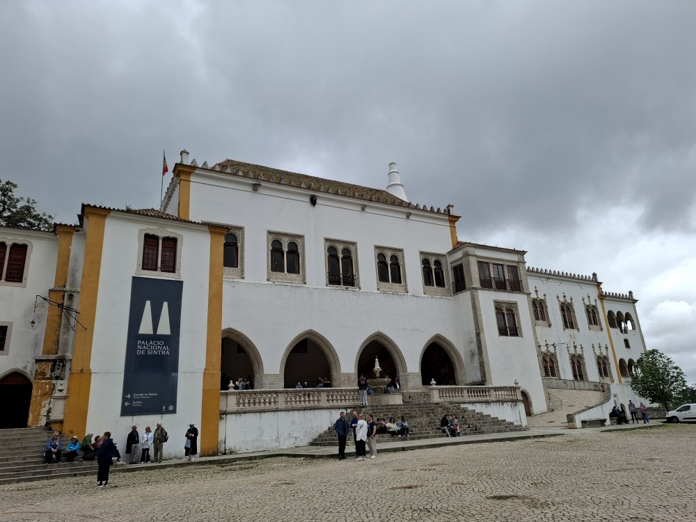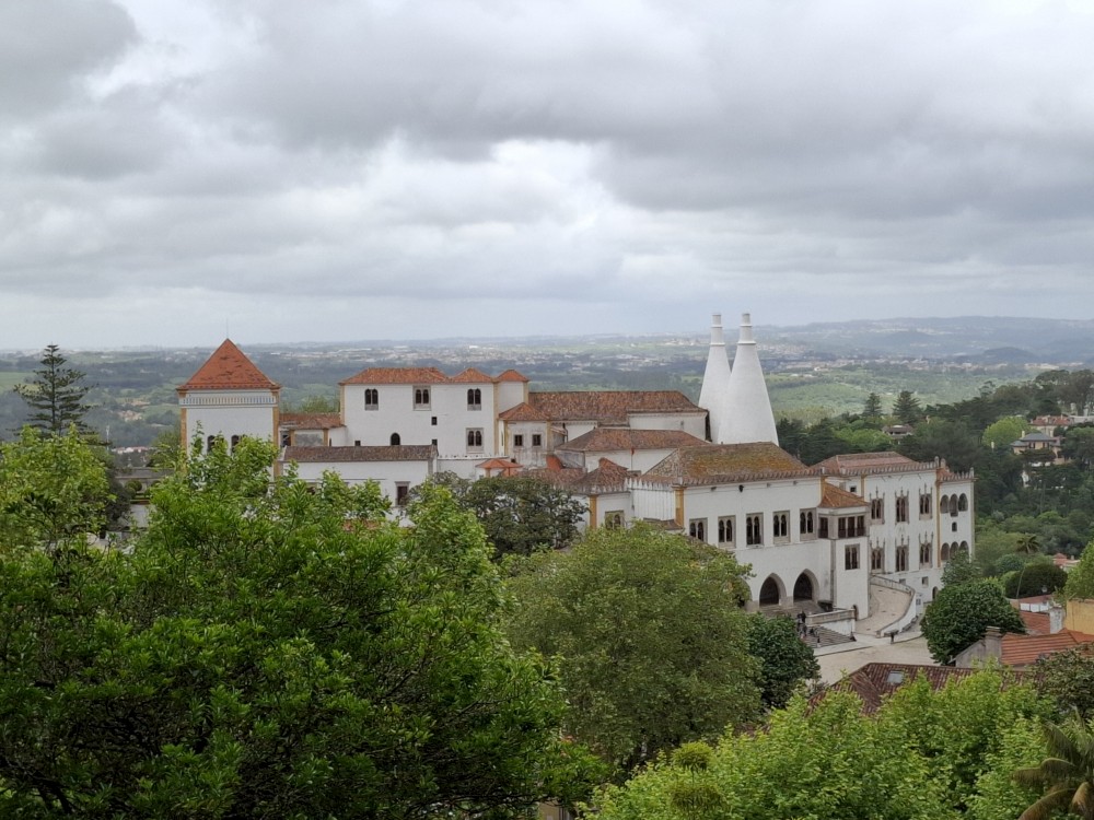 Vyrážíme tedy pěšky do kopce. U paláce Pena kupujeme lístky. V stup do interiérů je ale až od 16:30, tedy až za cca 4 hodiny. Nemá cenu čekat takovou dobu v zahradách, tak jdeme z kopce dolů do Sintry. Tady svačíme z vlastních zásob před palácem Palácio Nacional de Sintra s majestátnými bílými komíny.