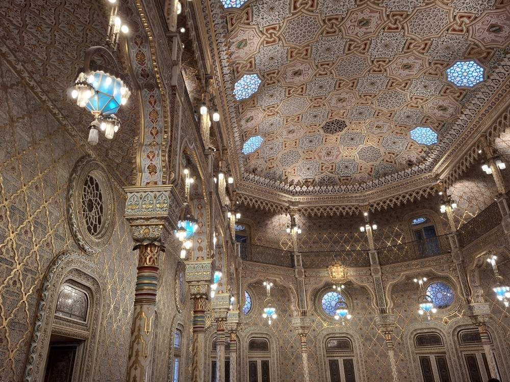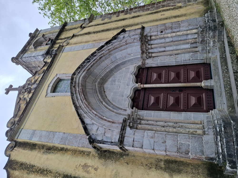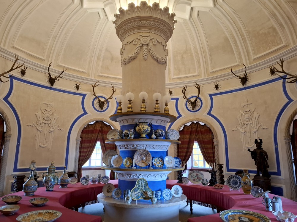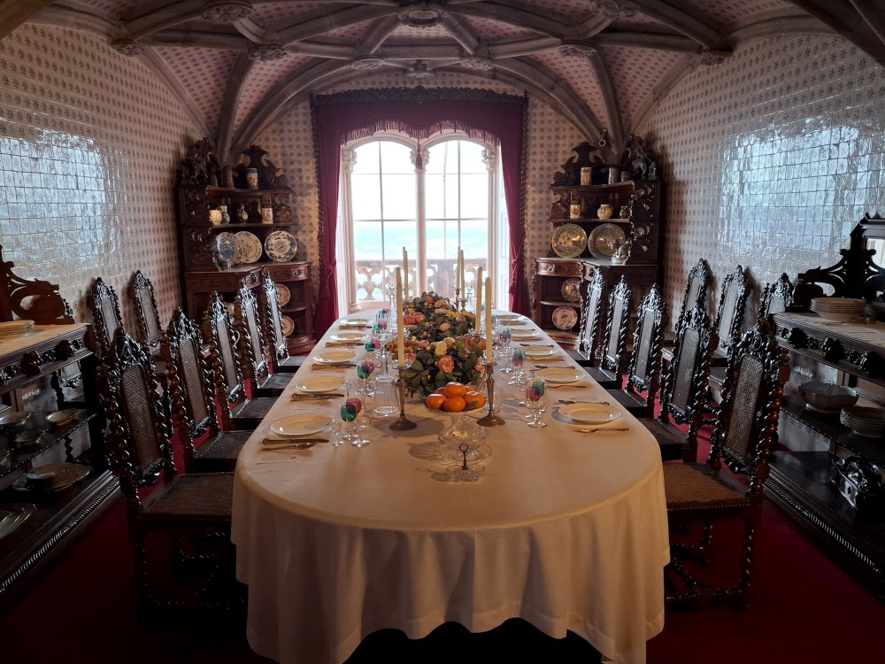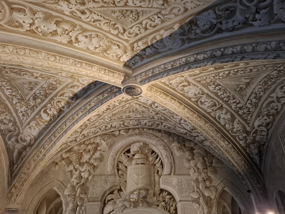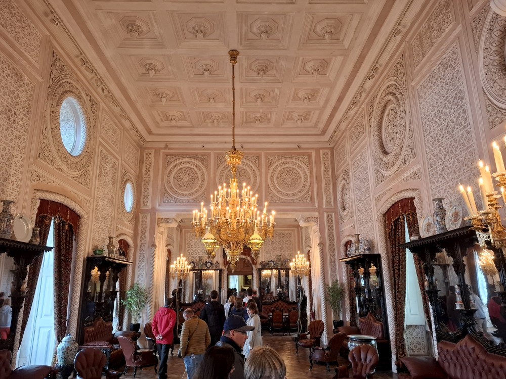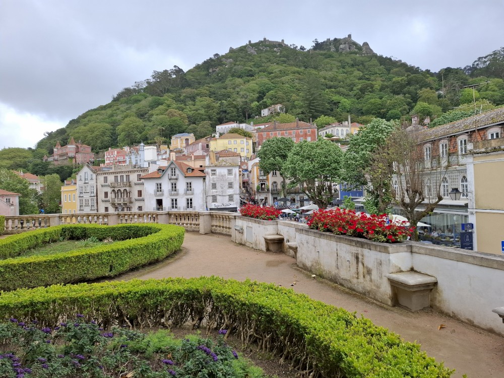 Vyrážíme tedy pěšky do kopce. U paláce Pena kupujeme lístky. V stup do interiérů je ale až od 16:30, tedy až za cca 4 hodiny. Nemá cenu čekat takovou dobu v zahradách, tak jdeme z kopce dolů do Sintry. Tady svačíme z vlastních zásob před palácem Palácio Nacional de Sintra s majestátnými bílými komíny.