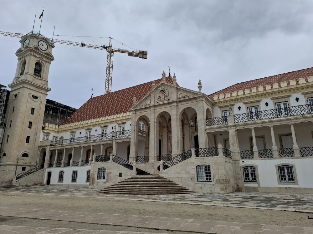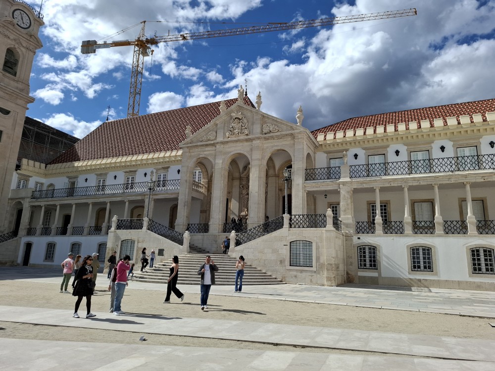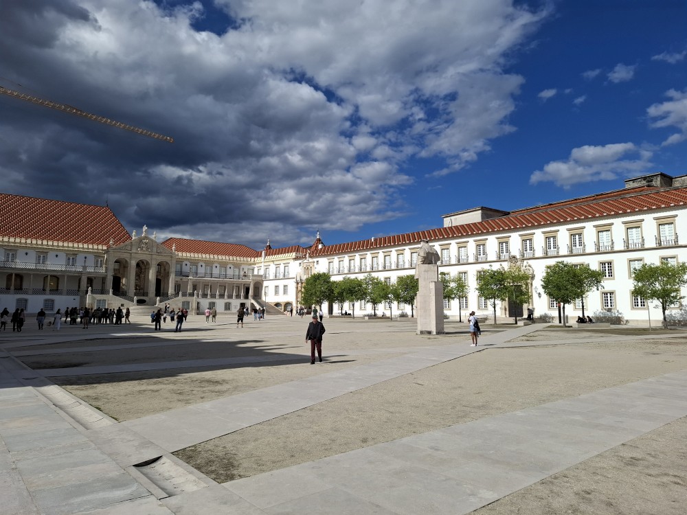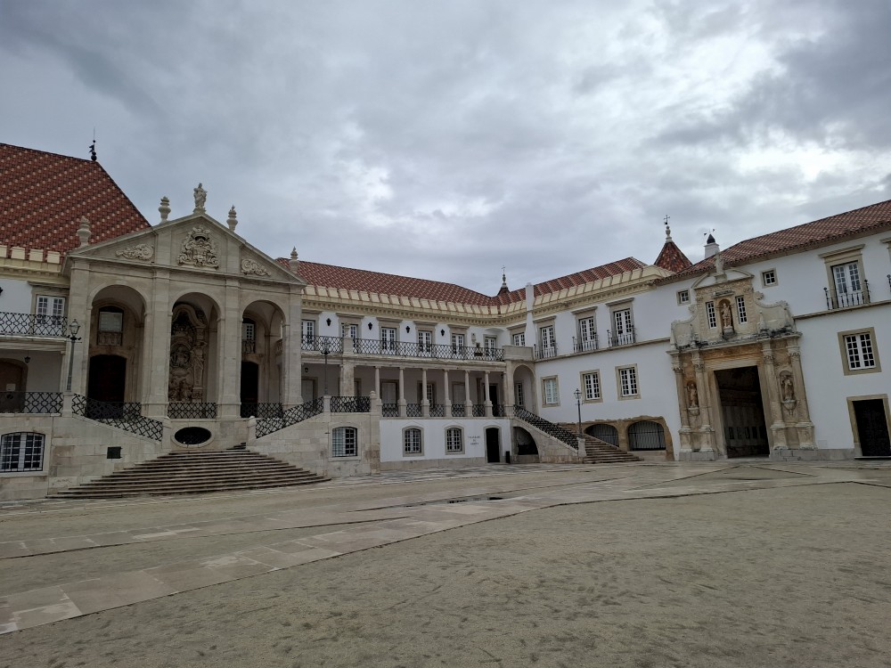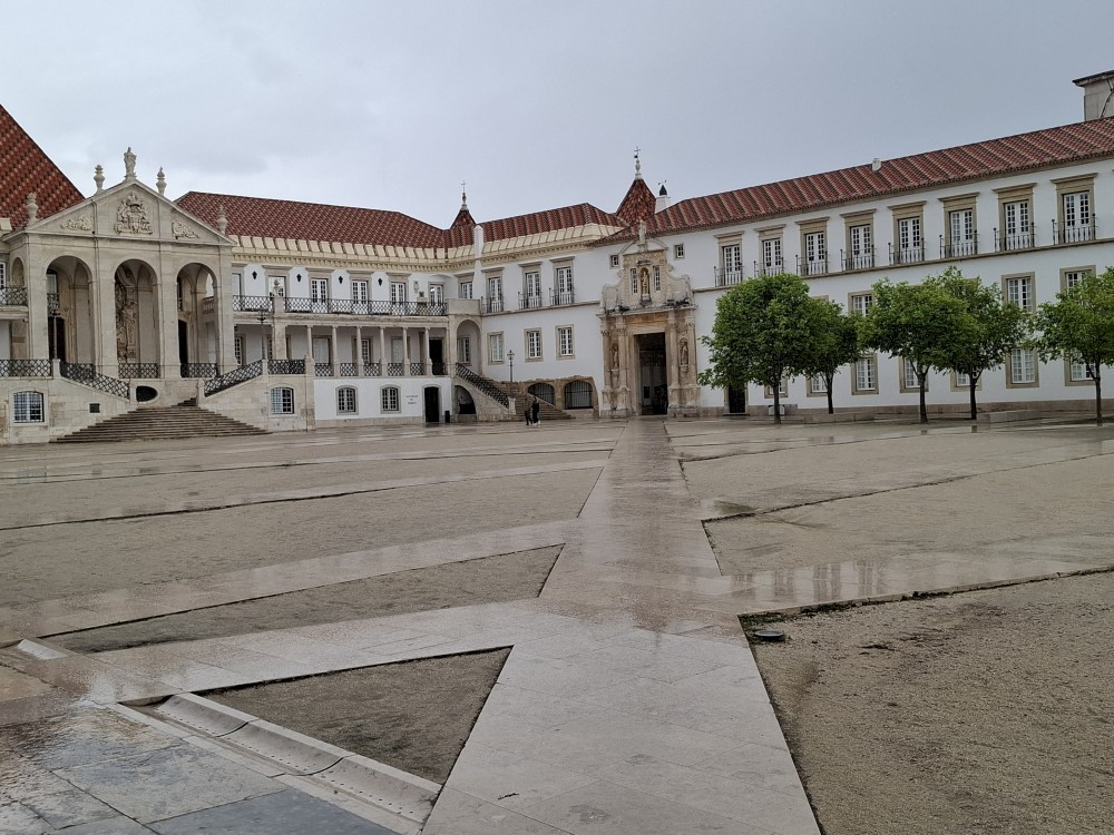 Jdeme prozkoumat město. Prodíráme se demonstranty a pokračujeme uličkami starého města vzhůru k universitě. Chceme se podívat do Joaniny knihovny. Brána ke knihovně je ale zavřená. Uvnitř vidíme lidi, tak obcházíme celou universitu z druhé strany. Knihovna je již dnes bohužel vyprodaná. Jedna průvodkyně nám navrhuje jít koupit lístky na celou universitu (na samotnou knihovnu se lístky koupit nedají), podívat se dnes na kapli a promoční místnost a Joaninu knihovnu zamluvit na zítřejších 9:00.