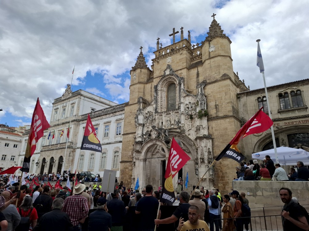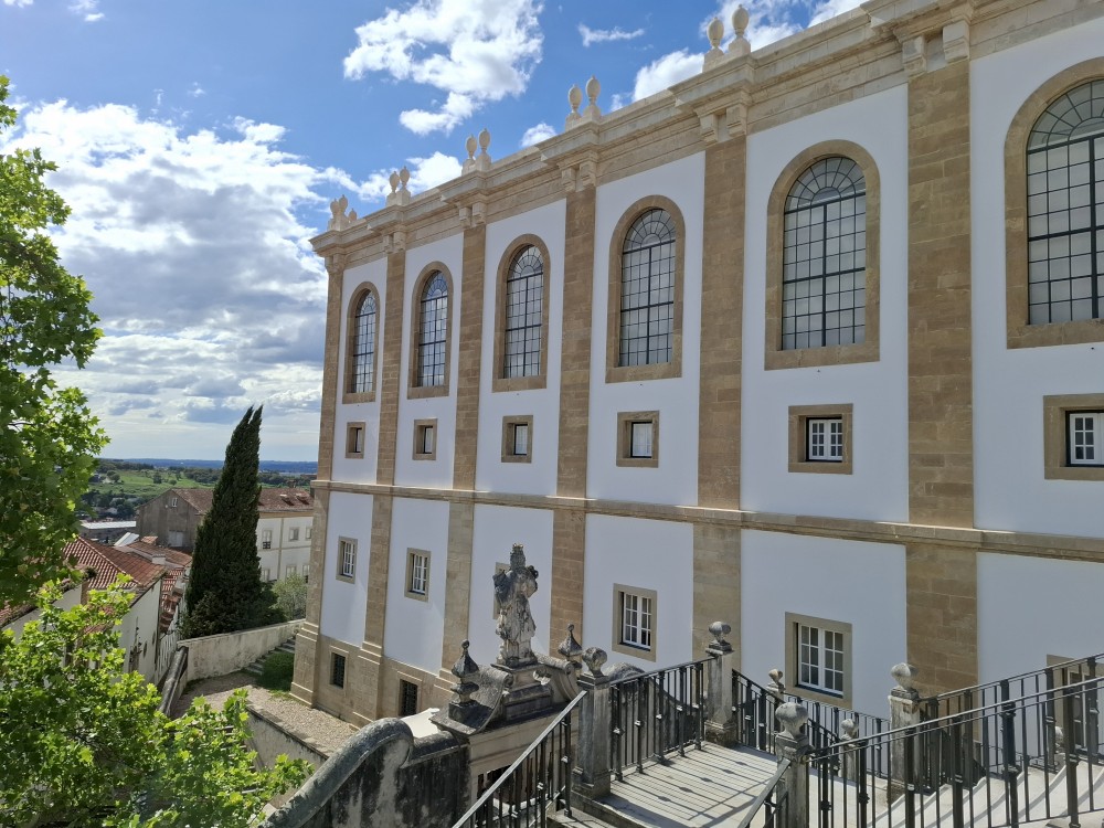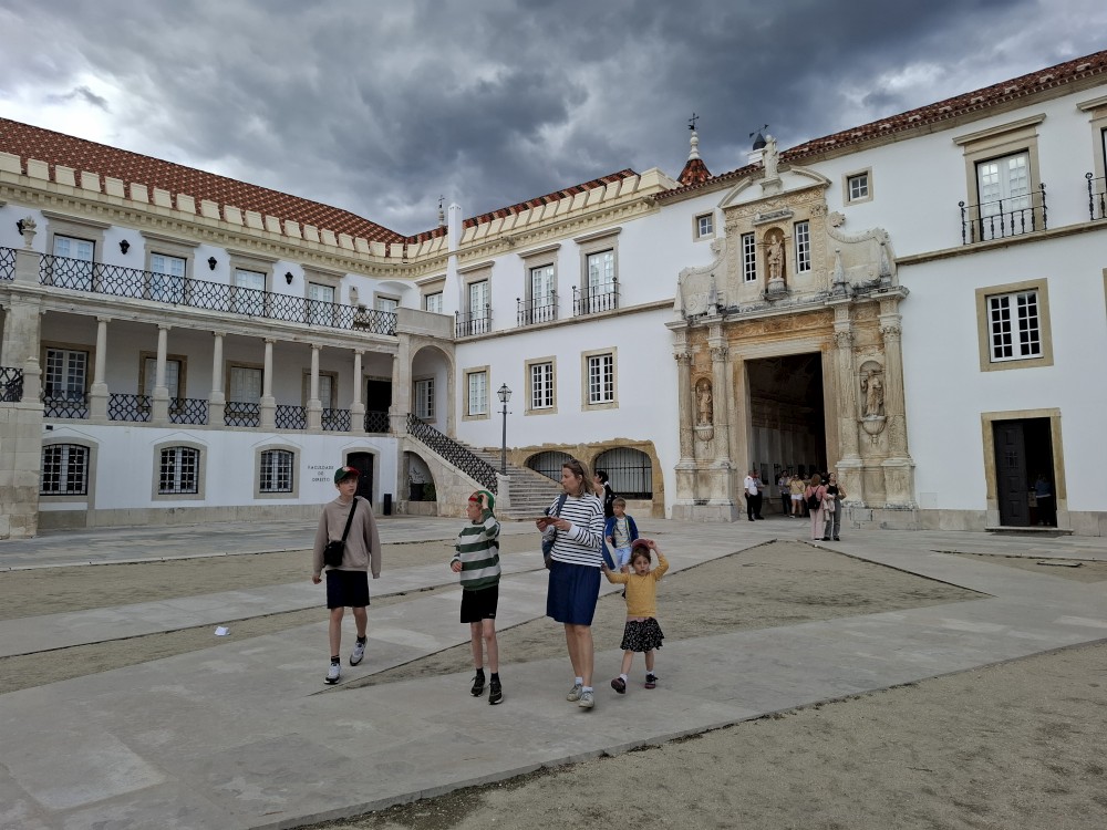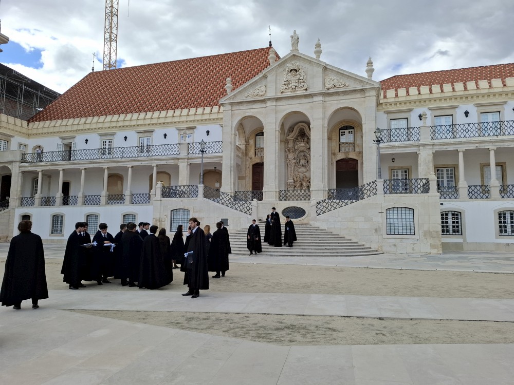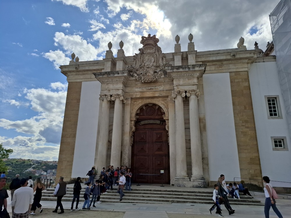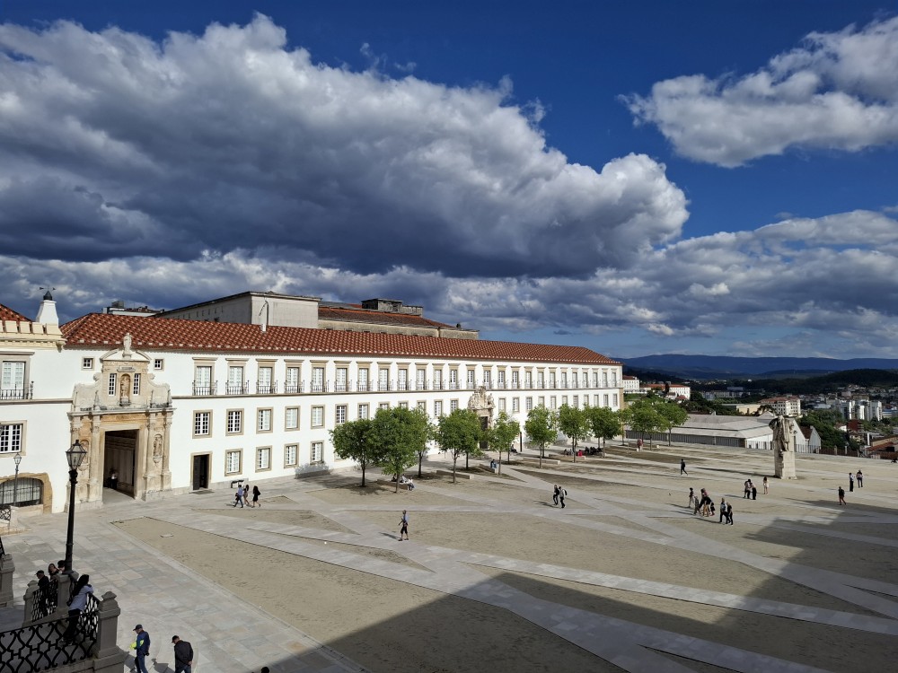 Jdeme prozkoumat město. Prodíráme se demonstranty a pokračujeme uličkami starého města vzhůru k universitě. Chceme se podívat do Joaniny knihovny. Brána ke knihovně je ale zavřená. Uvnitř vidíme lidi, tak obcházíme celou universitu z druhé strany. Knihovna je již dnes bohužel vyprodaná. Jedna průvodkyně nám navrhuje jít koupit lístky na celou universitu (na samotnou knihovnu se lístky koupit nedají), podívat se dnes na kapli a promoční místnost a Joaninu knihovnu zamluvit na zítřejších 9:00.
