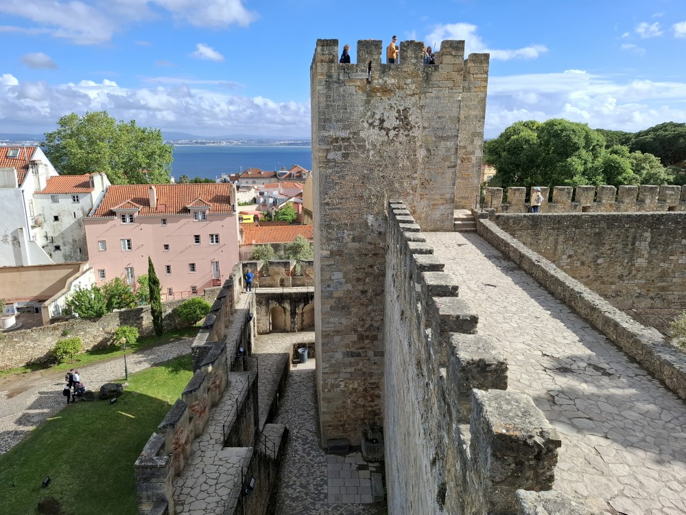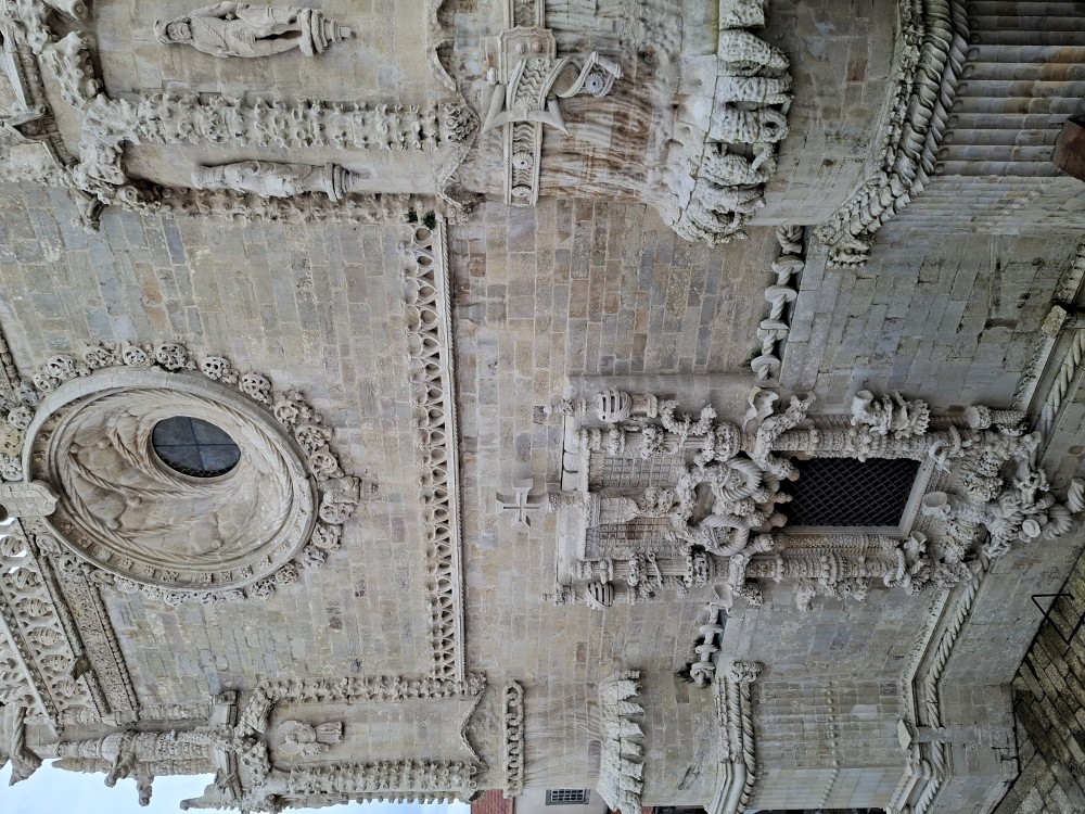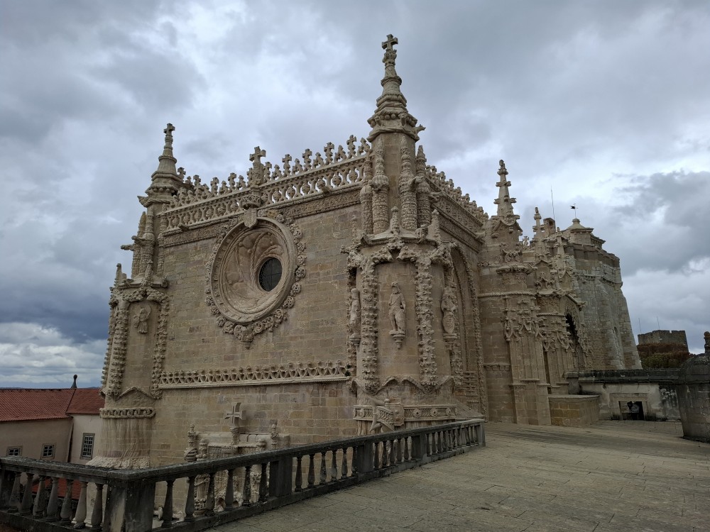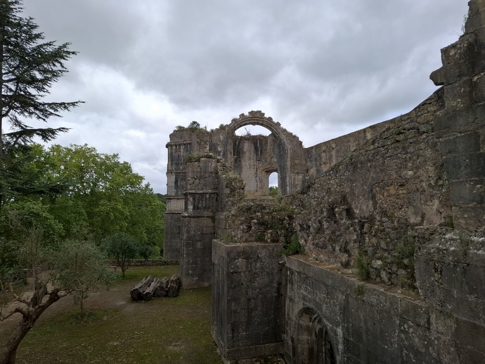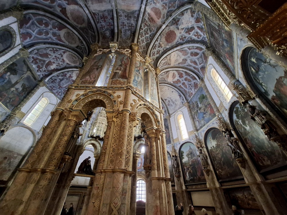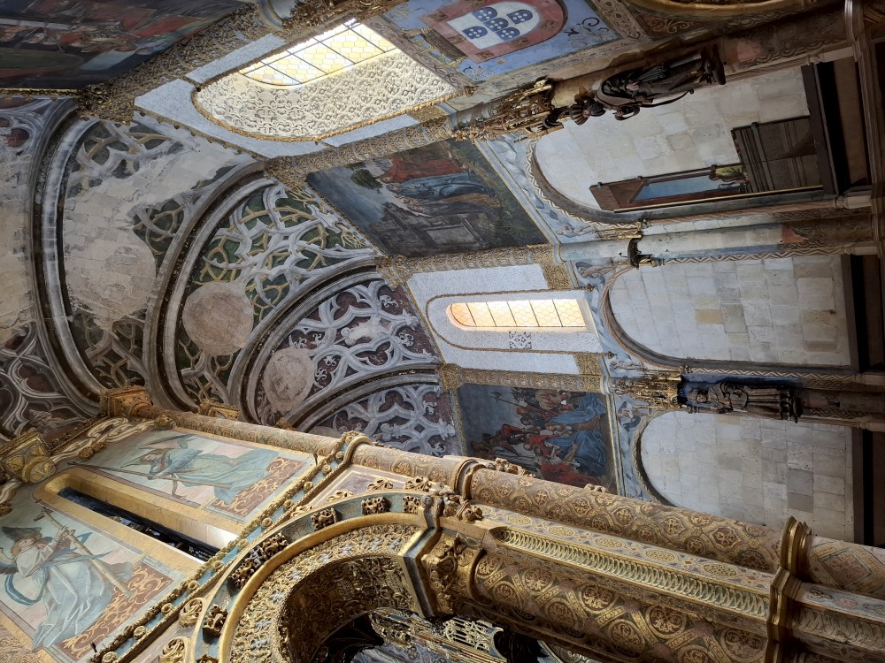 V dolní části jsou v uzamčených policích, v patře nad ochozem volně. Po návštěvě knihovny klesáme starým městem na ubytování, balíme a jdeme k autu. Opouštíme Coimbru. Čeká nás dnes několik zastávek. Jako první Tomar, templářský hrad. Přímo u vchodu (zatím si myslíme, že je to vchod) stojí rytíř v brnění. Čekáme, že si s námi bude chtít udělat fotku za 5 EUR. Kluci s Bětuškou probíhají kolem něj jakože závodí a rytíř v těžkém brnění je bez šance na fotku.