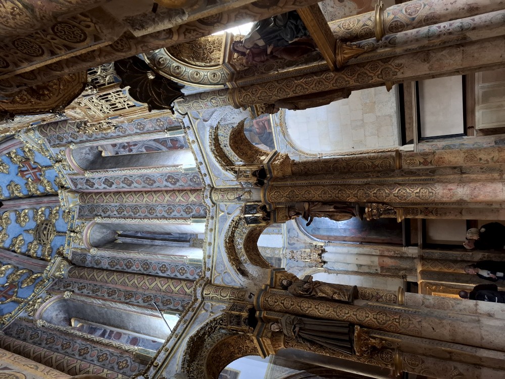 Hned na začátku prohlídky nás čeká kruhová kaple po vzoru kaple Kristova hrobu v Jeruzalémě. Je to neskutečná krása. Oltář je uprostřed kruhového sloupoví. Do kaple mohli rytíři i se svými koni. Seděli v jejich sedlech a stáli okolo oltáře. Sloupy oltářního prostoru jsou bohatě zdobené, stejně jako stěny celé kaple. Pak zkoumáme další části hradu, je opravdu hodně rozlehlý.