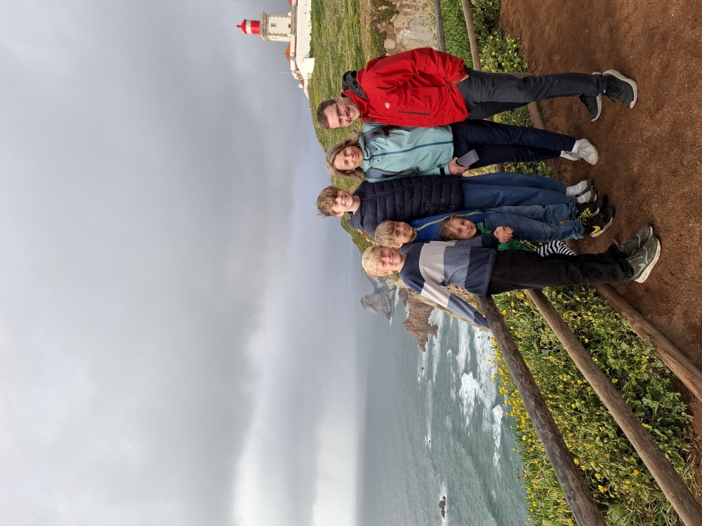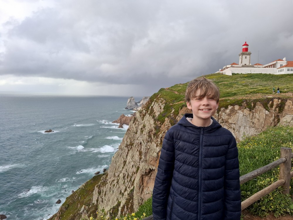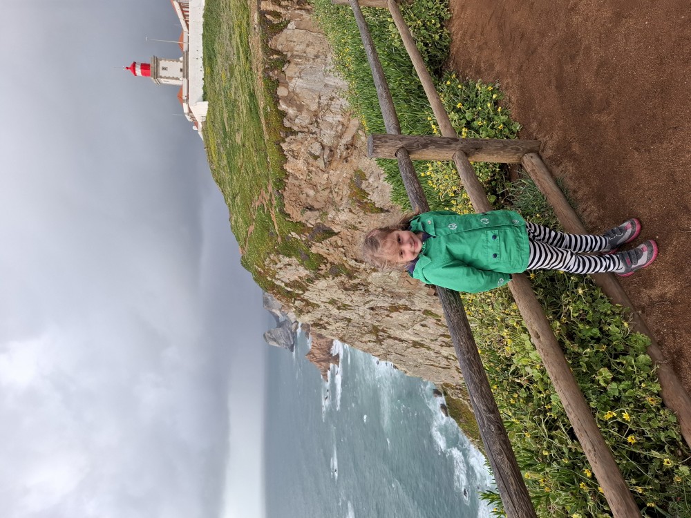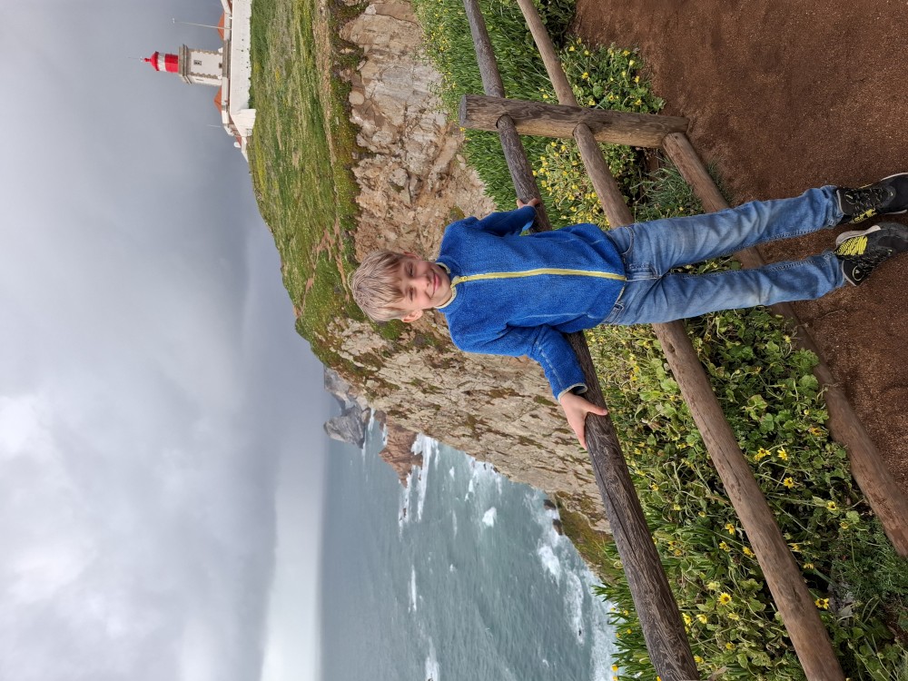 Je tu hodně lidí. Jsou zde krásné výhledy. Kluci se postupně stávají nejzápadnějším člověkem v Evropě, jak se nahýbají na zítce. Pak už jedeme do Colares na naše ubytování. Jdeme do stejné restaurace jako včera a dáváme si hostinu. Děti si dávají stripsy, my chobotnici s bramborovým pyré a salátkem a pak ještě sea food tapas a víno.