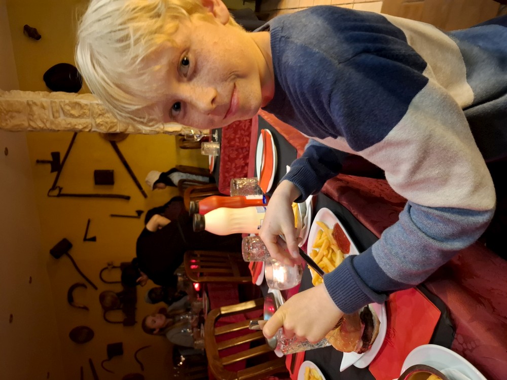 Kluci a Bětuška si dávají kuřecí stripsy, my s Janou víno. Pak už jdeme spát.