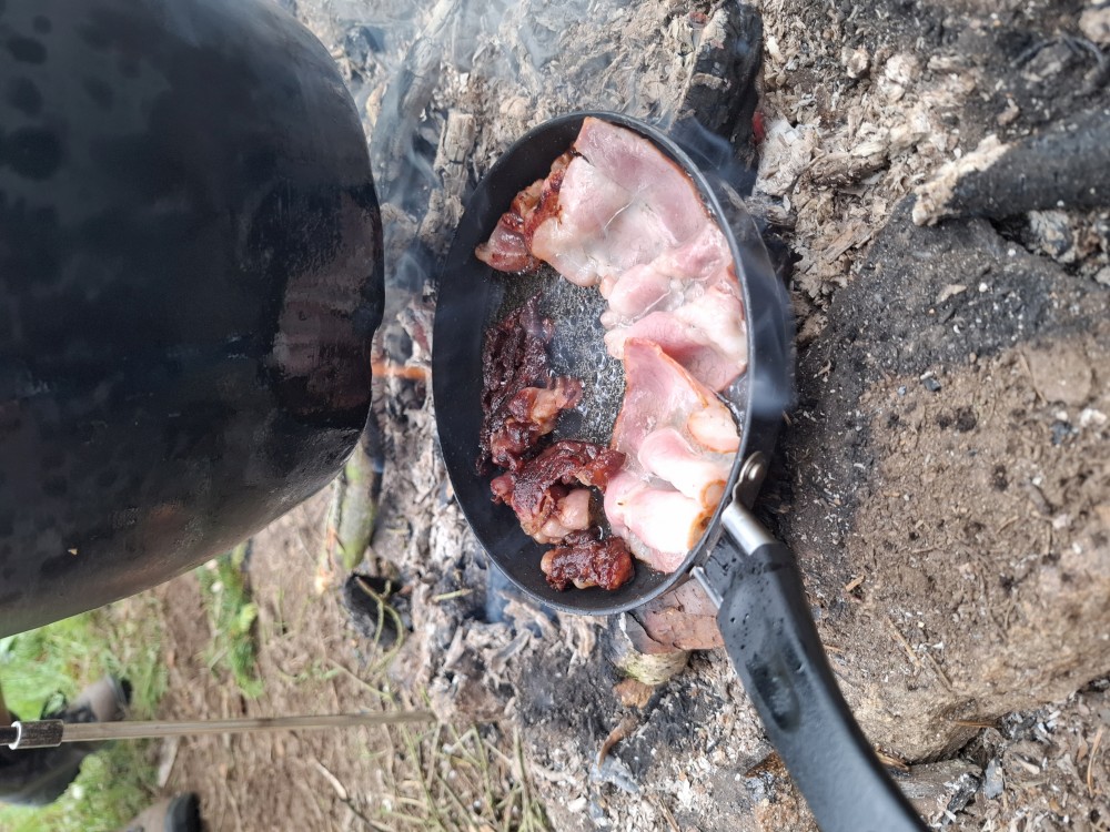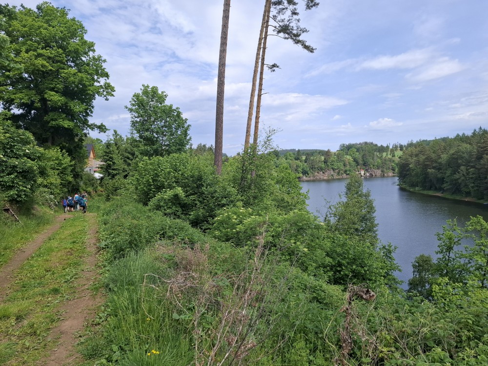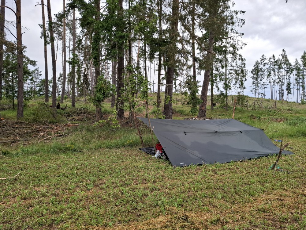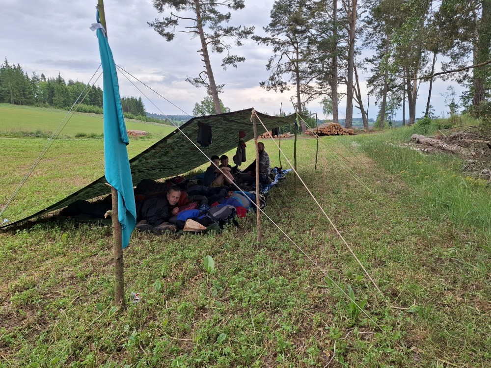 Stavíme plachty a stany, rozděláváme oheň, pečeme buřty, dáváme si jiné dobroty, povídáme. Noc byla dobrá, trochu pršelo, ale ne moc. Ráno snídáme, balíme a vyrážíme. Pokračujeme po červené. Po lávce přecházíme na druhý břeh Hejlovky (Želivka) a pokračujeme kolem vodní nádrže Sedlice do Sedlic.