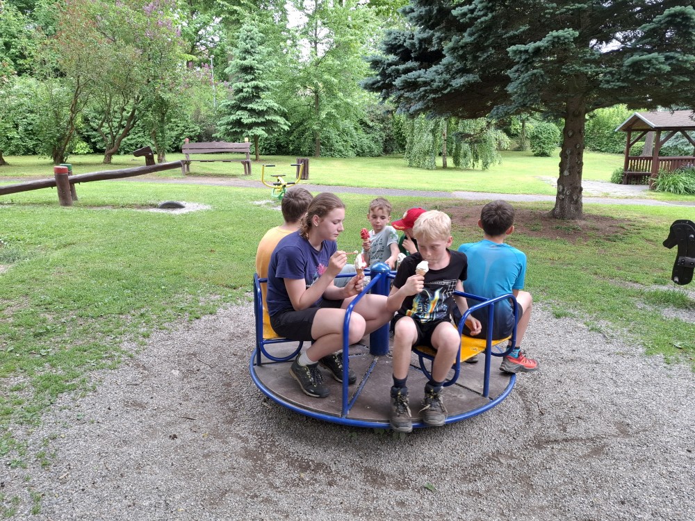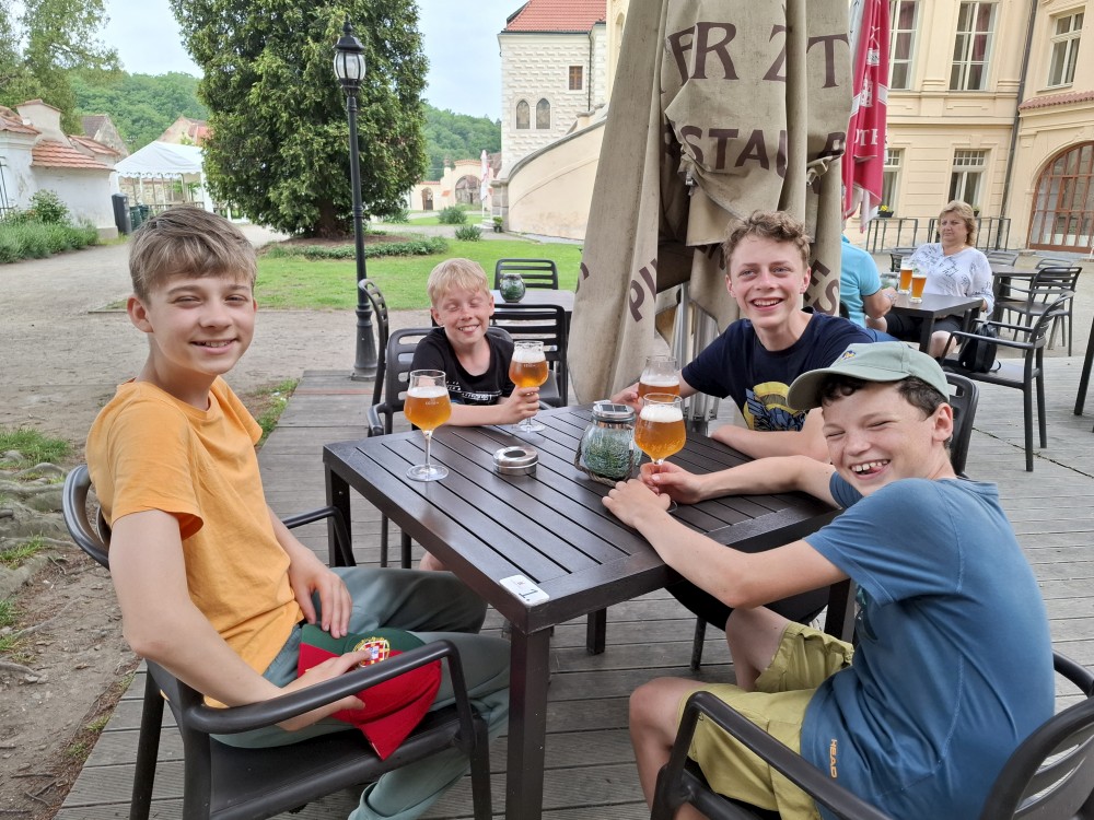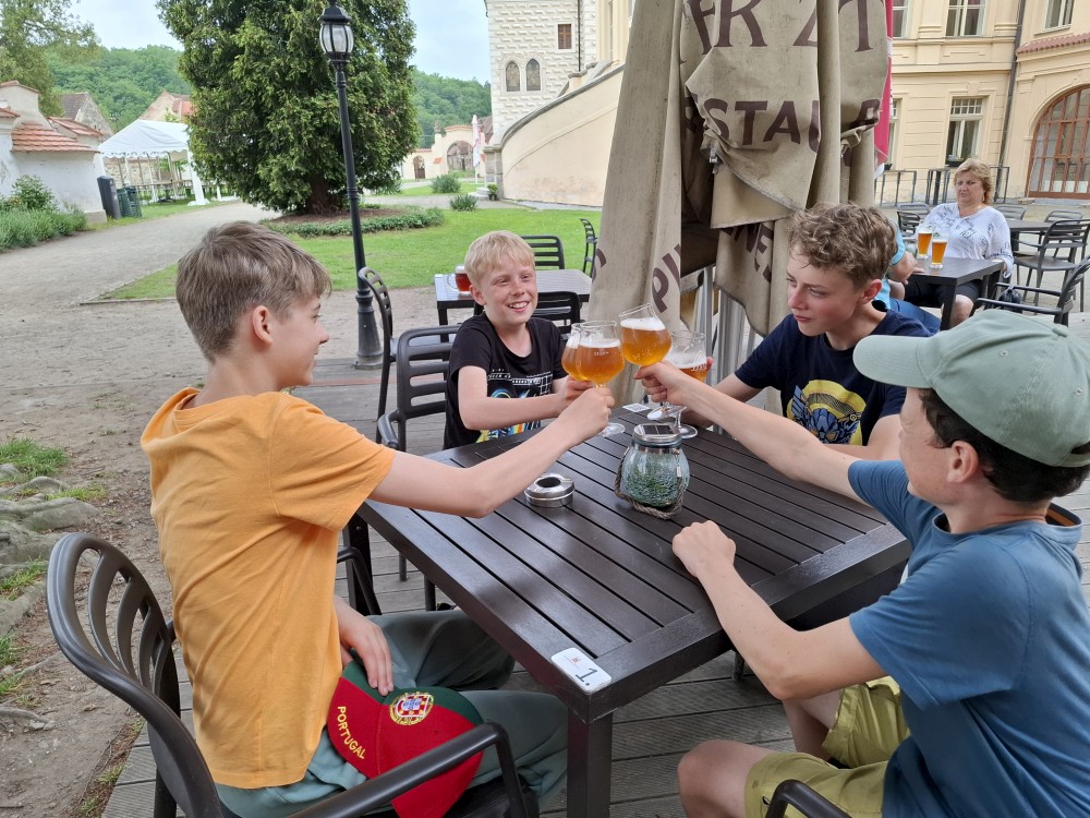My se jdeme podívat do poutního kostela Narození Panny Marie a pak na chvíli posedíme v Klášterní a pivovarské restauraci Želiv. Kluci si dávají nějakou limonádu, co vypadá jako pivo. Pak už sedáme na autobus a asi za hodinku jsme v Táboře. Tam pro nás přijela Jana. Loučíme se s ostatními. Pro nás to letos bylo krátké, ale moc se nám to líbilo.