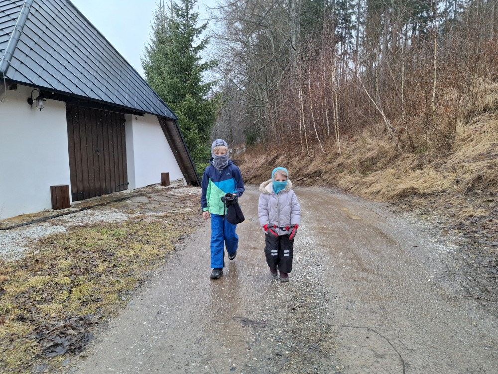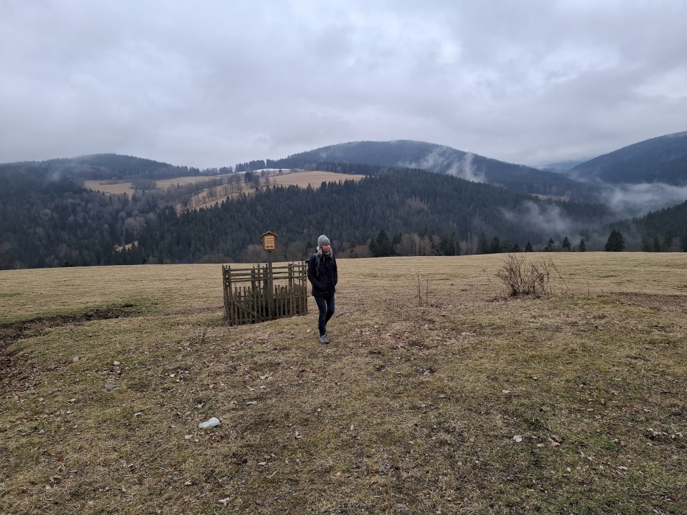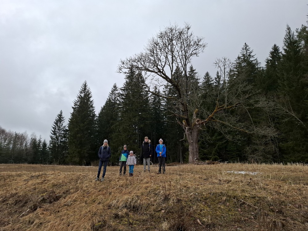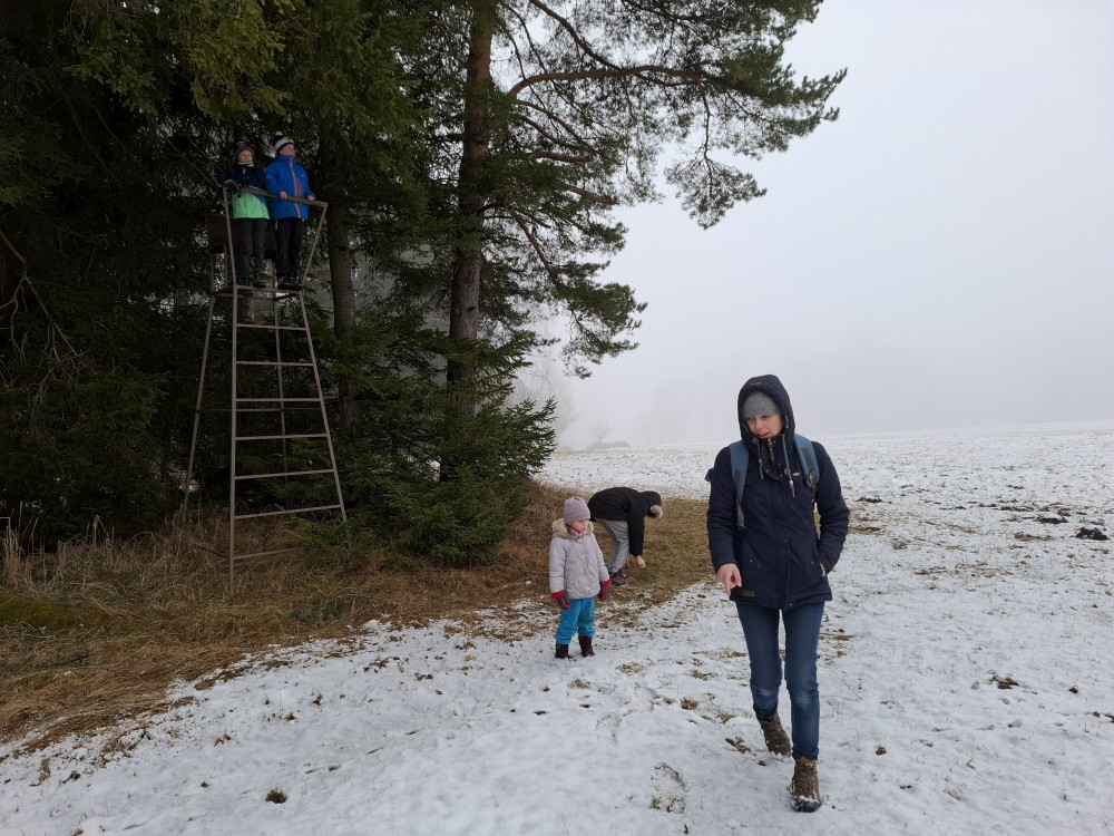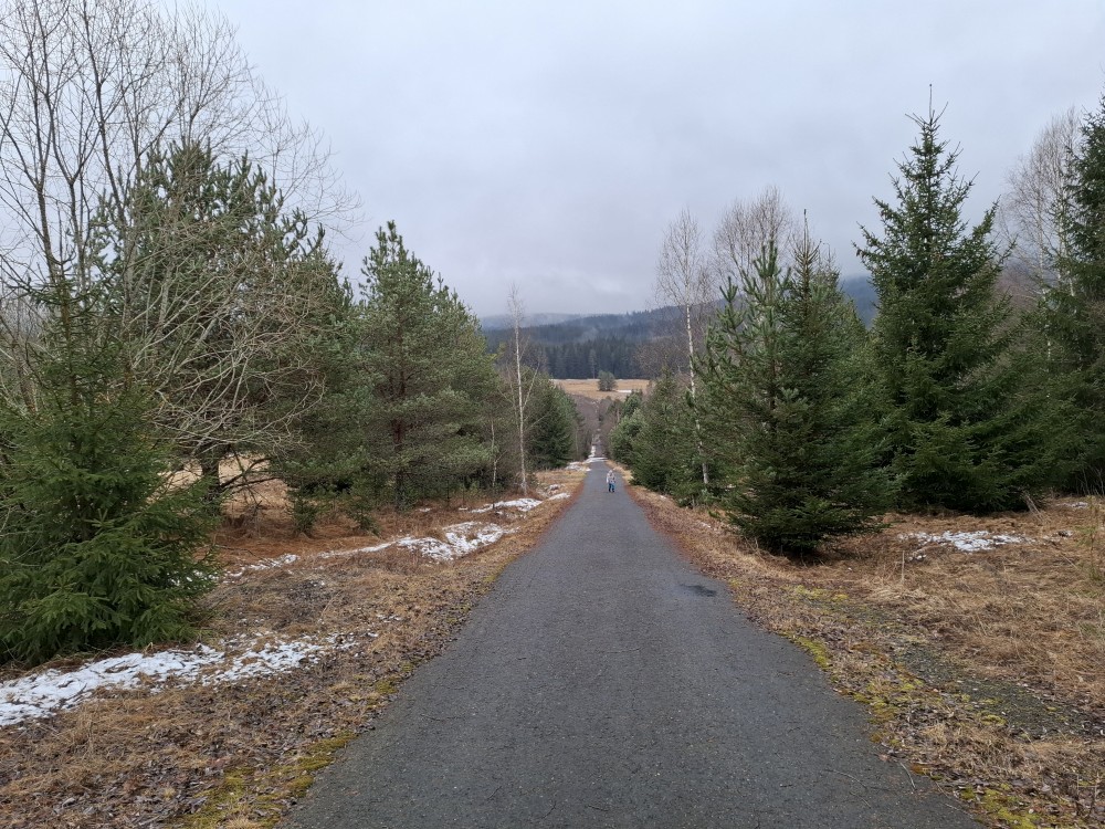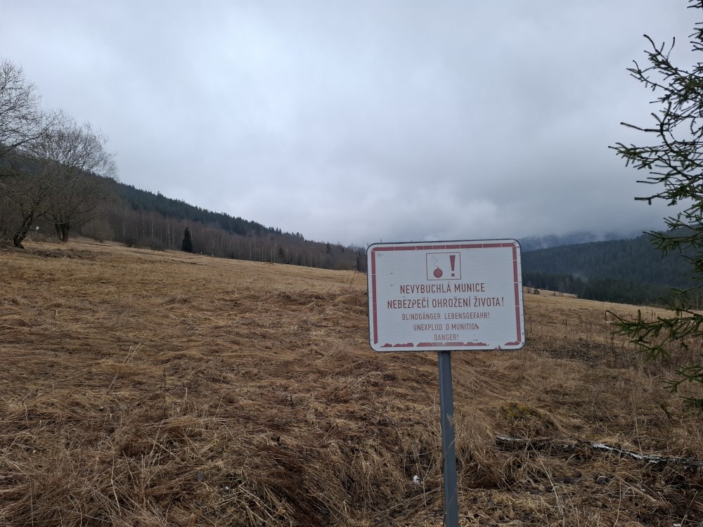 Pokračujeme na rozcestí Stodůlky. Kluci jdou po louce. Nebyl to dobrý nápad, u cesty vidíme cedule upozorňující na riziko nevybuchlé munice. Kluci se rychle vrací na cestu. Pokračujeme po zelené značce na Paště. Dětem začíná být zima. Jdu tedy napřed k autu a autem se vracím na lávku přes Otavu. Nabírám ostatní a jedeme pro druhé auto na Velký Bor.