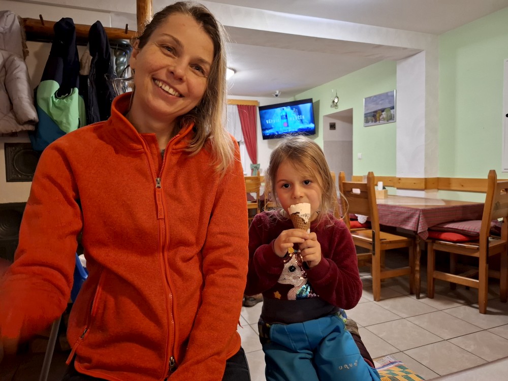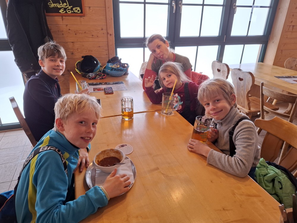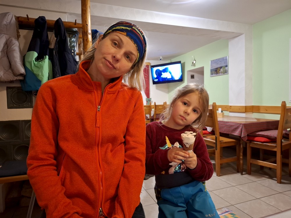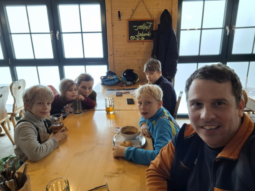 Postupně se do toho dostáváme a nacházíme ideální místa na ježdění, jde to není prudké. Bětuška se rychle zlepšuje a už jede obstojně a moc nepadá. Pozdní oběd si dáváme v restauraci na sjezdovce. Pak ještě chvilku jezdíme. Pak už sedáme do auta a jedeme zpět do Jelenova.