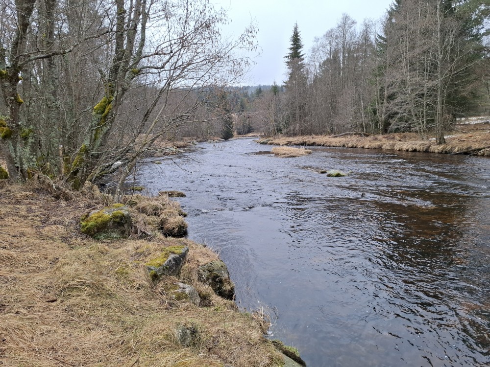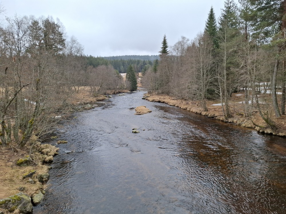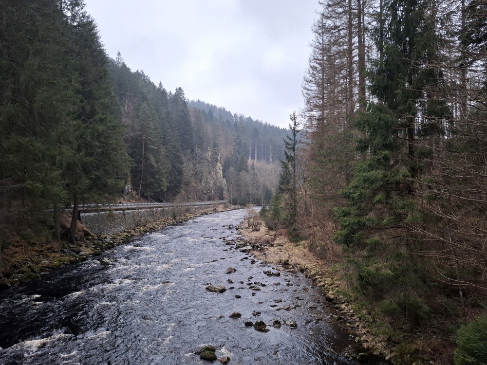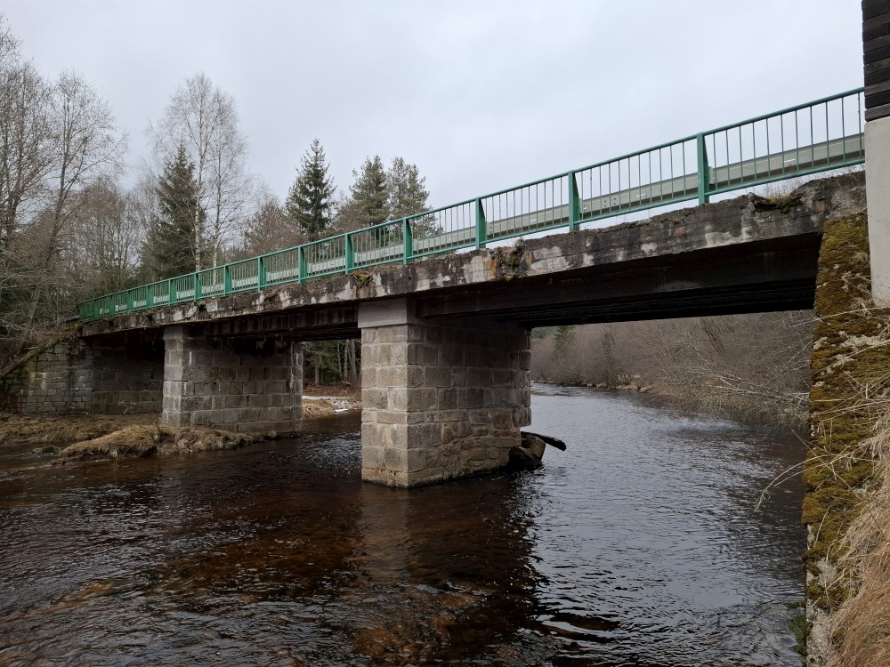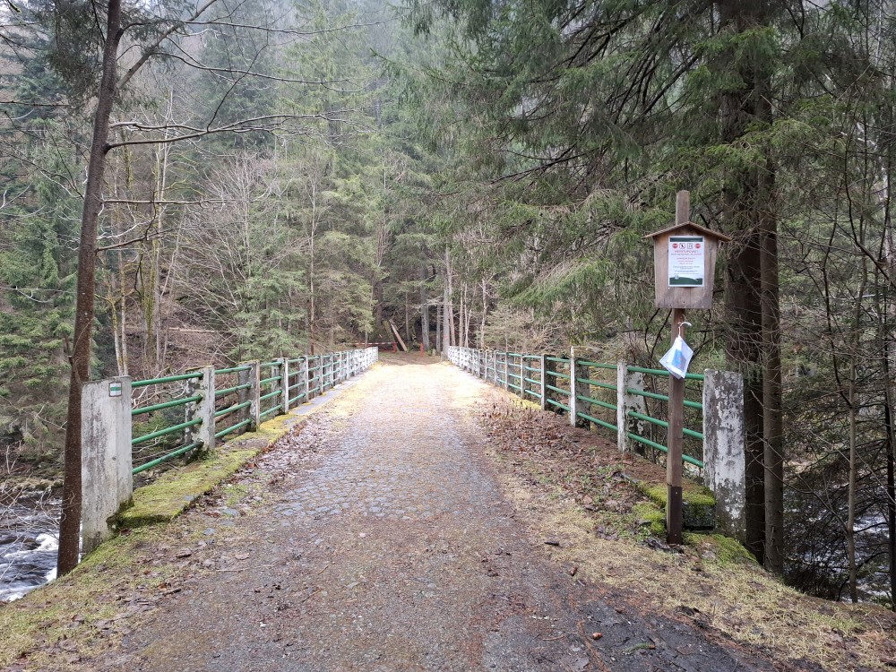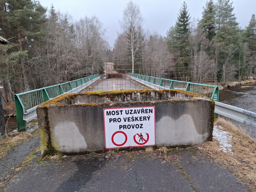 Pak jedeme na parkoviště na Velkém Boru a vyrážíme na výlet. Jdeme nejdříve mimo cesty přes louky a les. Pak se napojujeme na modrou turistickou značku u Mlýnského potoka. Jdeme k mostu přes Křemelnou. Most je kompletně uzavřen, protože je v havarijním stavu. Ale není to tak hrozné, abychom nemohli přejít. Přecházíme tedy na druhou stranu.