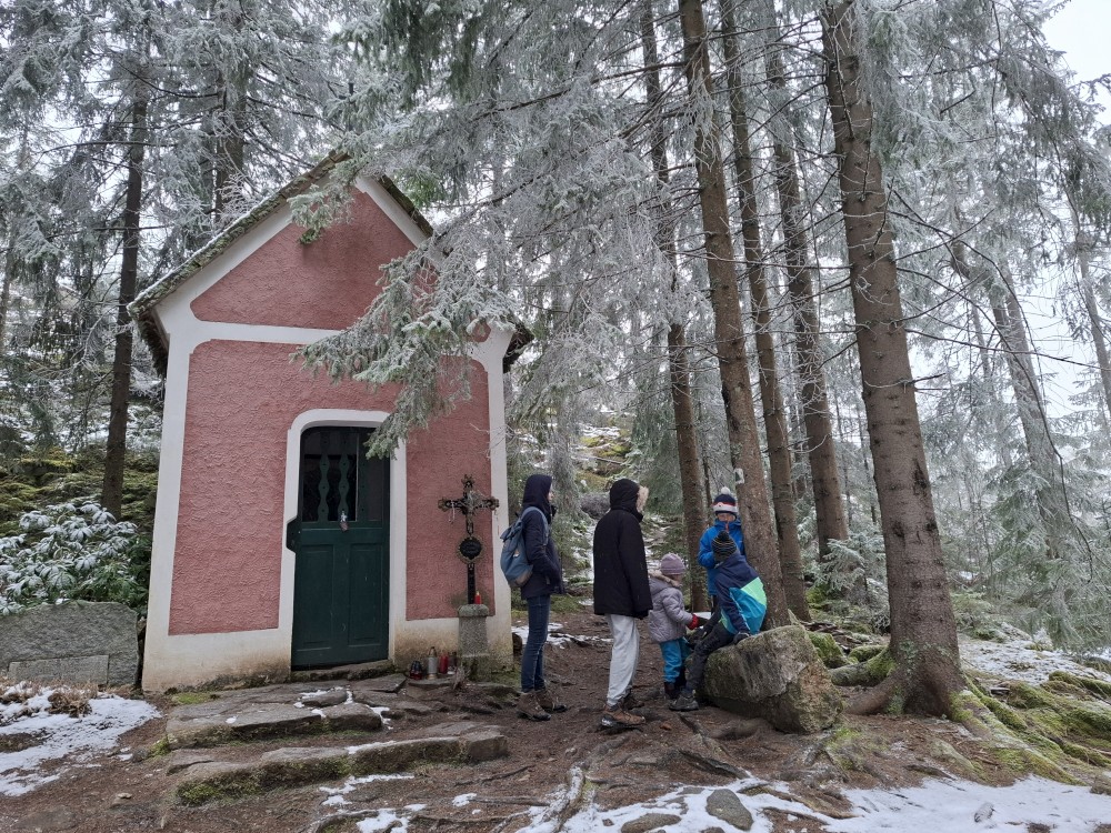 Dopoledne máme zase volnější. Na výlet vyrážíme před 12 hodinou. Jedeme do Dobré Vody. Tam necháváme auto. Díváme se do kostela Sv. Vintíře a pokračujeme po modré a pak zelené značce na Vintířovu skálu, Březník. Odtud klesáme k chatě Rovina, kde si dáváme oběd.