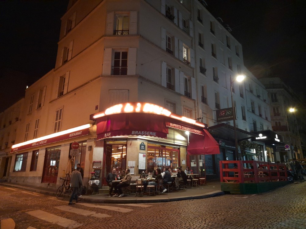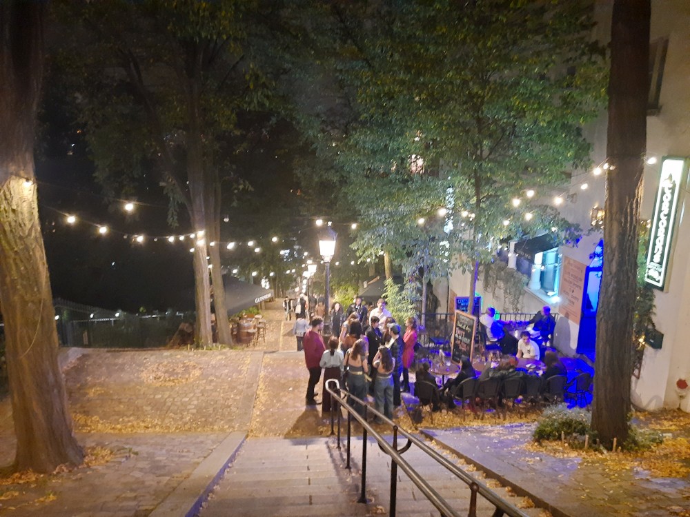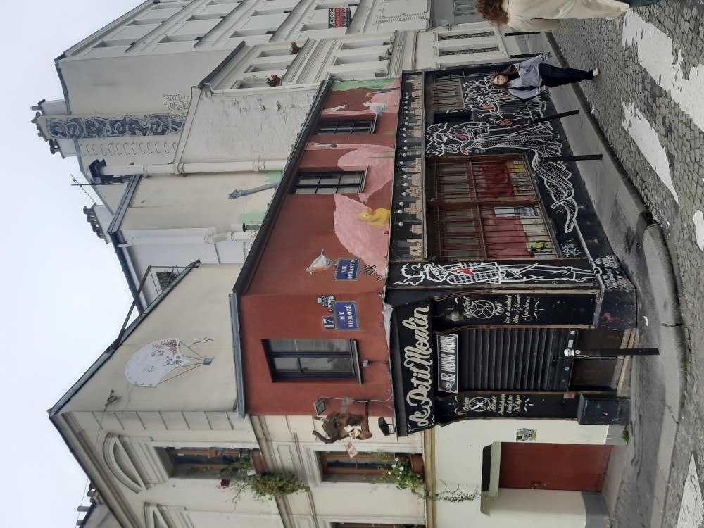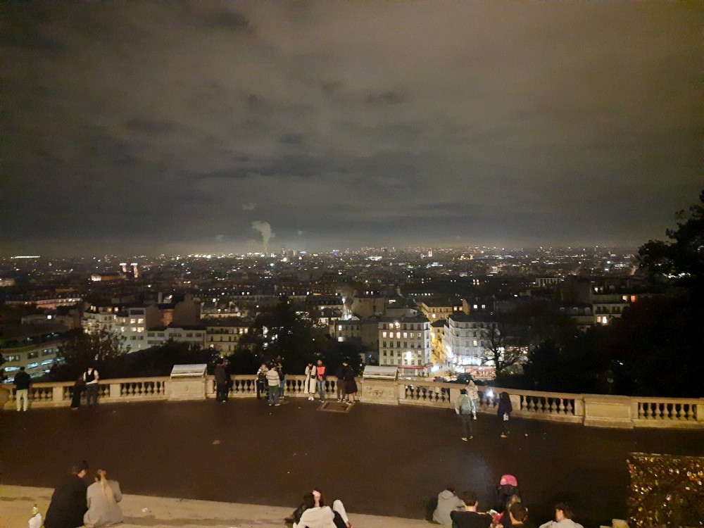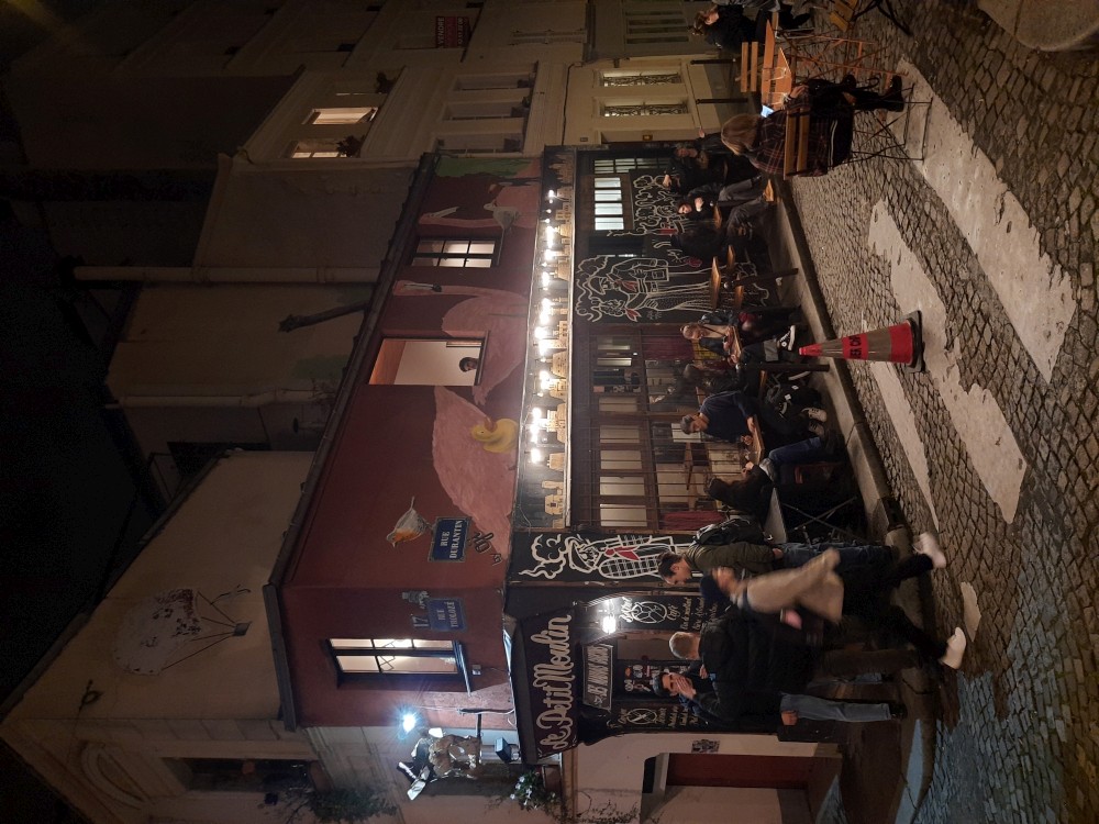 Na pokoji se dlouho nezdržíme, máme hlad, tak vyrážíme do města. Dáváme si rychlou večeři ve fast foodu. Pak jdeme na prohlídku Montmartru. Stoupáme po schodech kolem lanovky k Sacre Coeur. Jsou tu daleké výhledy na celou Paříž a také davy místní omladiny. Docela to tu žije. Pokračujeme uličkami Montmartru ke kavárna z filmu Amélie z Montmartru, která se jmenuje Café des 2 Moulins (Kavárna dvou mlýnů). Dáváme si zde víno.