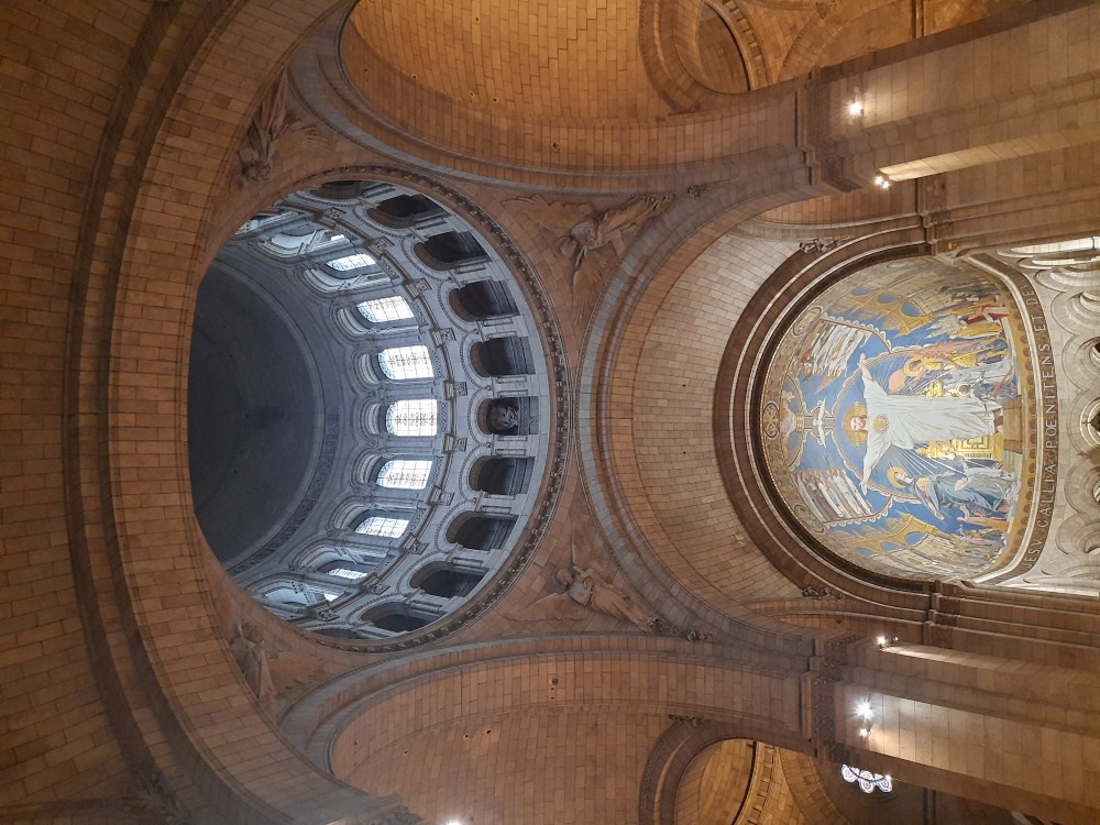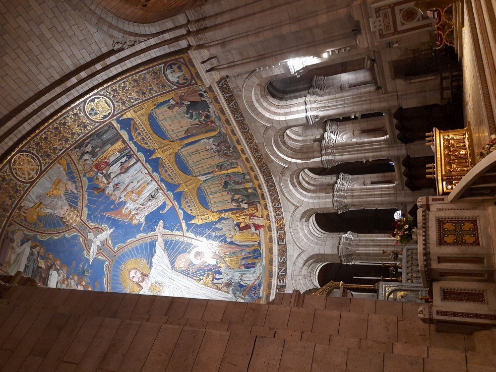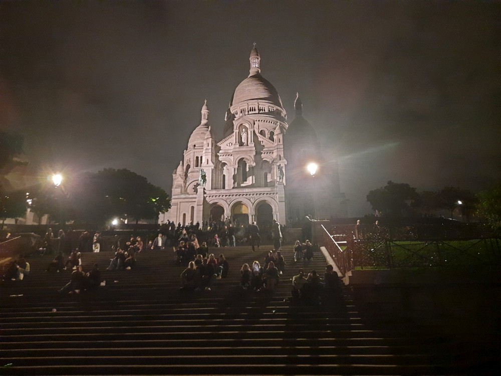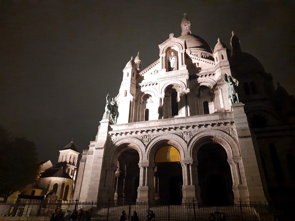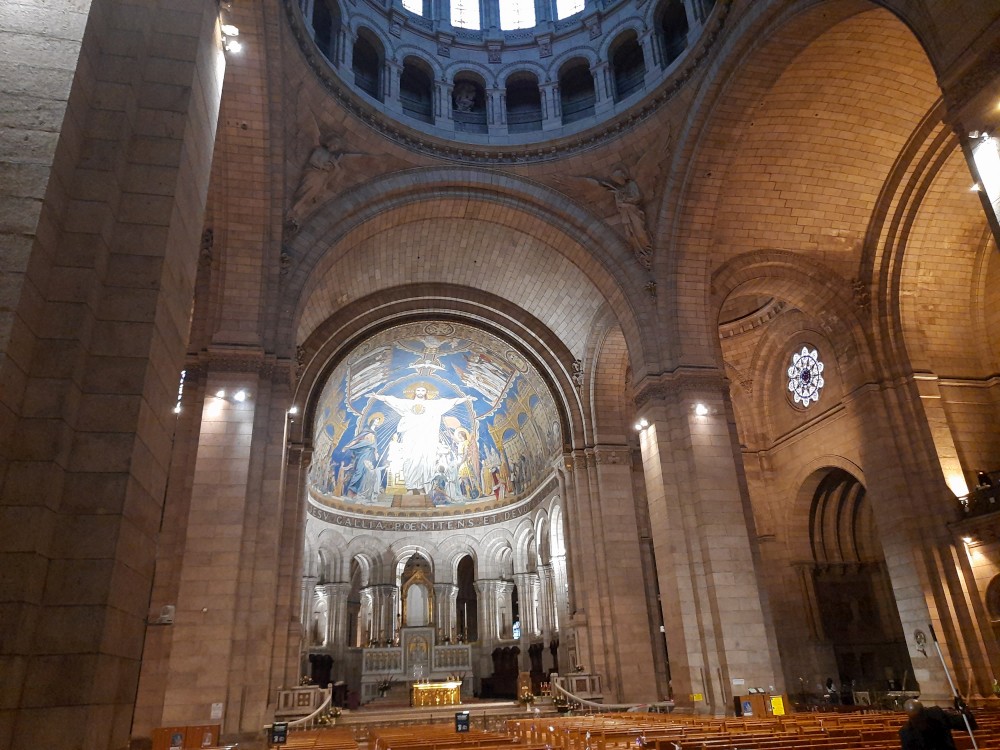 Chvlíli se rozhlížíme a pak už jdeme do baziliky Sacré-Cœur. Bazilika se tyčí na vrcholu kopce Montmartre a patří k nejvýraznějším dominantám Paříže. Byla postavena na přelomu 19. a 20. století jako symbol víry a národní jednoty. Je postavena z bílého travertinu. Interiér zdobí obří mozaika Krista.