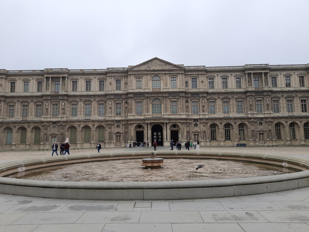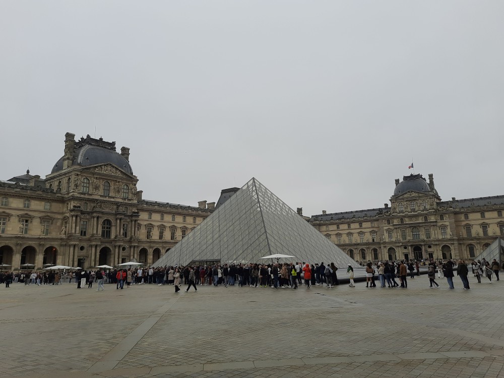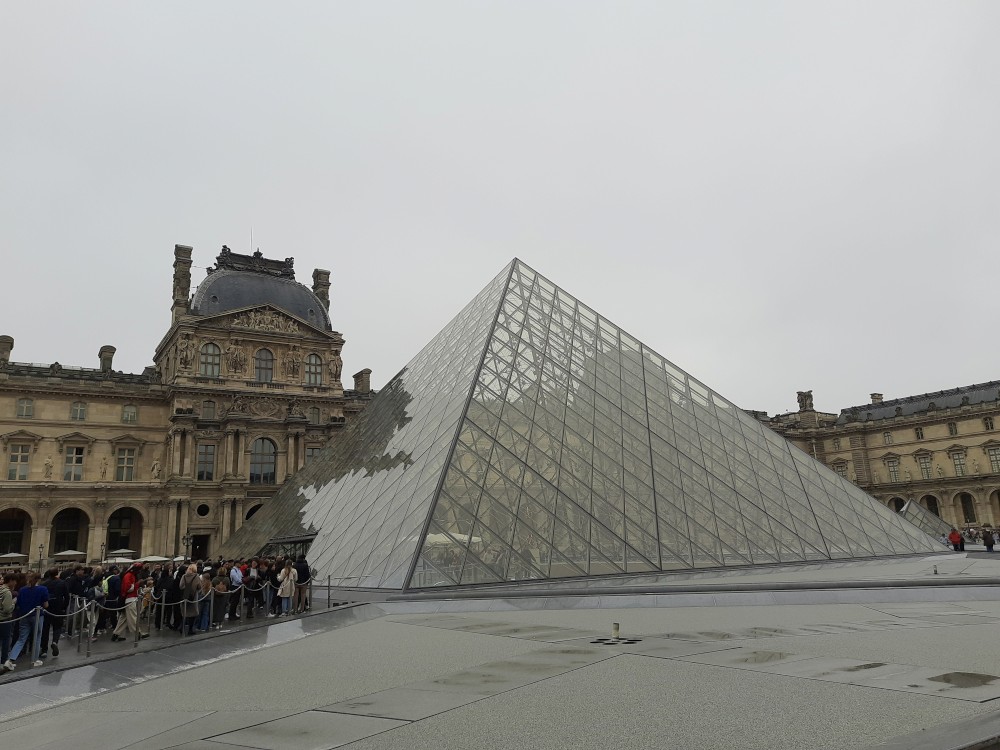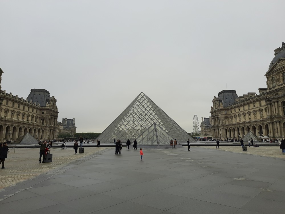 Také zde stojí velké ruské rolo. To už vstupujeme na nádvoří Louvru. Trochu prší a je hodně zataženo. Před místní skleněnou pyramidou se tvoří dlouhé fronty. My dnes dovnitř nepůjdeme. Opouštíme areál Louveru a jdeme se podívat k Seině na most Pont des Arts. Pak přes měnší nádvoří Louveru Cour Carrée jdeme na Place de Louvre, kde stojí kostel Saint-Germain-l'Auxerrois. Jdeme nahlédnout dovnitř.