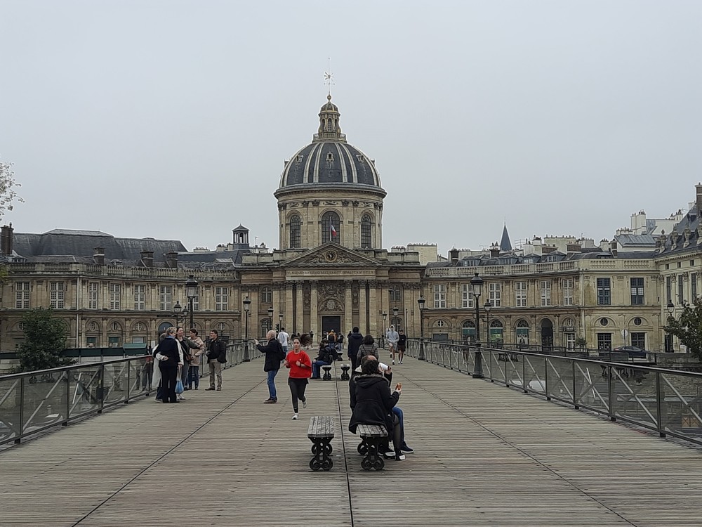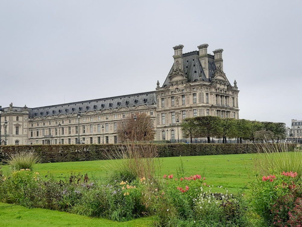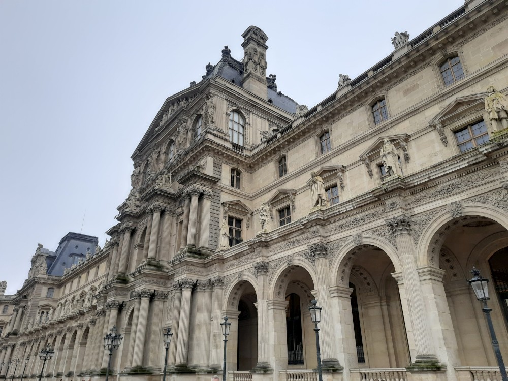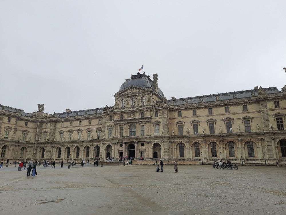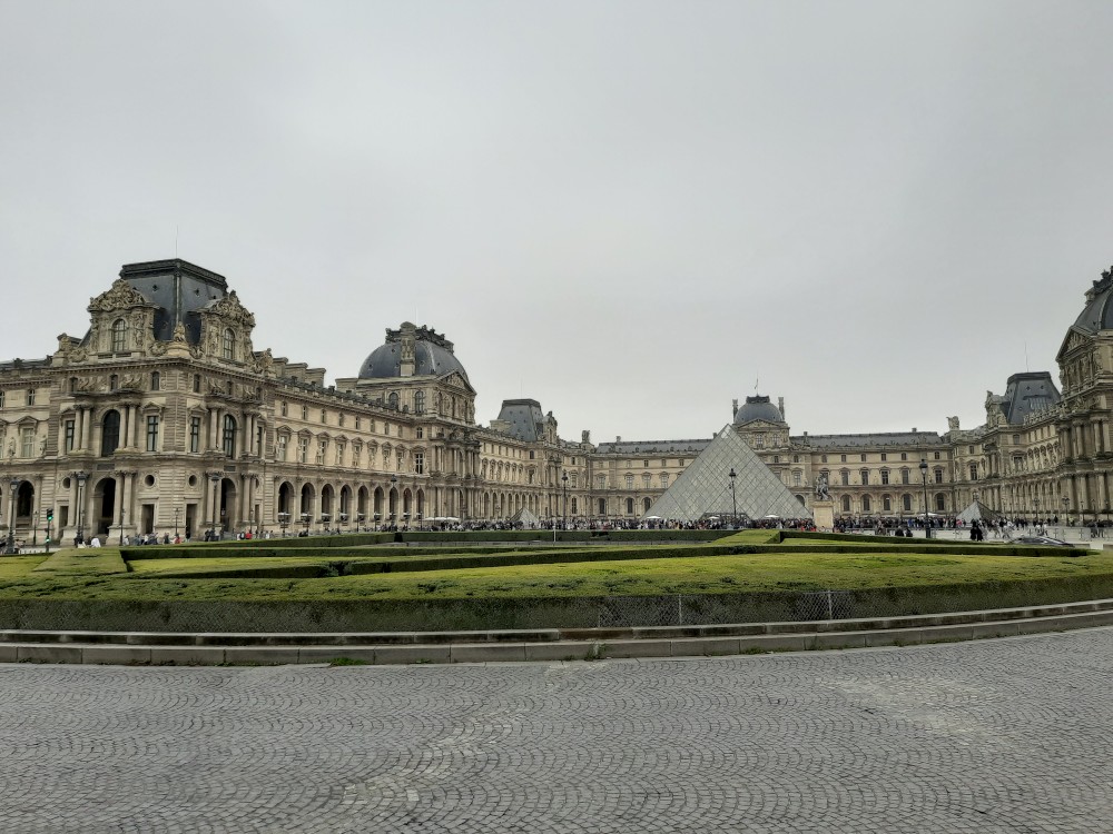 Také zde stojí velké ruské rolo. To už vstupujeme na nádvoří Louvru. Trochu prší a je hodně zataženo. Před místní skleněnou pyramidou se tvoří dlouhé fronty. My dnes dovnitř nepůjdeme. Opouštíme areál Louveru a jdeme se podívat k Seině na most Pont des Arts. Pak přes měnší nádvoří Louveru Cour Carrée jdeme na Place de Louvre, kde stojí kostel Saint-Germain-l'Auxerrois. Jdeme nahlédnout dovnitř.