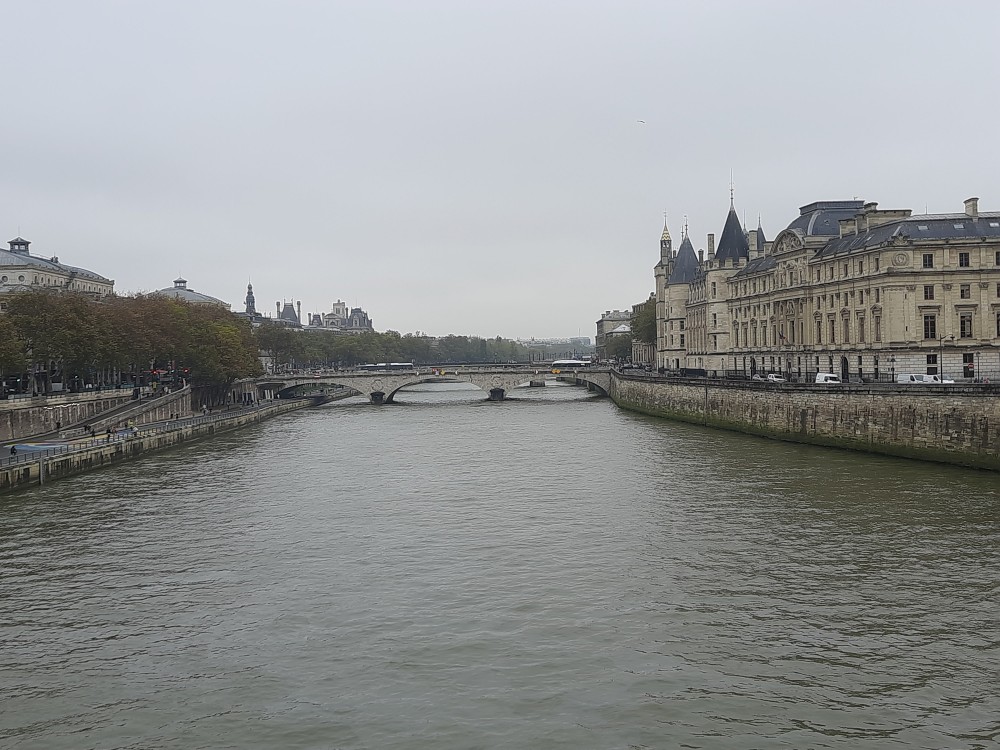 Po mostě Pont au Change přecházíme na ostrov Ille de la Cité. Jdeme kolem pouličních hodin Tour de l'Horloge, takového malého orloje a kolem kaple Sainte-Chapelle. I zde jsou dlouhé fronty na vstup do kaple a nám se zde nechce čekat.