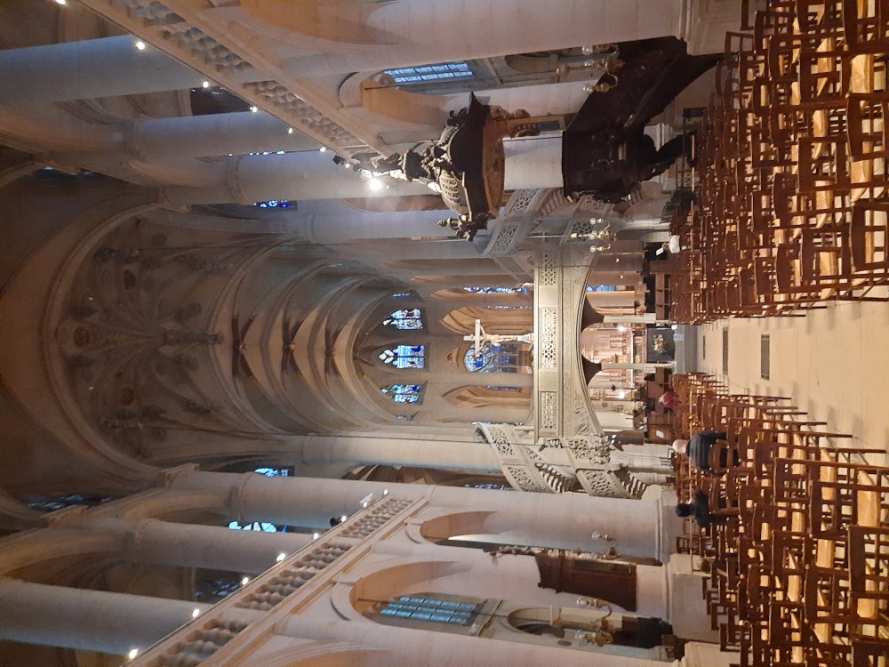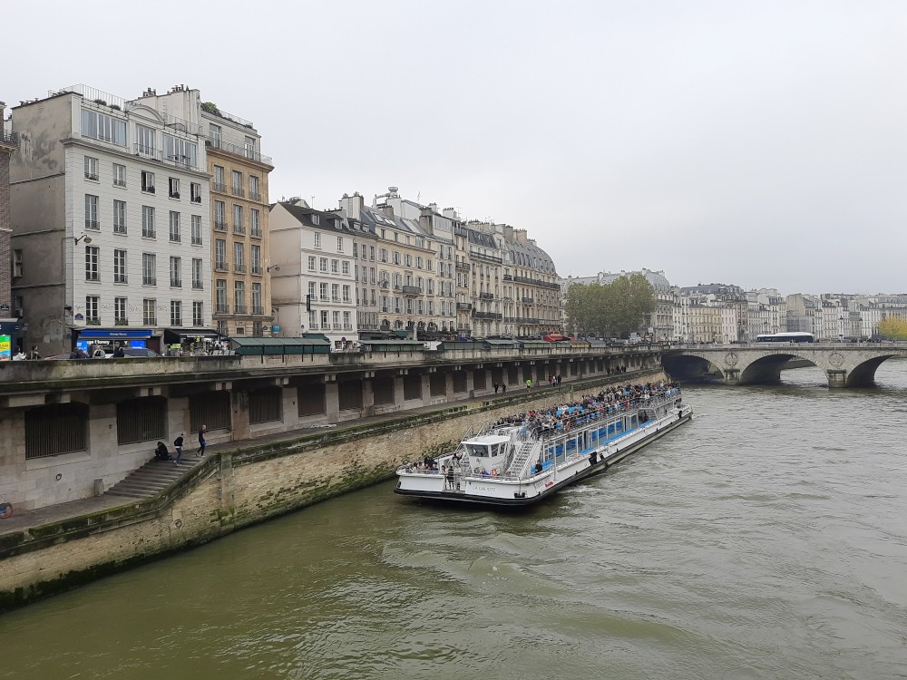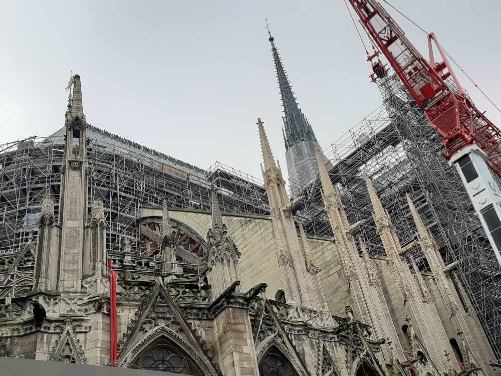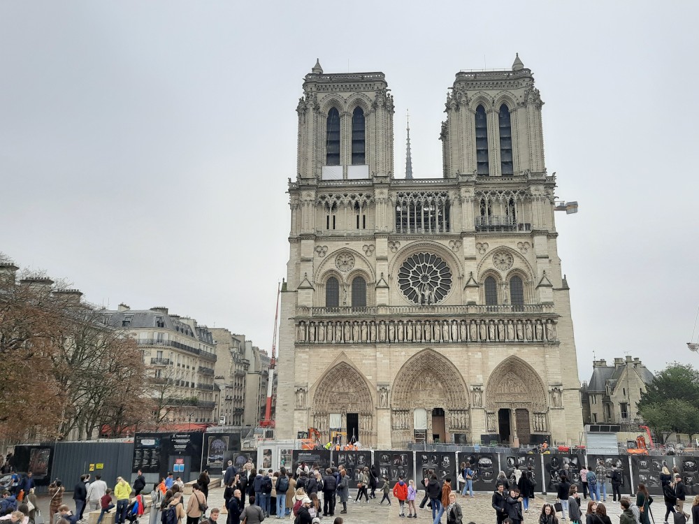 Pokračujeme přes most Pont Saint-Michel k fontáně Saint-Michel. Pak se přes most Petit-Pont vracíme na Ille de la Cité k Notre-Dame. Notre-Dame de Paris je slavná gotická katedrála. Stavěla se od 12. do 14. století a proslula svými rozety, fiálami i chrliči. Proslavil ji i román Victora Huga. Nyní ji po požáru v roce 2019 opravují. Sedíme chvíli na vystavěném dřevěném pódiu před katedrálou. Pak kolem katedrály pokračujeme k postu Pont Saint-Louis.