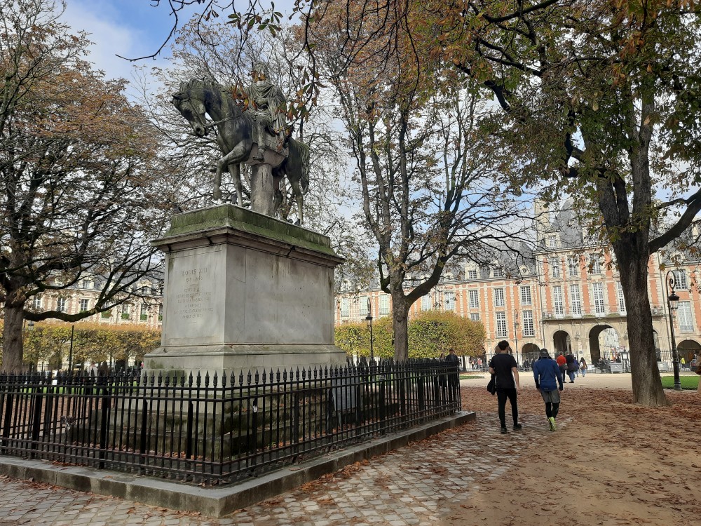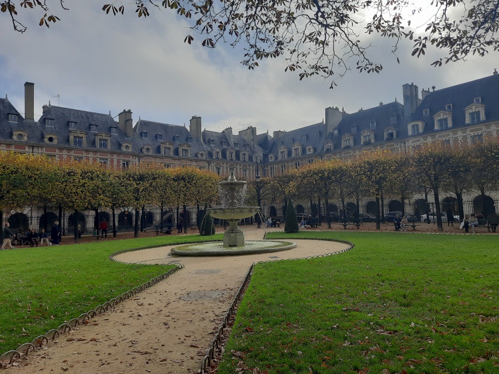 Place des Vosges je nejstarší pařížské náměstí, založené na počátku 17. století za vlády Jindřicha IV. Je dokonale symetrické, lemované elegantními arkádami a cihlovými paláci s břidlicovými střechami. Uprostřed se nachází park Square Louis-XIII se sochou krále, fontánami a lavičkami.