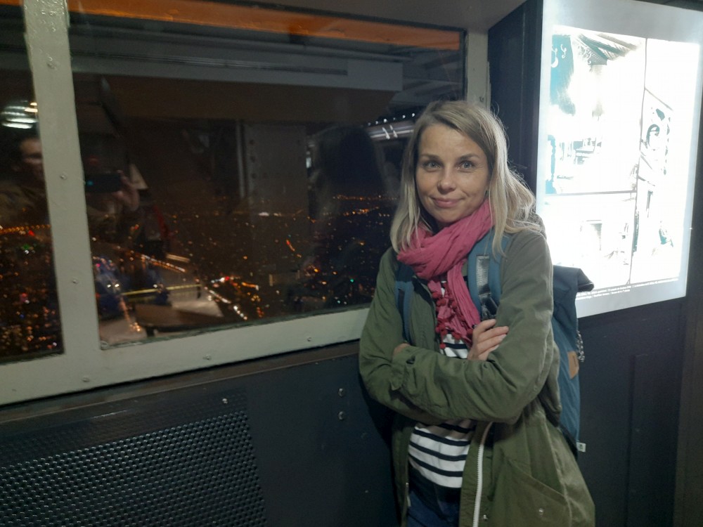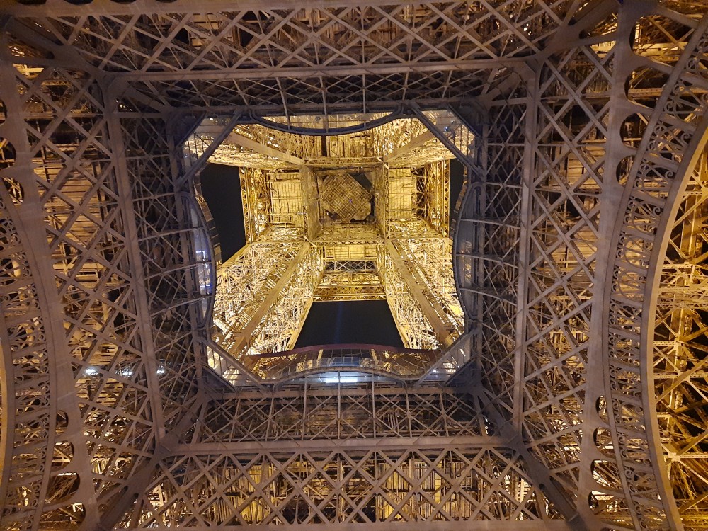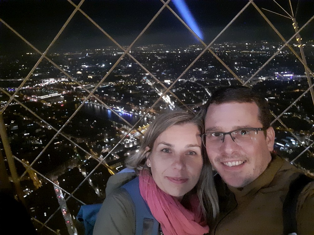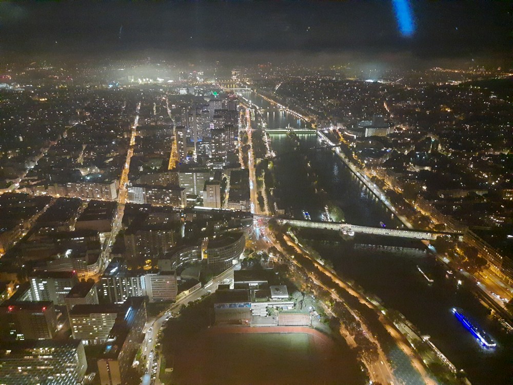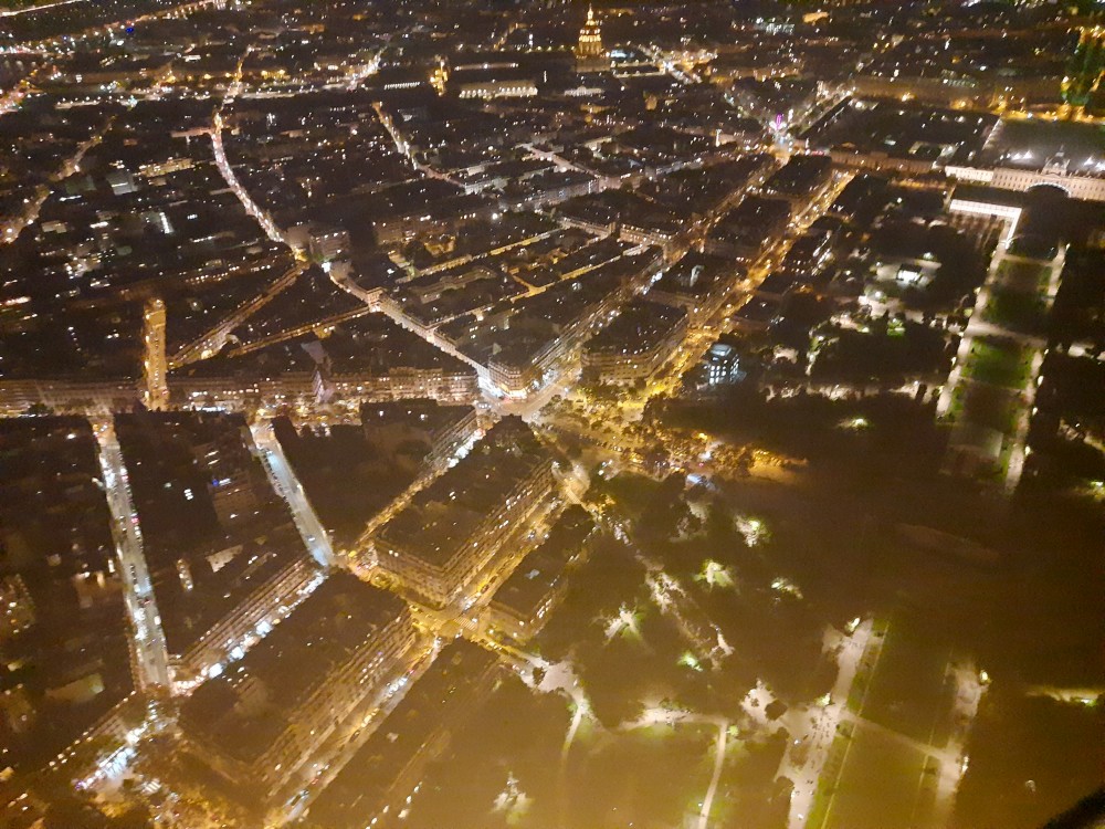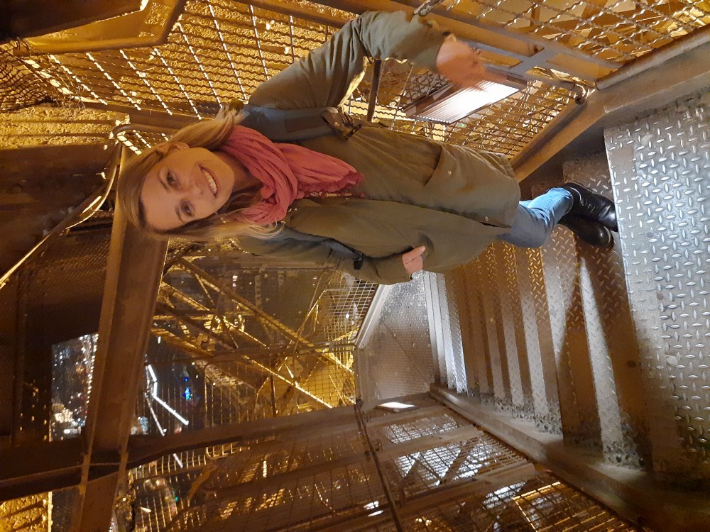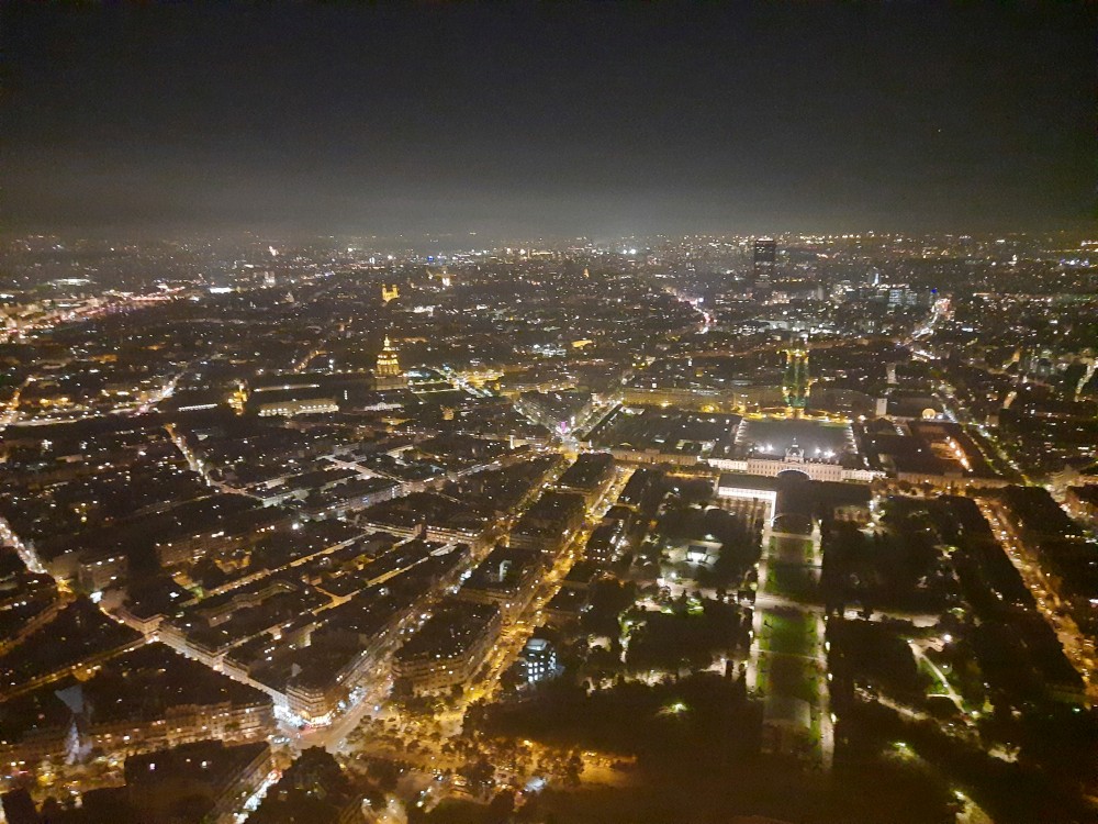 Na lístky čekáme necelou hodinu, to není tak zlé. Do prvního patra jedeme po schodech, pak na vrchol věže jedeme výtahem. Jsme opravdu vysoko, všechno pod náma je hrozně maličké. V pravidelných intervalech se věž rozbliká. Na vrcholku je pracovna Eiffela i s jeho figurinou. Z vrcholku zase jedeme výtahem do prvního patra a odtud jdeme zase pěšky.