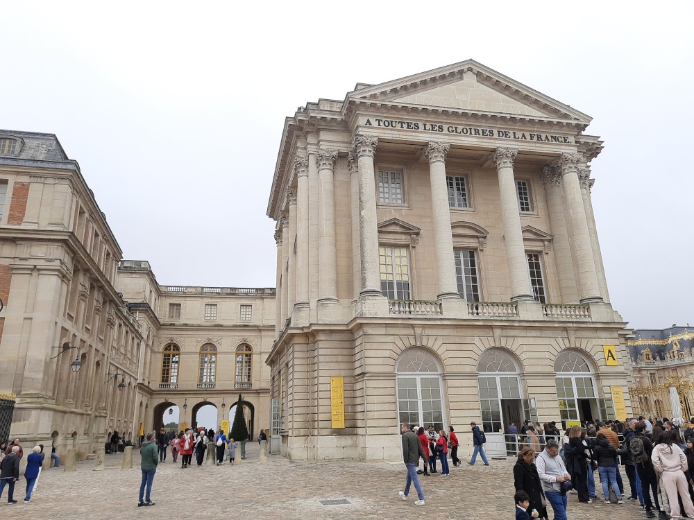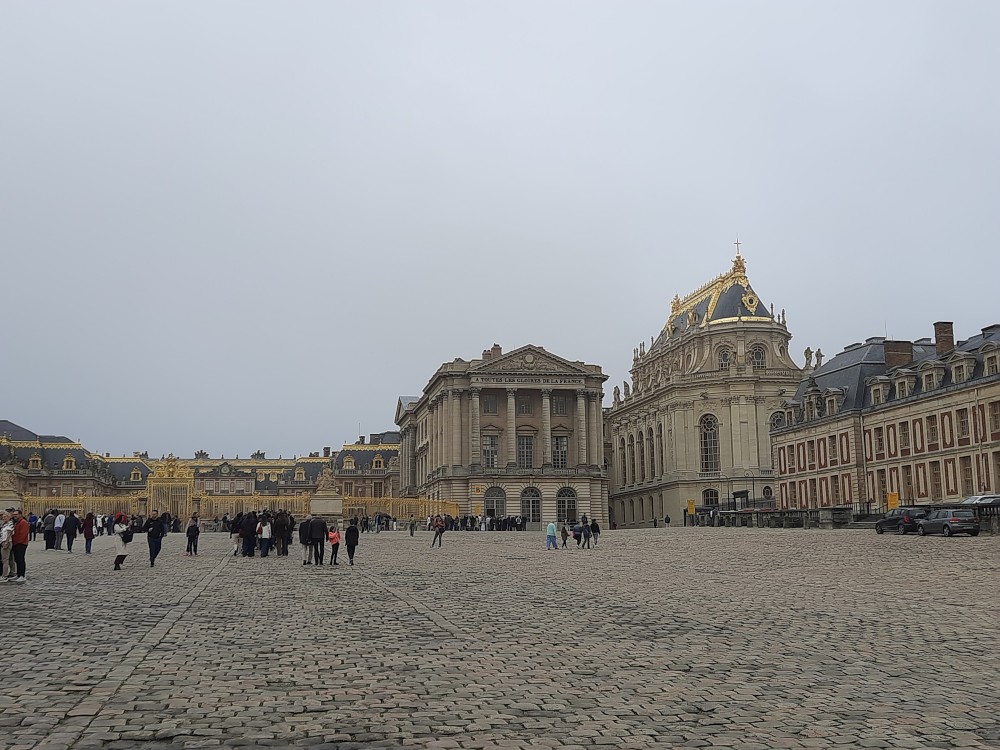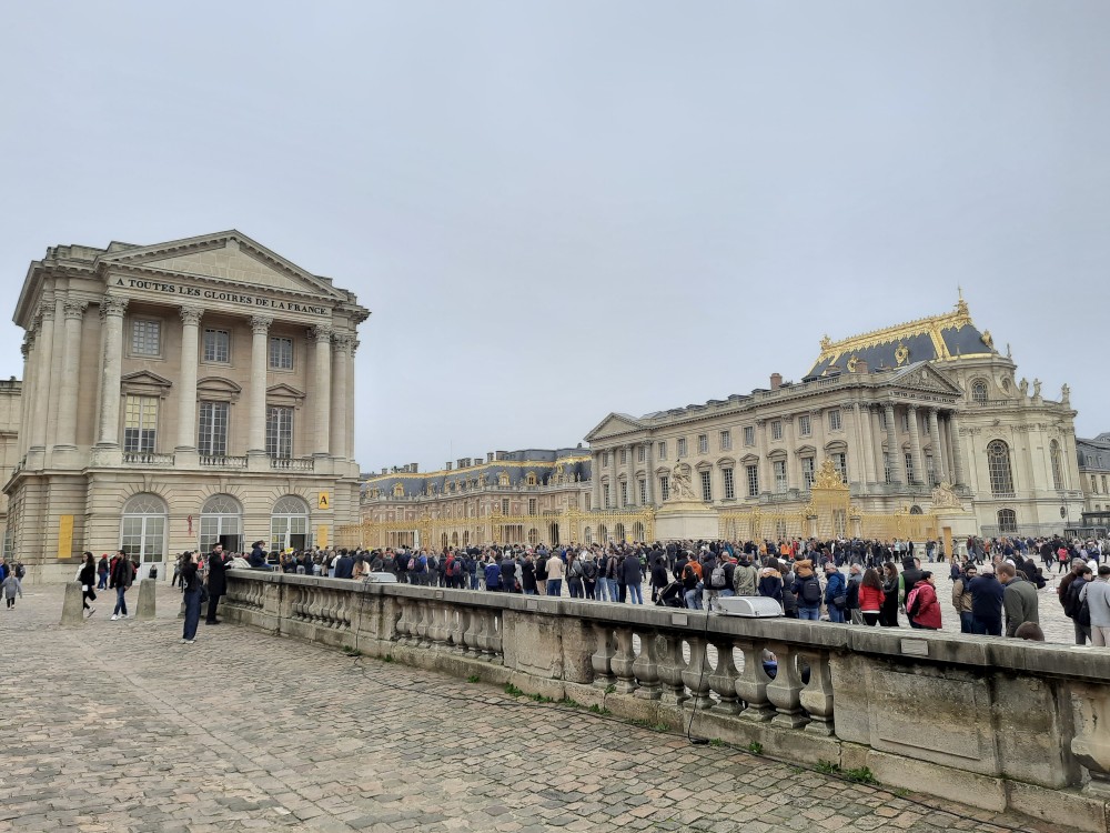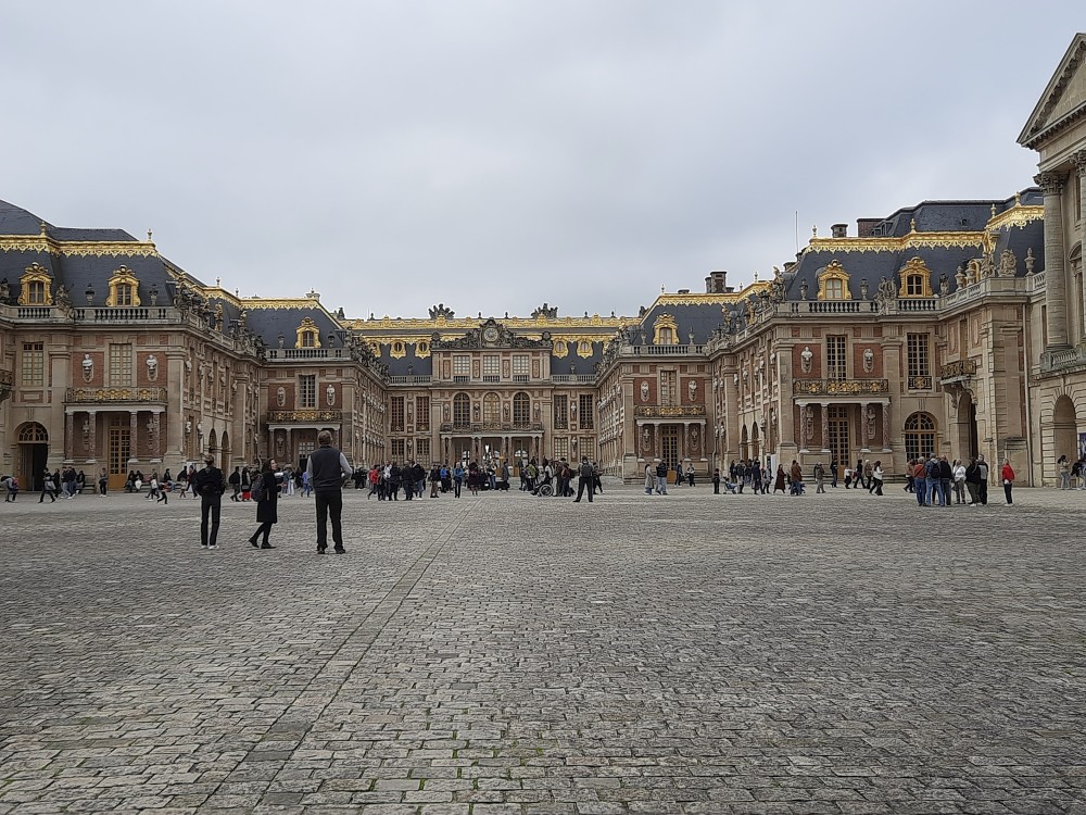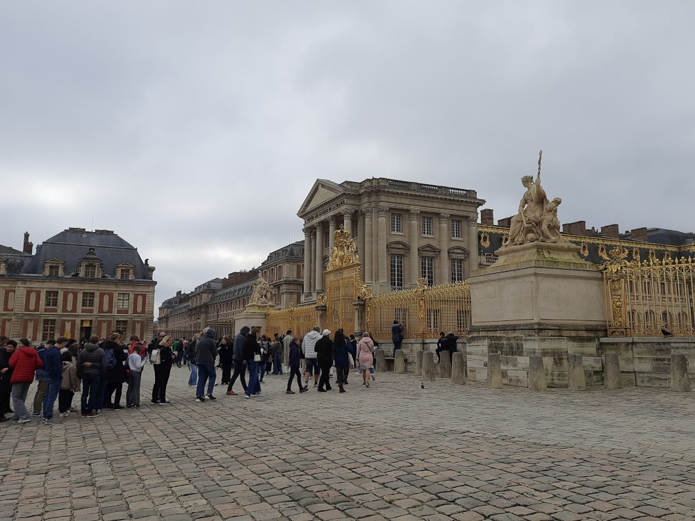 Ráno po snídani sedáme na metro, jedeme na Invalidovnu a tam přesedáme na vlak a jedeme do Versailles. Přijíždíme na nádraží Versailles Château Rive Gauche. Odtud jdeme k zámku pěšky. Před zámkem je obří náměstí Place d'Armes. Je zde velká spousta autobusů s turisty.