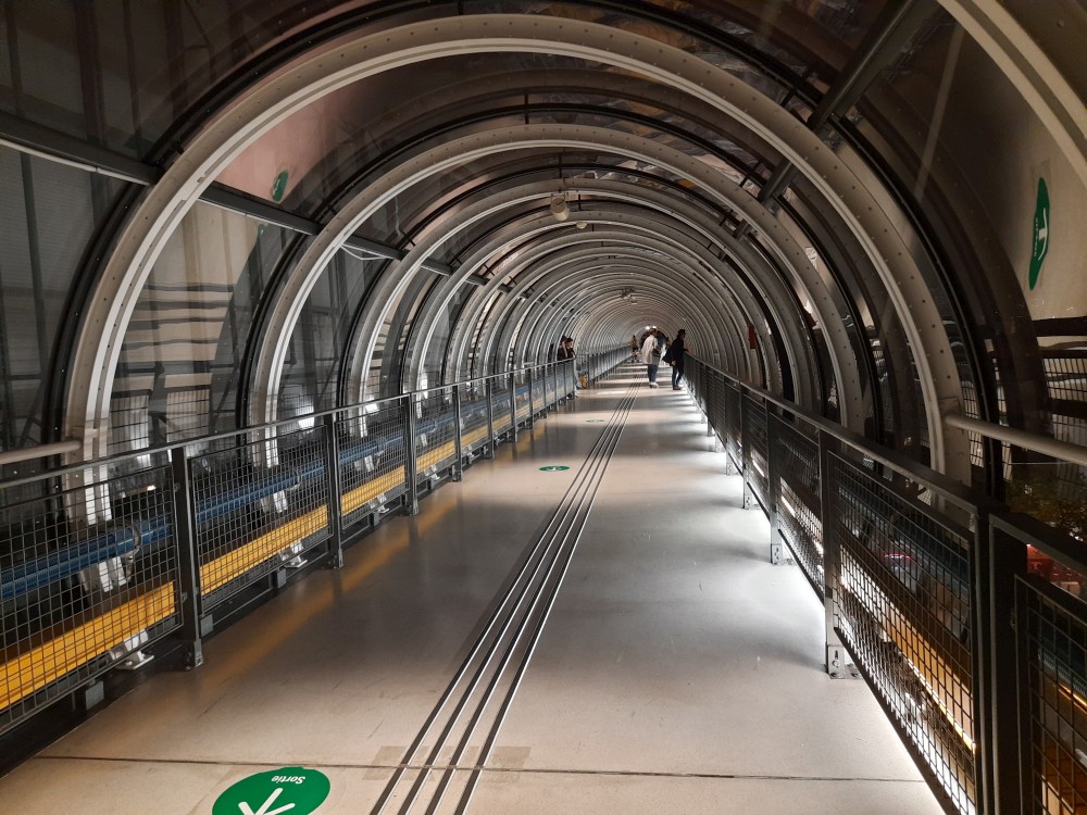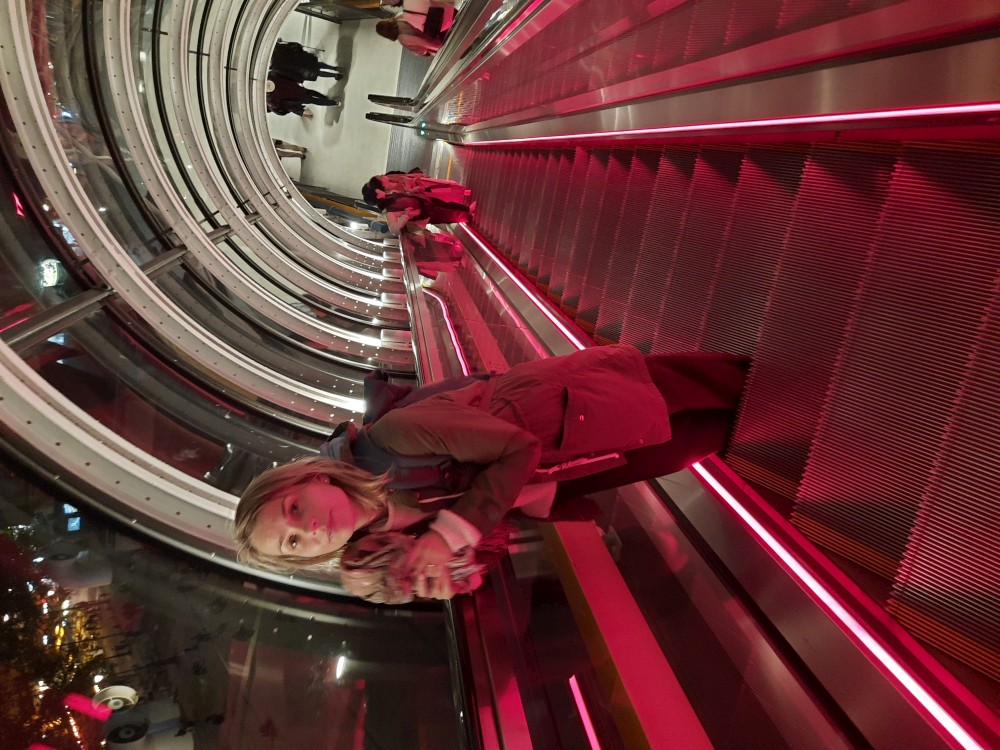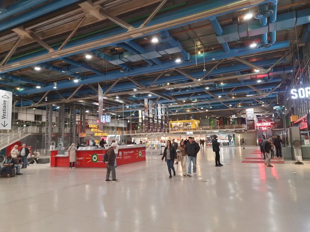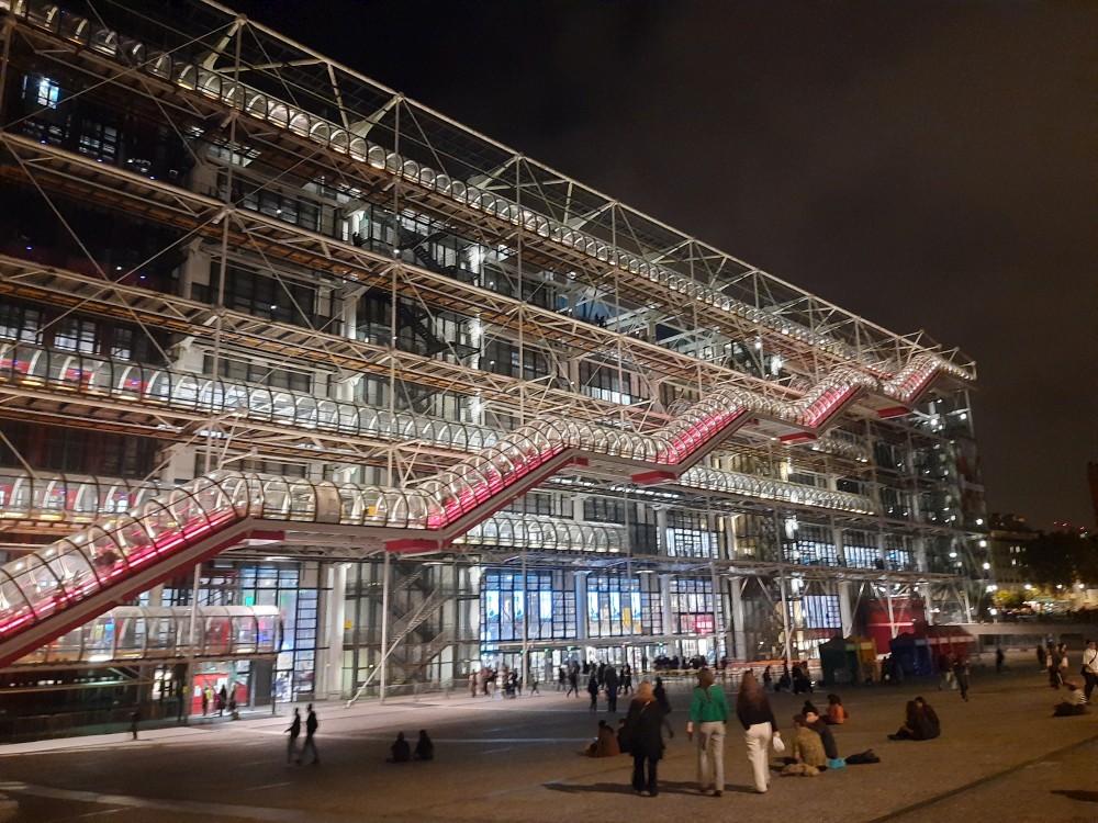 Už je tma, budova barevně svítí. Centre Georges Pompidou je moderní kulturní centrum, známé svou netradiční architekturou s barevnými trubkami a technickými prvky na fasádě. Sídlí zde Národní muzeum moderního umění, jedna z největších sbírek současného umění v Evropě. Jdeme dovnitř a jedeme po eskalátorech umístěných v barevných trubkách před fasádou až nahoru na výhledy na město. Na sbírky se podívat nejdeme.