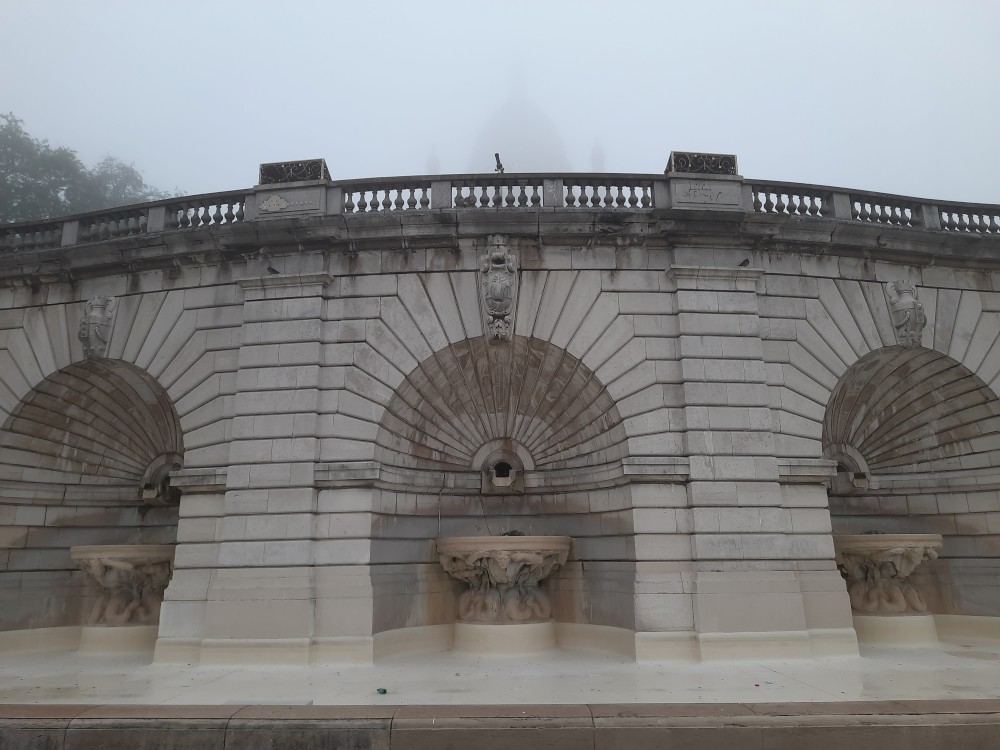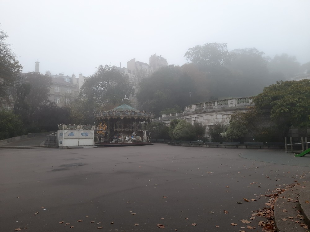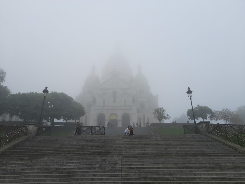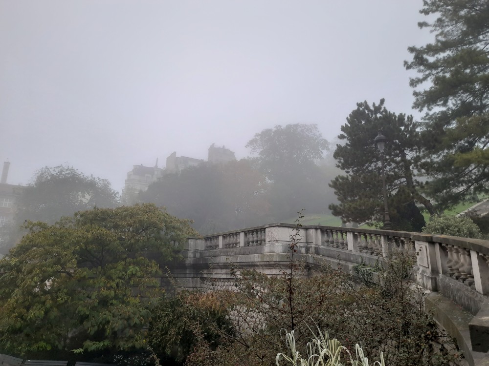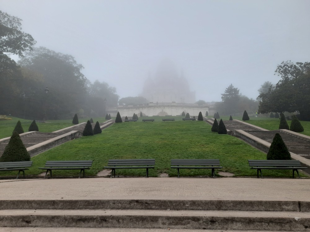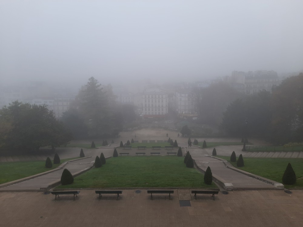 Dnes letíme domů a již dopoledne musíme vyrazit na letiště. Už tedy nepojedeme do města, ale po snídani se jdeme za světla projít na Montmartre. Jdeme se podívat do zahrad Louise-Michel, které zrovna otevírají, takže jsme dnes první návštěvníci. Stopáme po schodech zadradou k Sacre Coeur, který se nad námi halí v mlze. Prší.