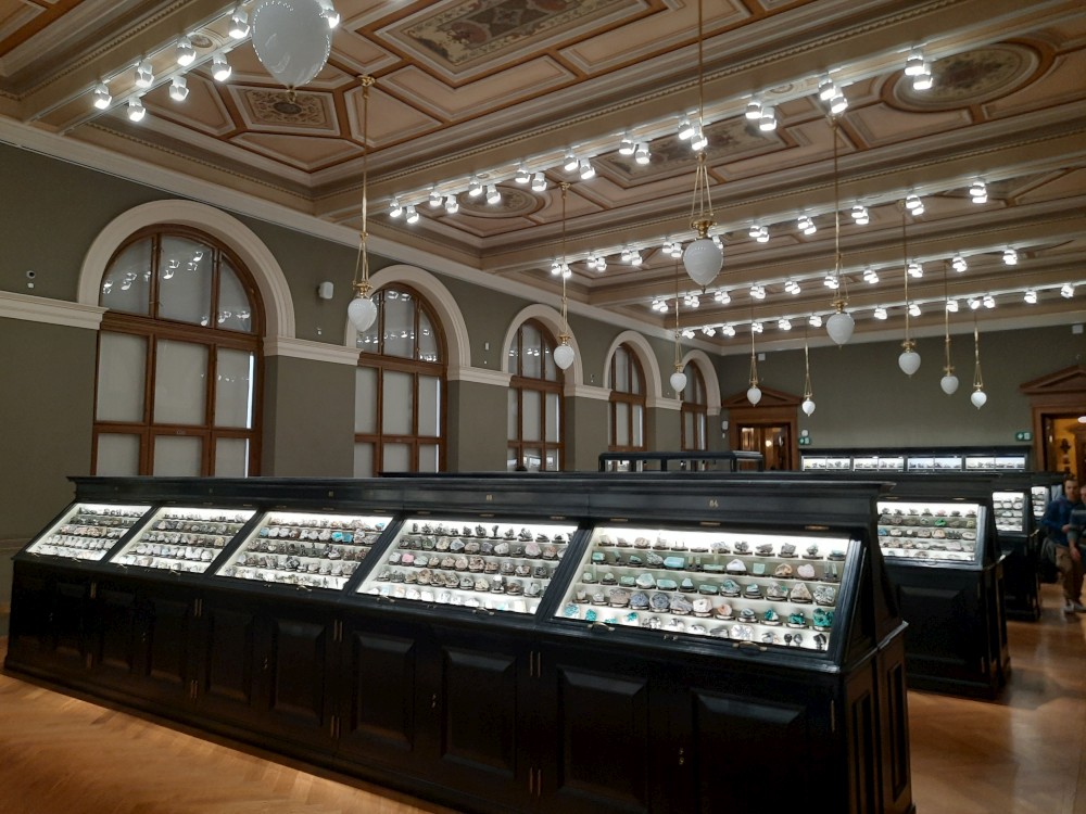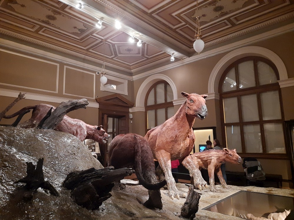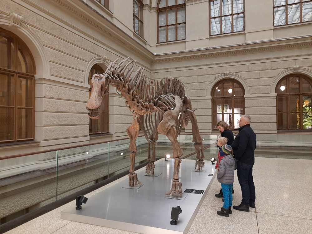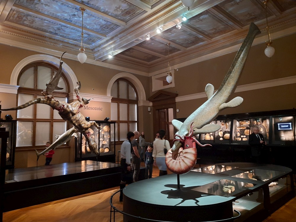 Postupně procházíme prakticky celé muzeum. Je zde expozice "Okna do pravěku". Jsou zde exponáty od malých zkamenělých larev trilobitů až po obřího amonita a modely pravěkých zvířat v životní velikosti. Další expozicí je "Zázraky evoluce" s kostrou plejtváka myšoka.