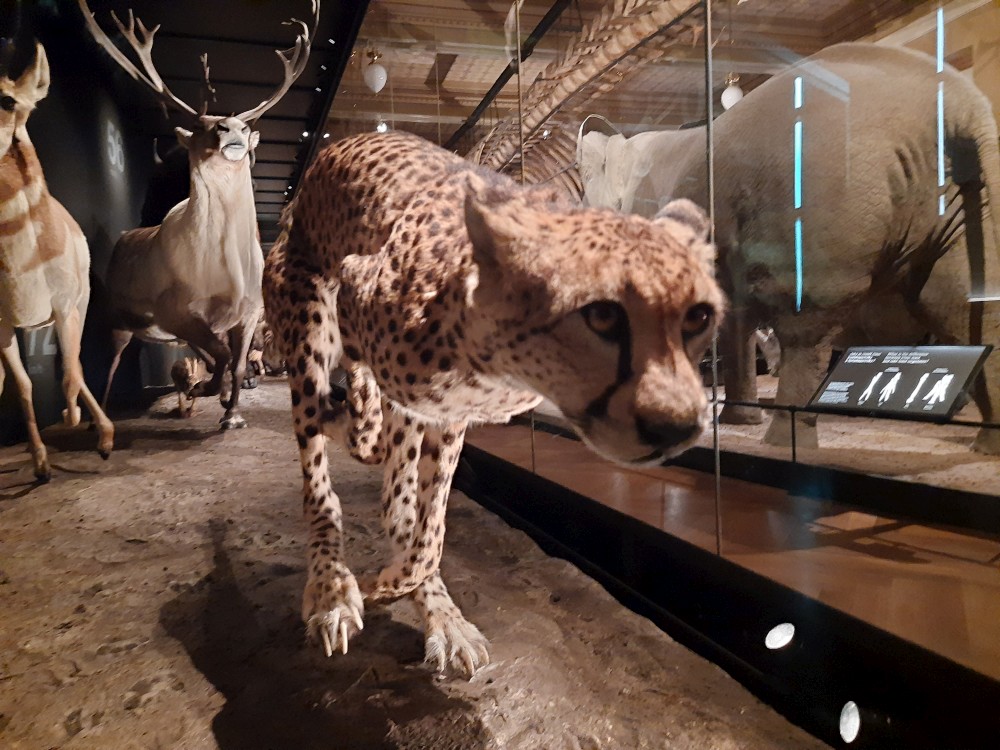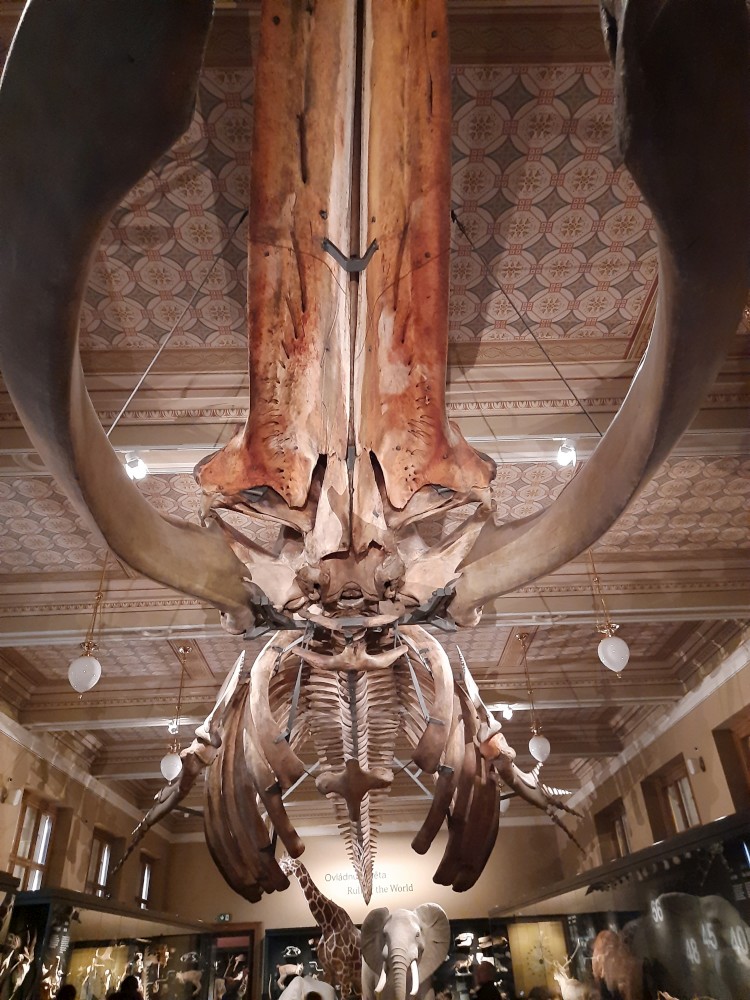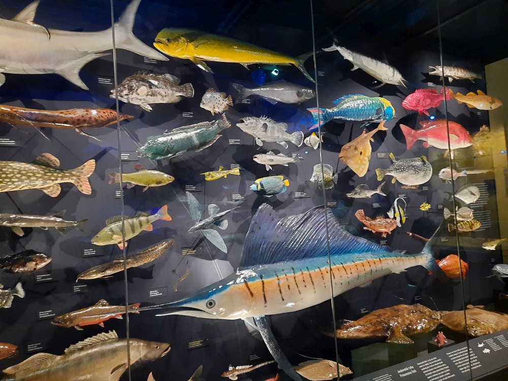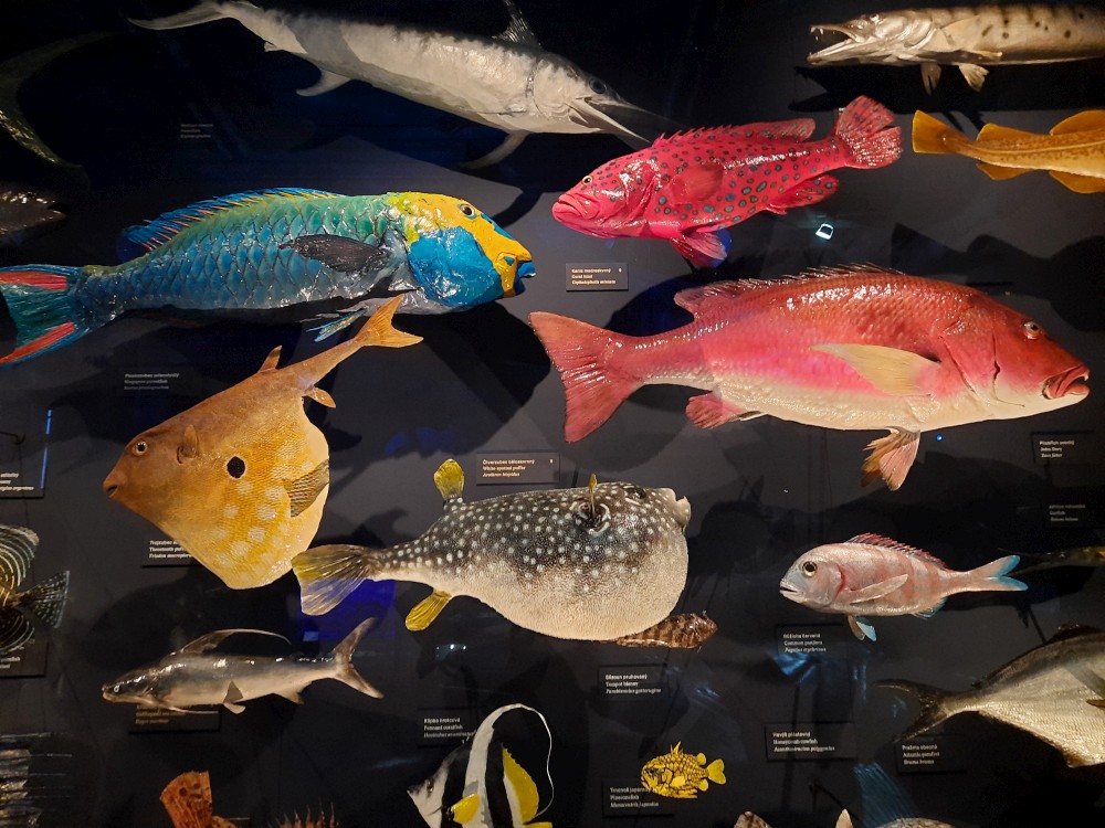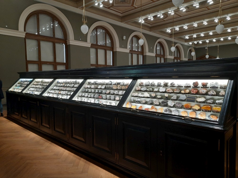 Postupně procházíme prakticky celé muzeum. Je zde expozice "Okna do pravěku". Jsou zde exponáty od malých zkamenělých larev trilobitů až po obřího amonita a modely pravěkých zvířat v životní velikosti. Další expozicí je "Zázraky evoluce" s kostrou plejtváka myšoka.
