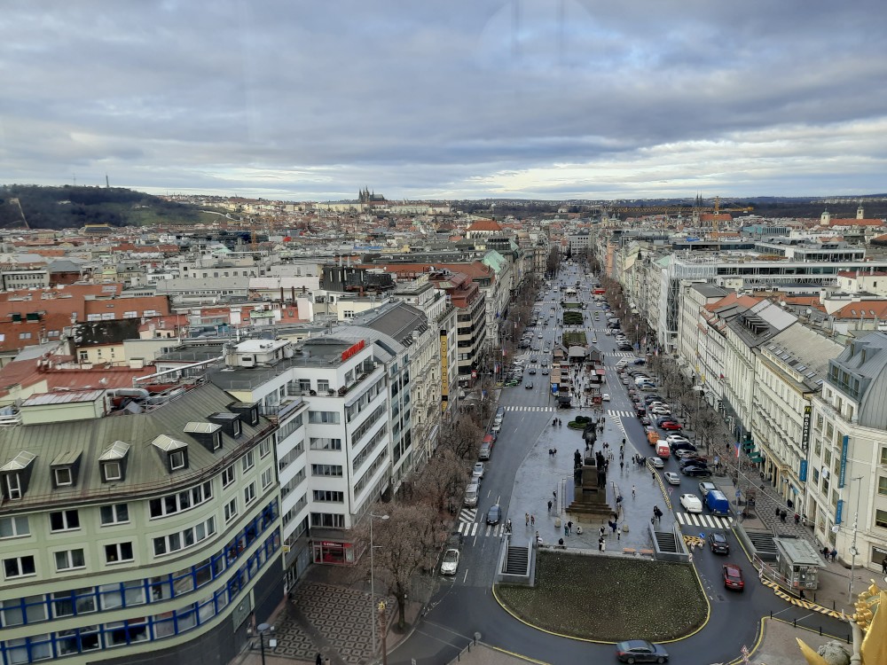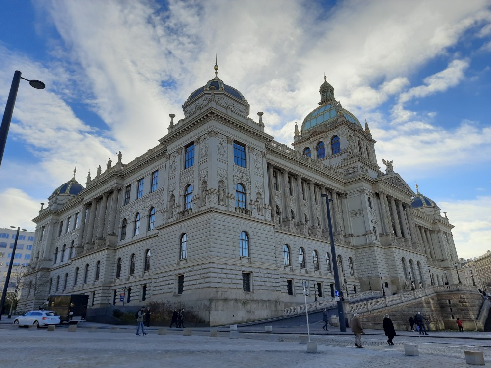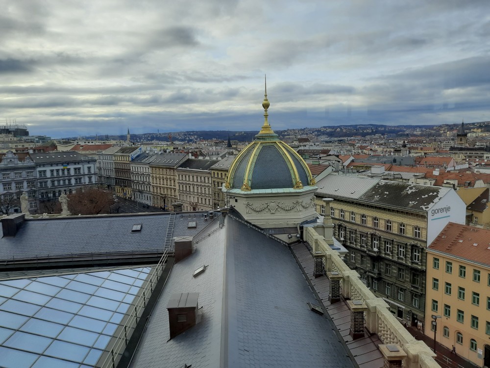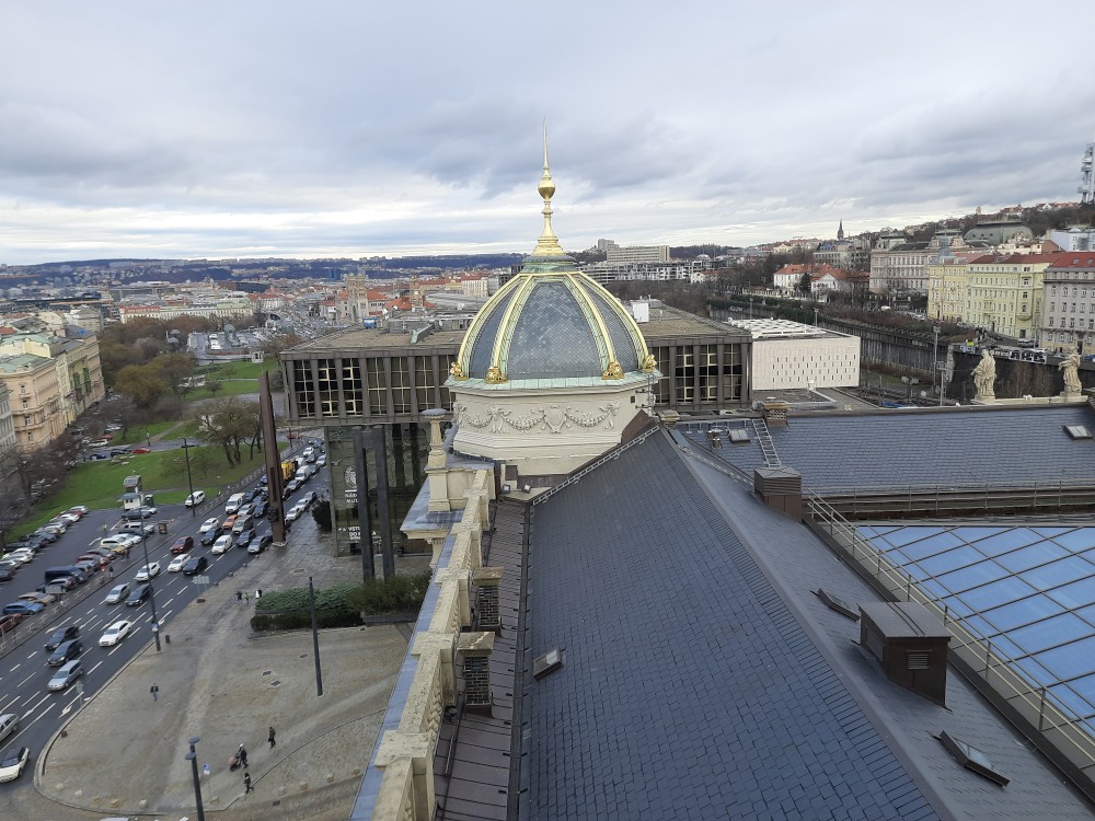 Jdeme se také podívat do hlavní kupole muzea, která nabízí výhled na Prahu. V historické budově muzea také dáváme občerstvení. Pak procházíme tunelem do nové budovy Národního muzea. V tunelu je videoexpozice "Momenty dějin". V nové budově muzea je ještě expozice 20.století, ale tam již nejdeme.