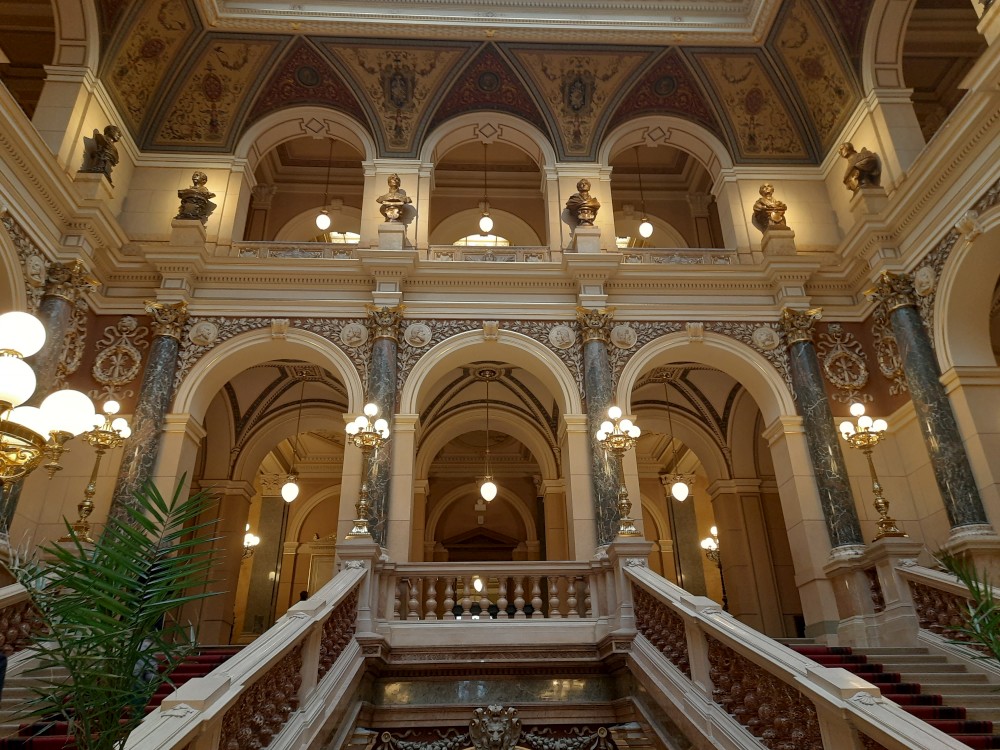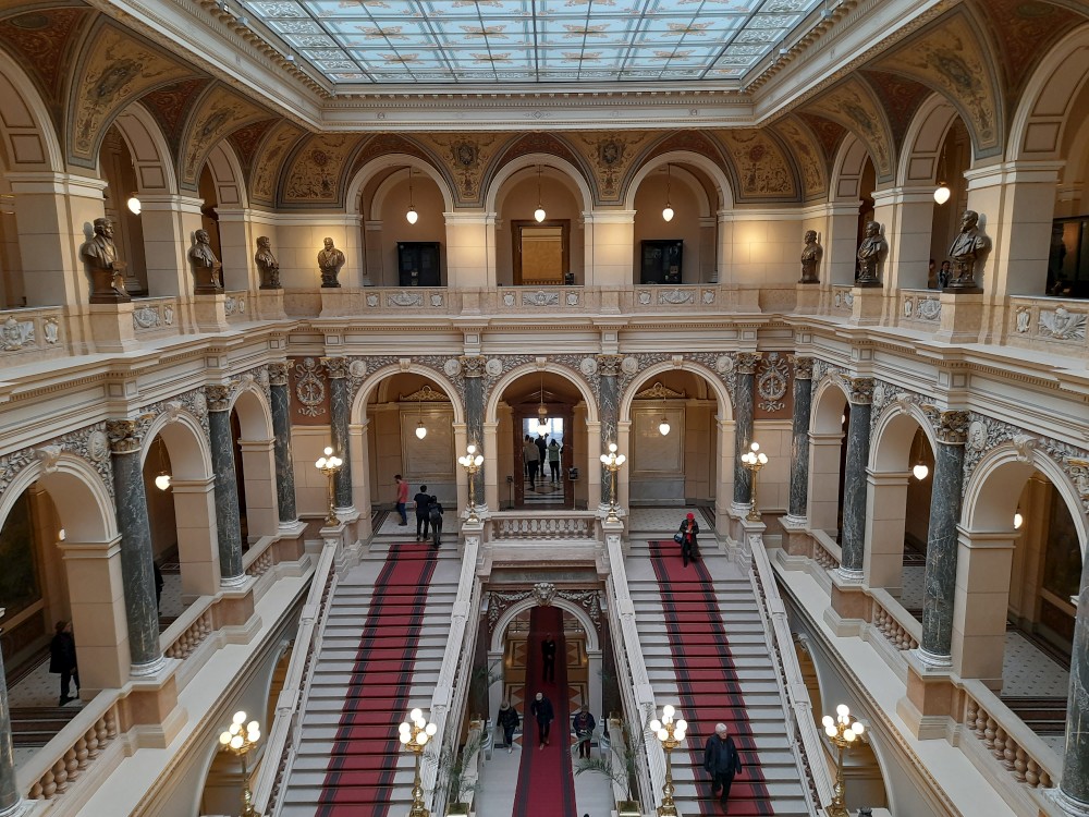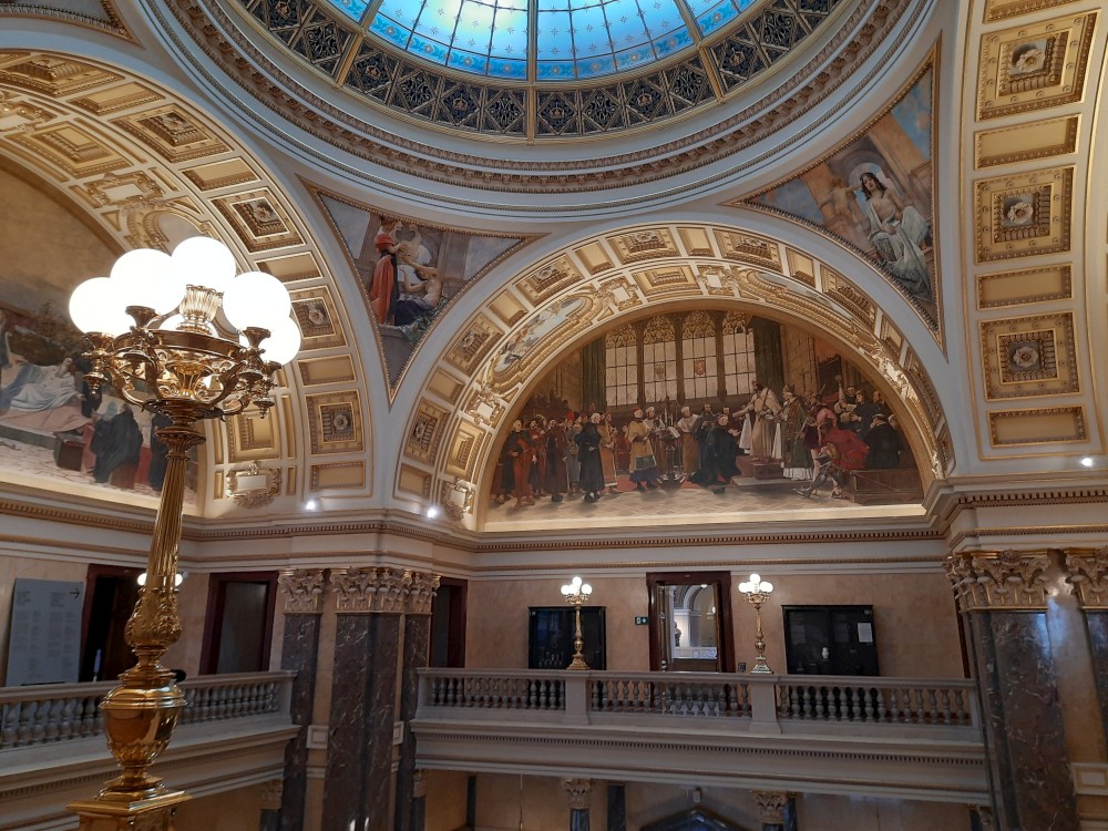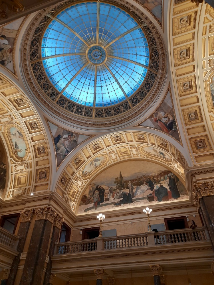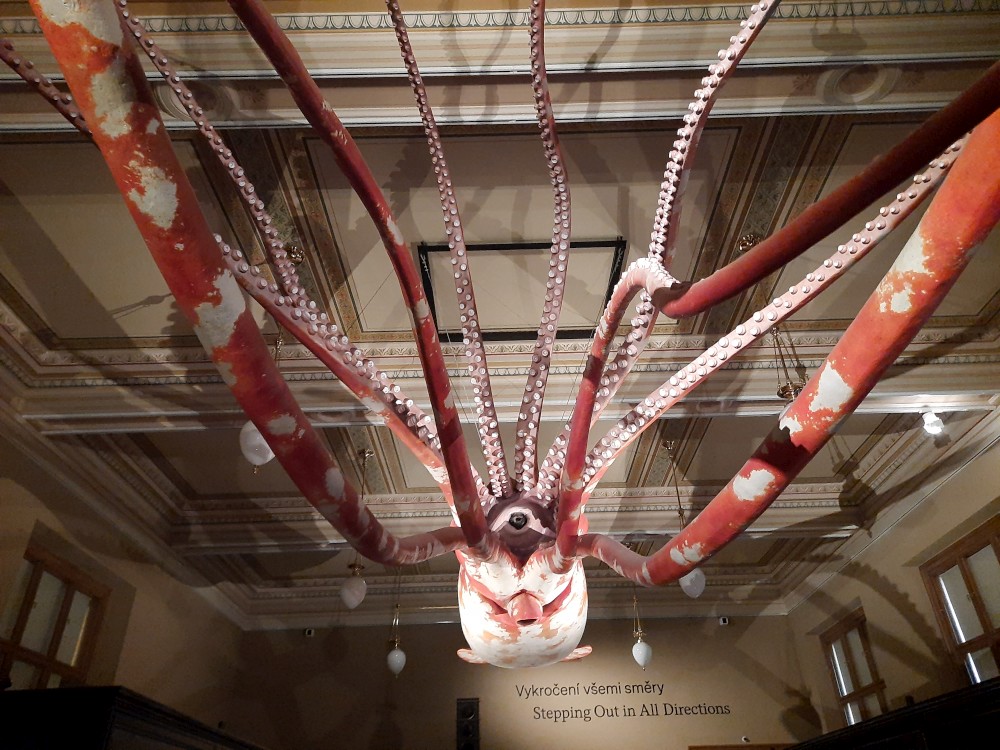 Jdeme se také podívat do hlavní kupole muzea, která nabízí výhled na Prahu. V historické budově muzea také dáváme občerstvení. Pak procházíme tunelem do nové budovy Národního muzea. V tunelu je videoexpozice "Momenty dějin". V nové budově muzea je ještě expozice 20.století, ale tam již nejdeme.