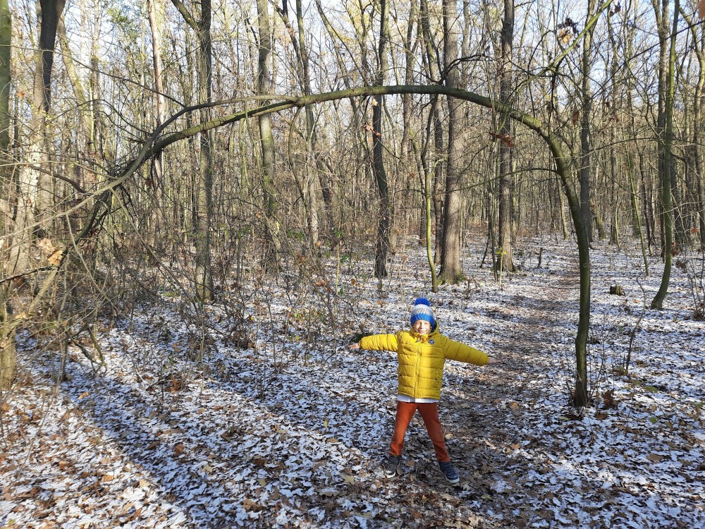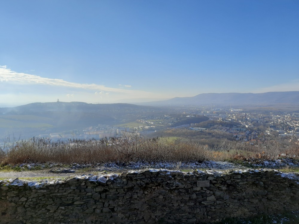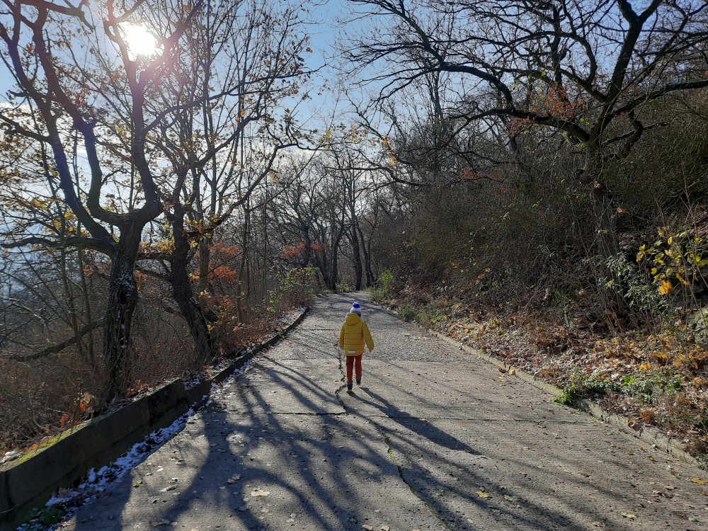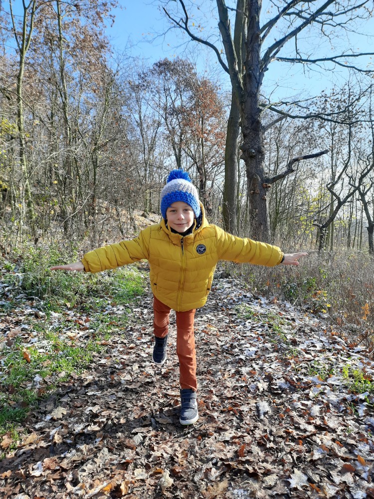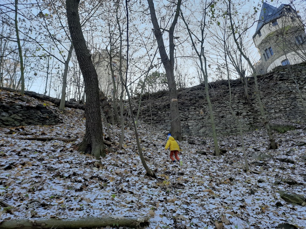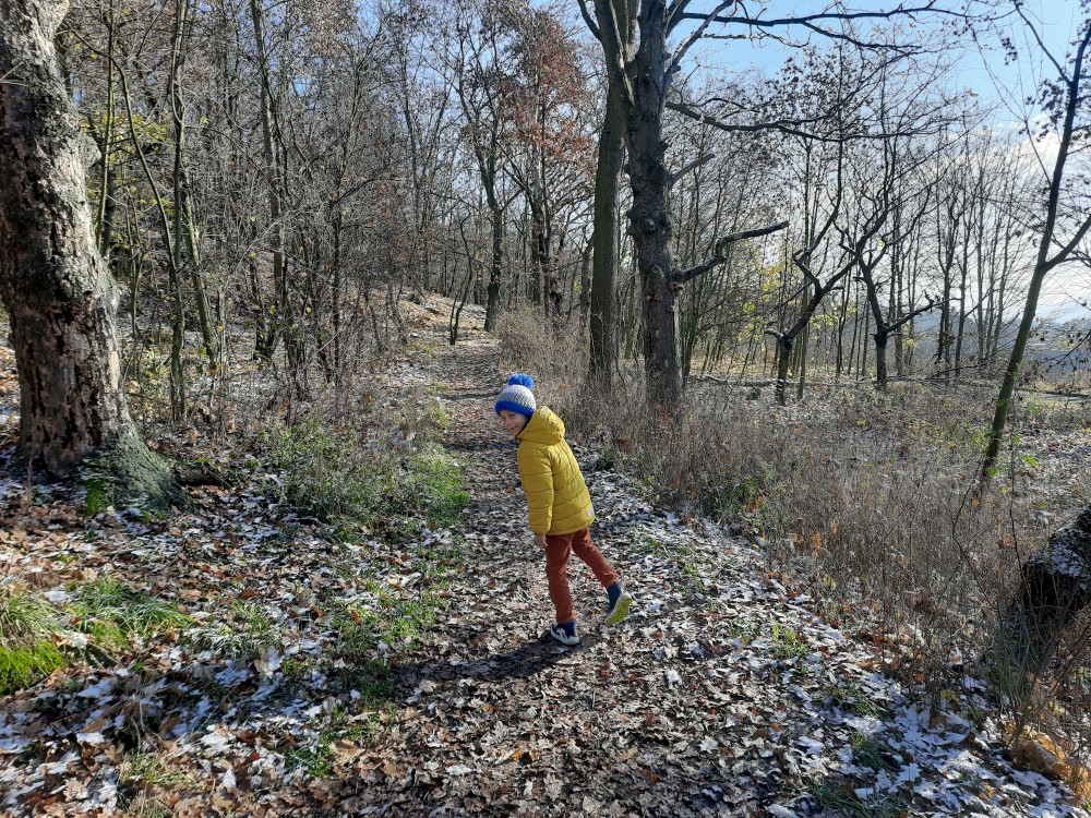 Nejprve jdeme jen na krátkou procházku kolem hotelu před obědem, pak obědváme a potom již jdeme naučnou stezkou Doubravka k vrcholu. Za chvíli se od ní odpojujeme, protože Martínek chce jít na kopec přímou cestou vzhůru. Jen tak tak se vyškrábeme na hradby.