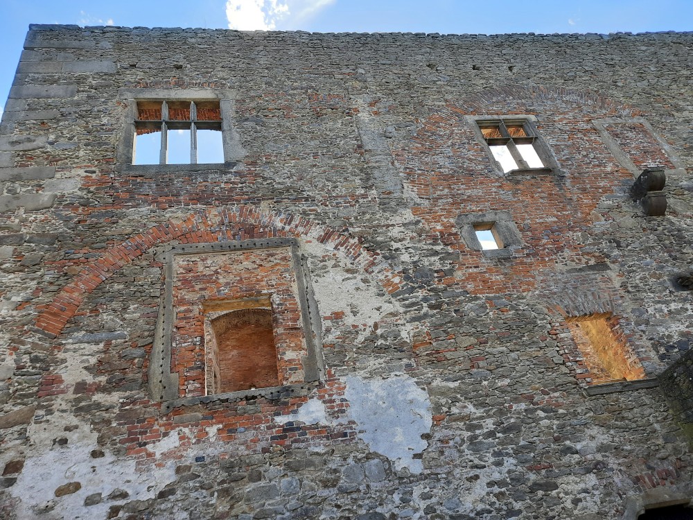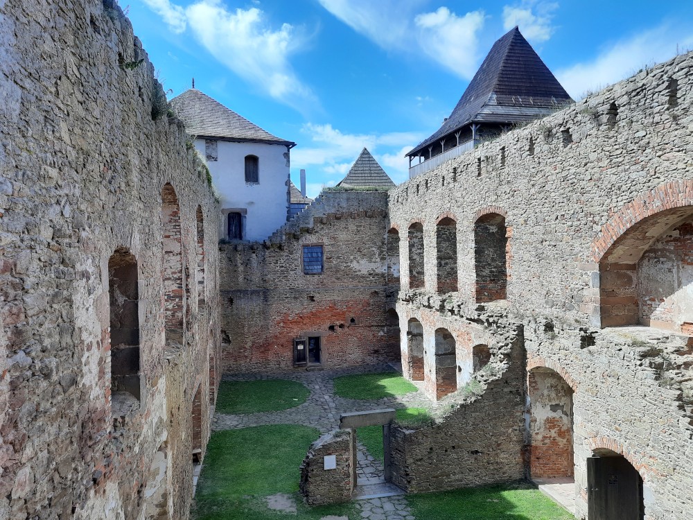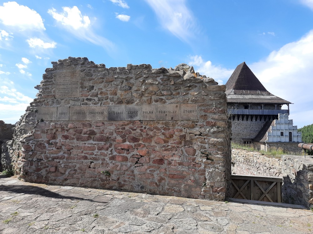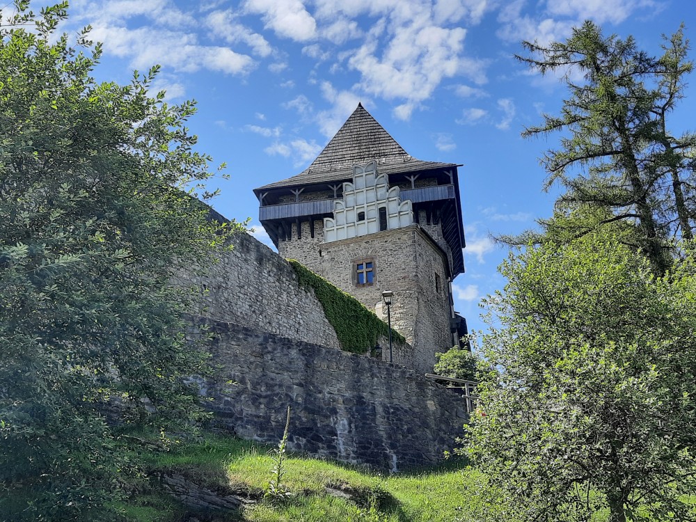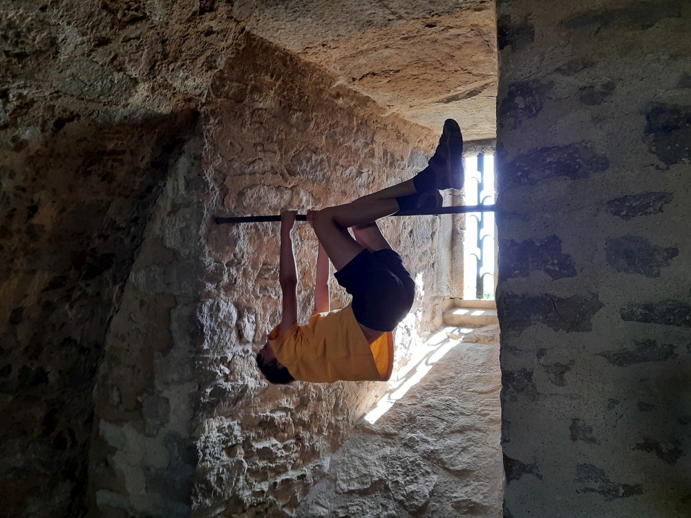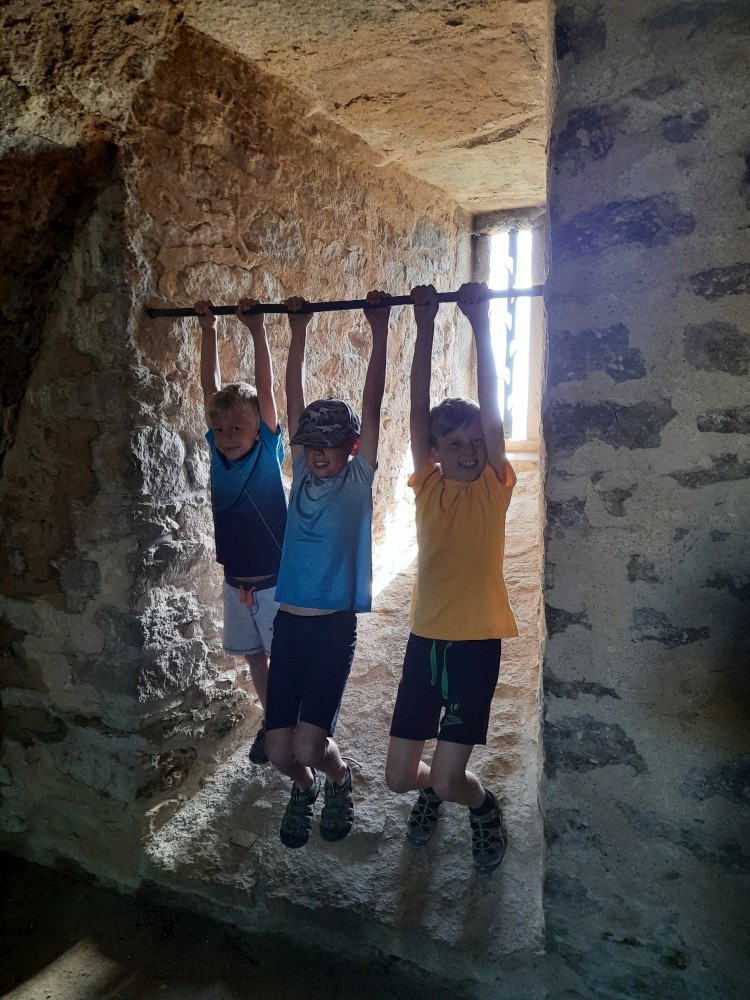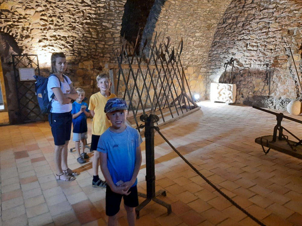 Hrad obcházíme podle plánku. Kluci objevují první cedulku s bobříkem a plní první úkol. Mají 30 s vyset za ruce na tyči. Pak je čeká hned druhý úkol, mají dojít na konec temného sklepa. Pak už stoupáme na Velkou věž. Vlají zde česká a ukrajinská vlajka.