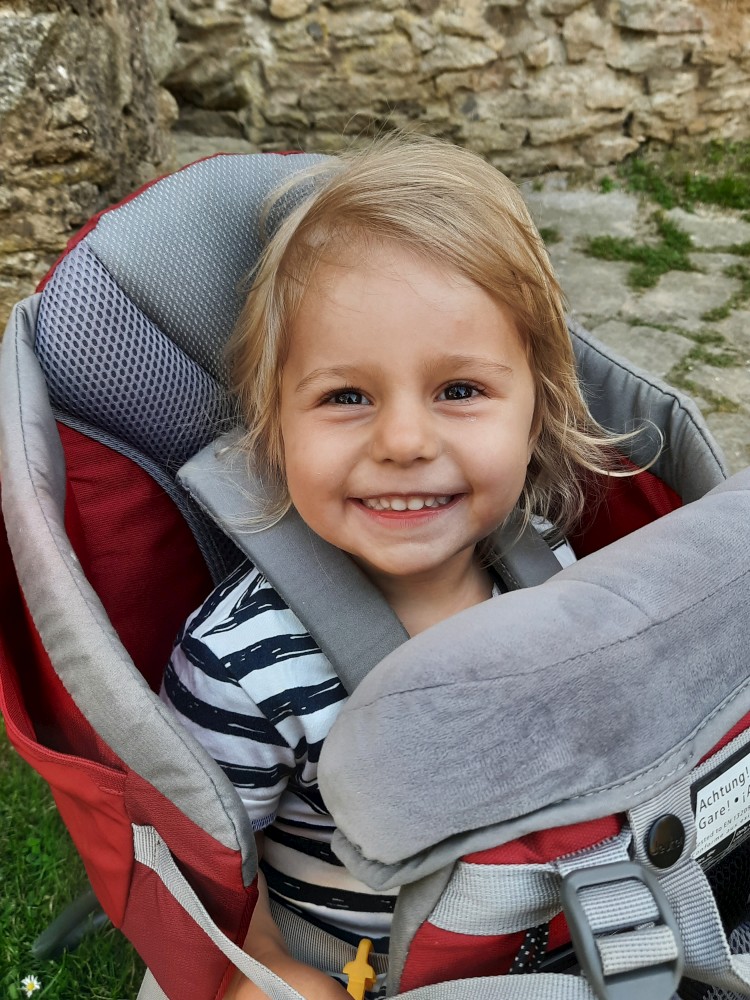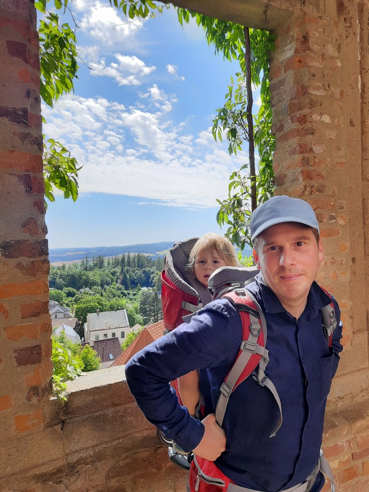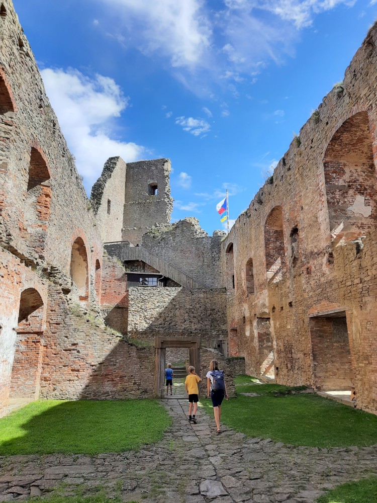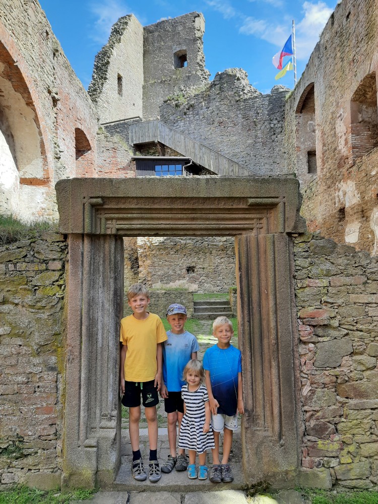 Už zbývá jen najít do kamene vytesaného jelena a lebku se skříženými kostmi. Nakonec se to podařilo a kluci si mohou jít pro odměnu. Dostávají bobříkový odznáček. Dostává i Bětuška. Opouštíme hrad, jdeme na kafe, sedáme do auta a jedeme domu. Objednáváme v Táboře pizzu, vyzvedáváme a jedeme domů.