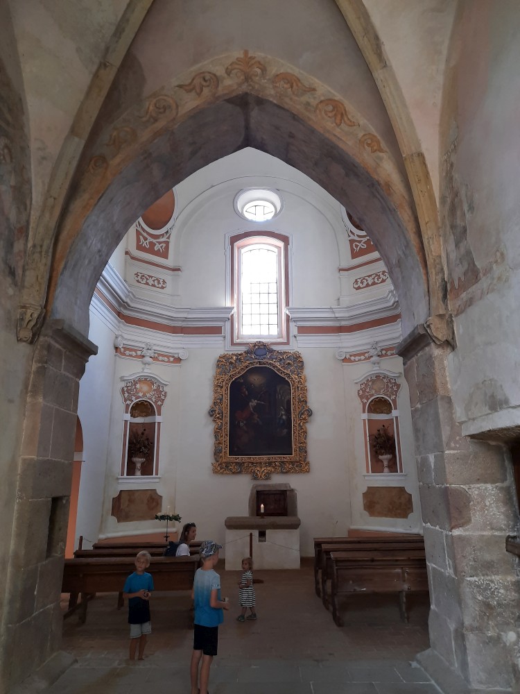 Kluci zde hledají jelena vytesaného do kameny. Nedaří se. Procházíme kaplovým ochozem a pak vstupujeme do samotné kaple. Kluci hledají do kamene vytesané prase. A zde jsou úspěšní. I když po nápovědě od mamky.