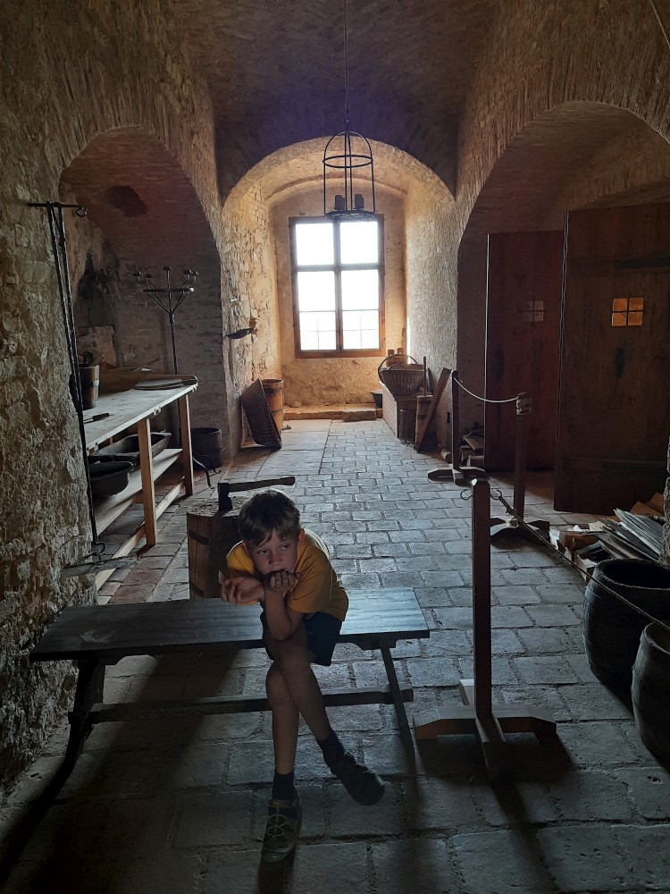 Prohlídka je bez průvodce, jen dostáváme na úvod nějaké informace o hradu. Kluci si berou u pokladny kartičky s bobříkovými úkoly. Když splní 7 bobříků, dostanou malou odměnu.