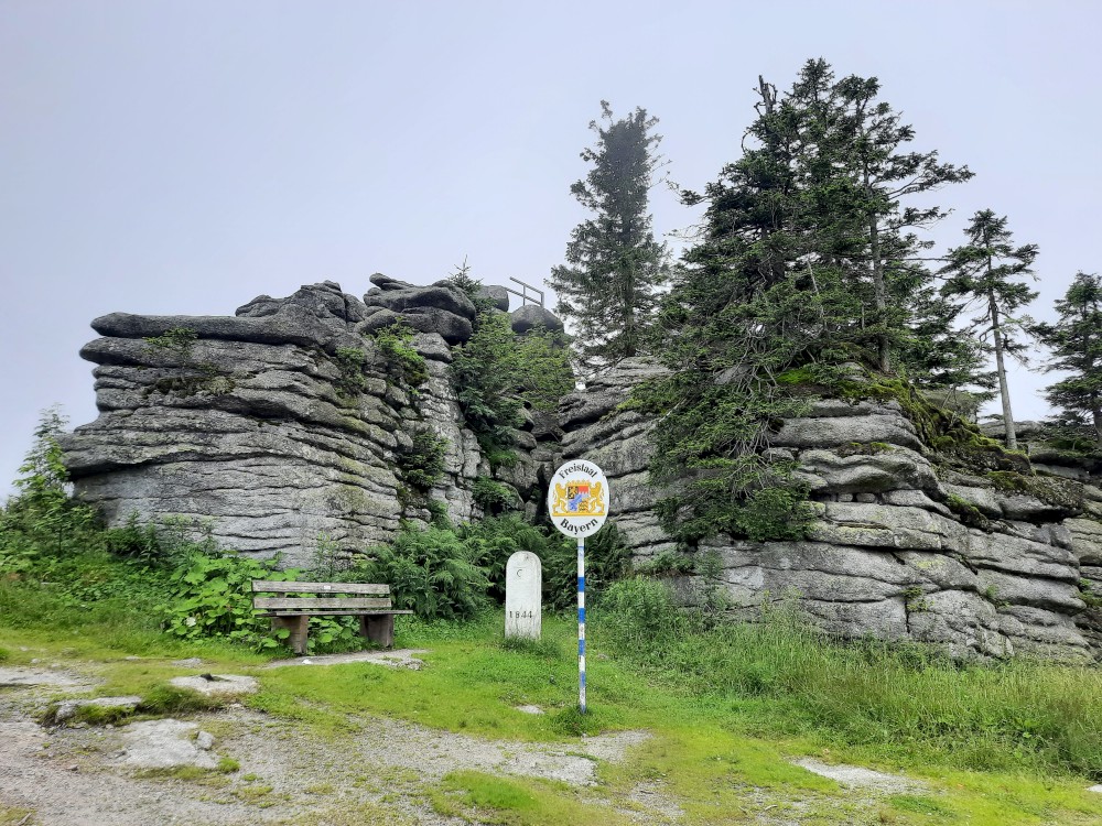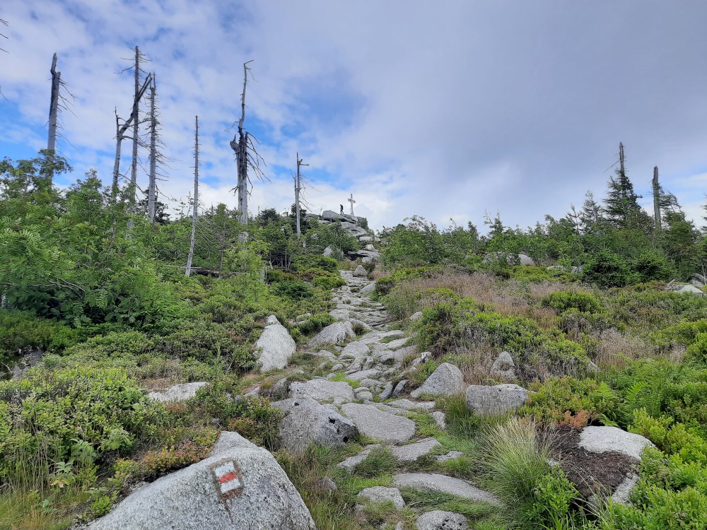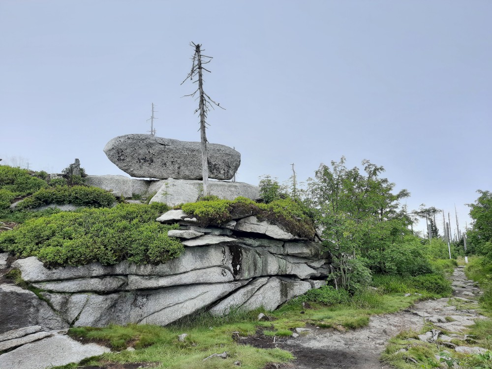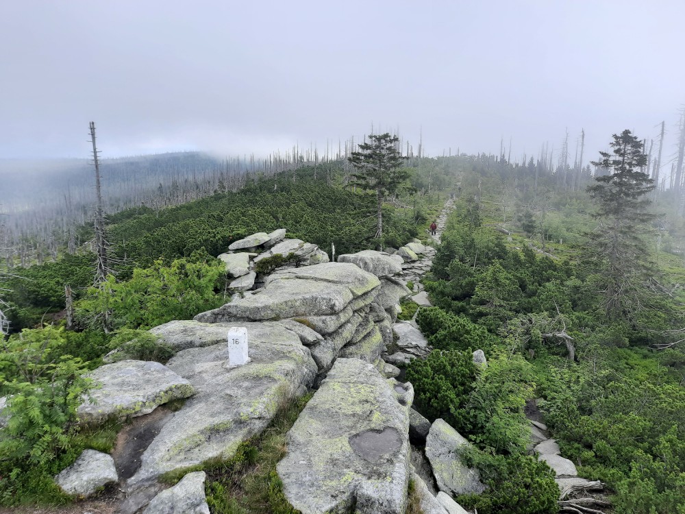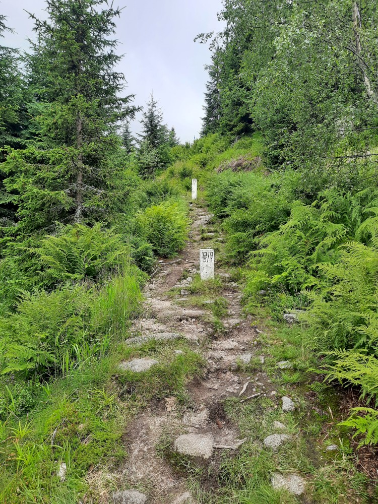 Je to dost nebezpečné. Mezi kameny je spousta hlubokých děr. Cesta je hodně složitá, ale zanedlouho se dostávám zase na cestu. Jdu po ní na západ k Trojmezné cestě. Po ní jdu kousek na sever ke studánce a k červené turistické trase. Po ní se vydávám podél státní hranice vzhůru na Třístoličník.
