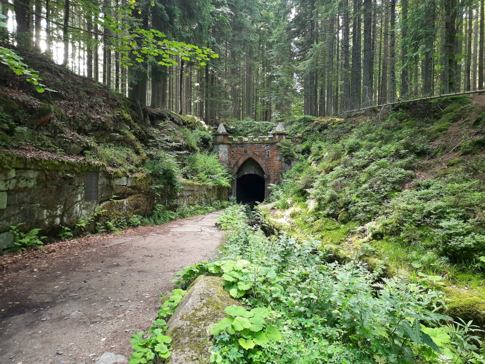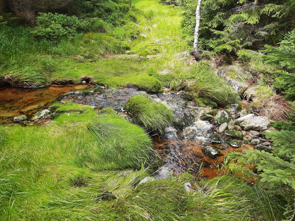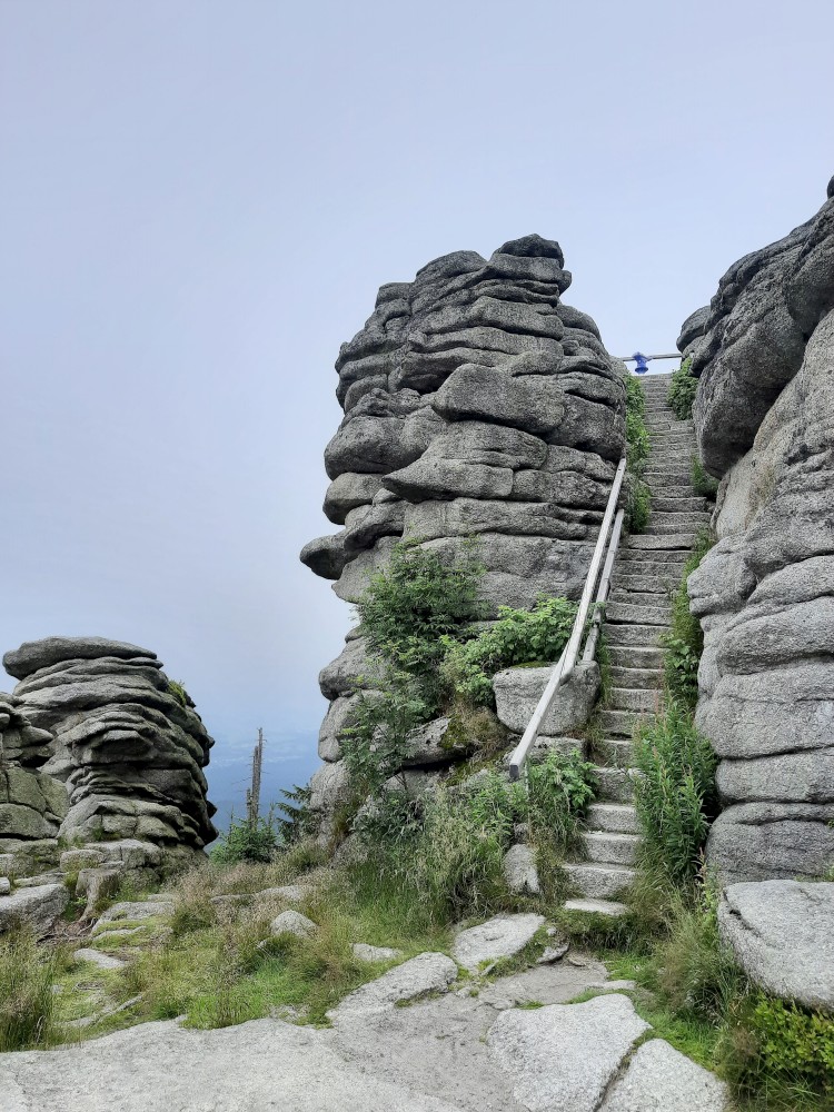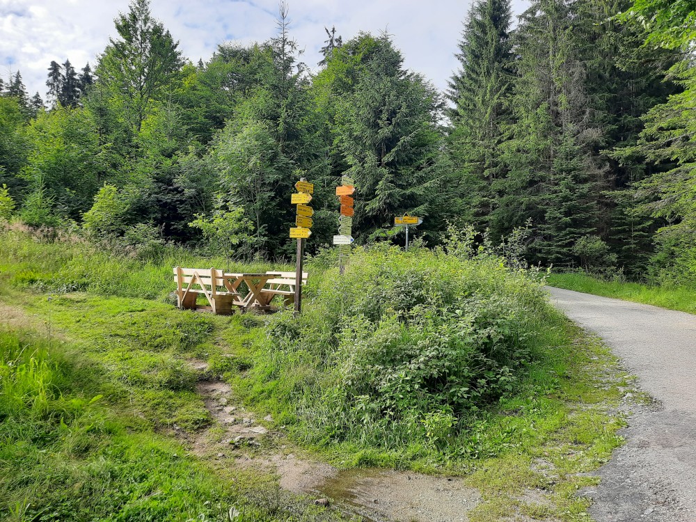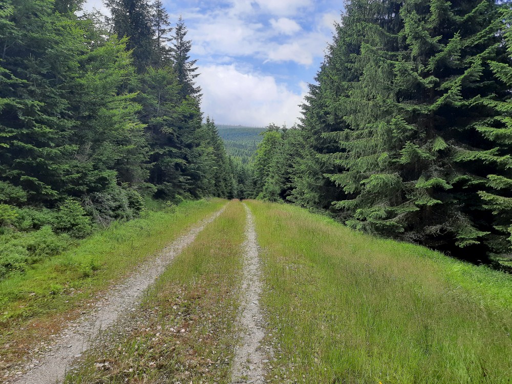 Je to dost nebezpečné. Mezi kameny je spousta hlubokých děr. Cesta je hodně složitá, ale zanedlouho se dostávám zase na cestu. Jdu po ní na západ k Trojmezné cestě. Po ní jdu kousek na sever ke studánce a k červené turistické trase. Po ní se vydávám podél státní hranice vzhůru na Třístoličník.