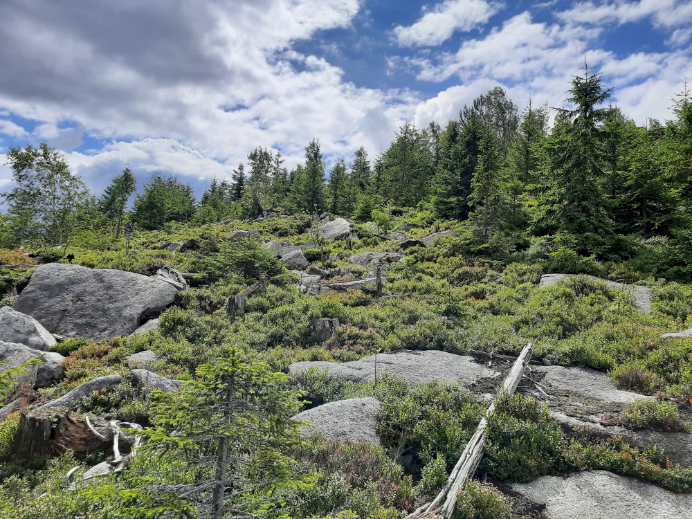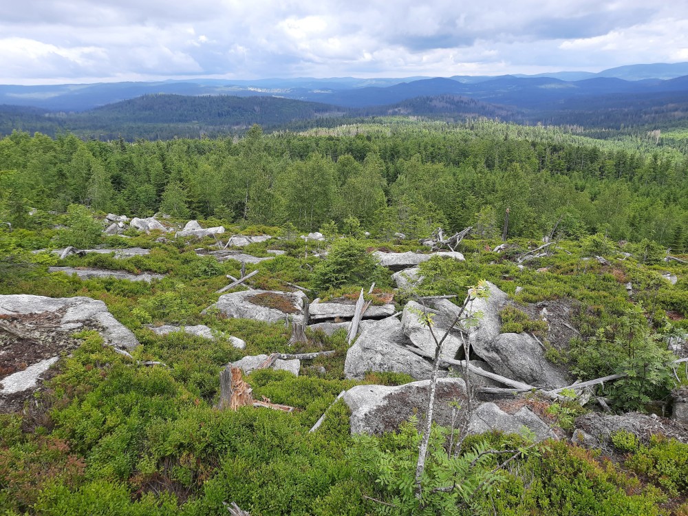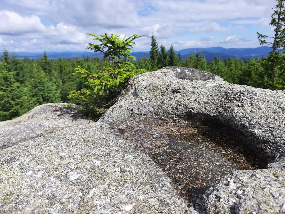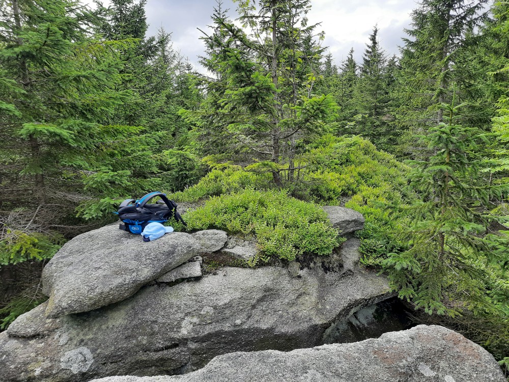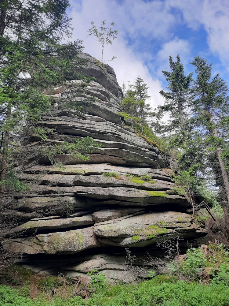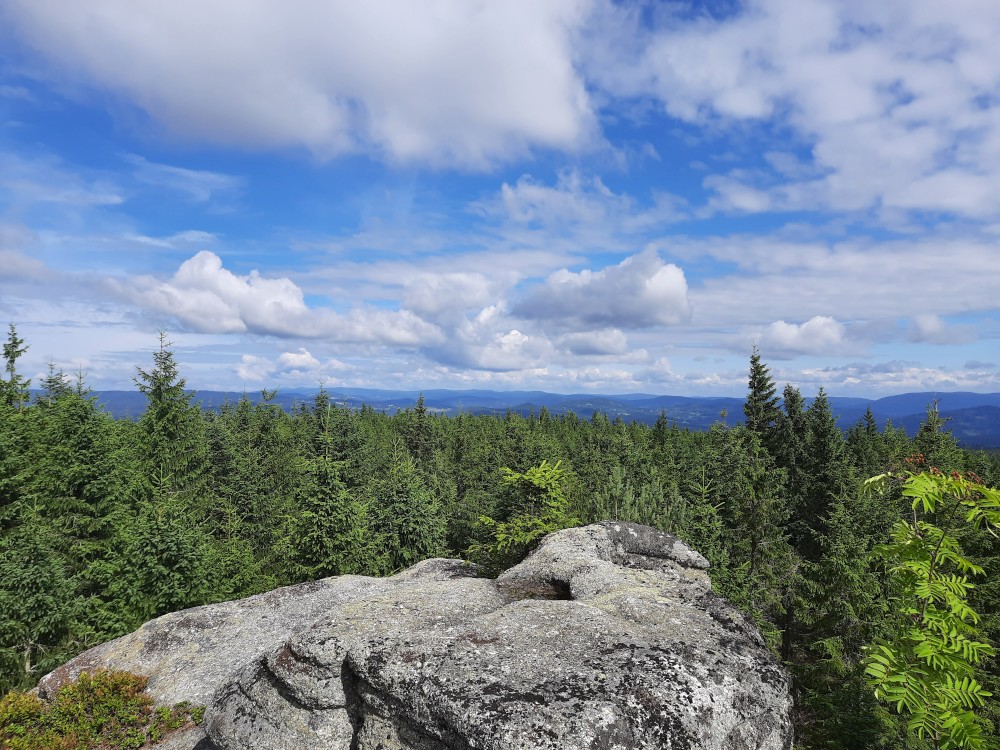 Jdu podle GPS, už bych měl být u vrcholu. Proderu se z hustého lesa a vidím krásnou skálu. Obcházím ji, abych zjistil, zda na ní lze vylézt. Z druhé strany to jde. Vydrápal jsem se na vrchol. Je odtud nádherný výhled na další skály i do širého kraje. Slézám ze skály a klesám na jih kamenným polem.