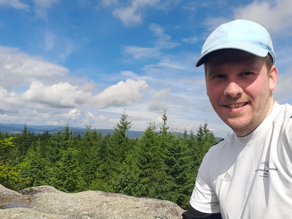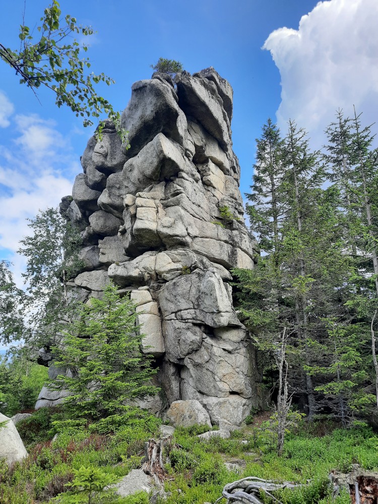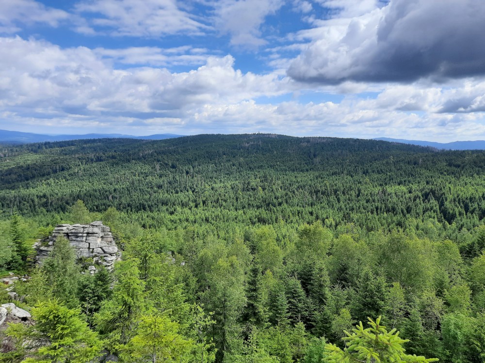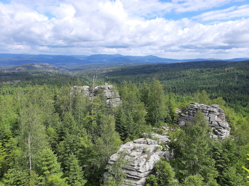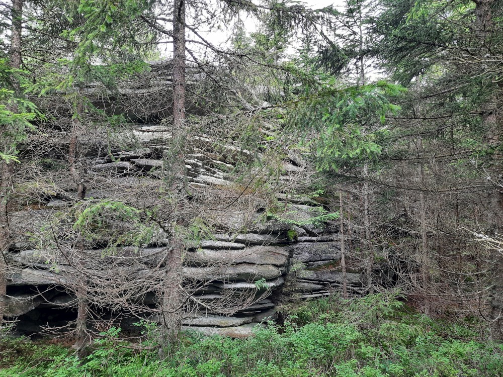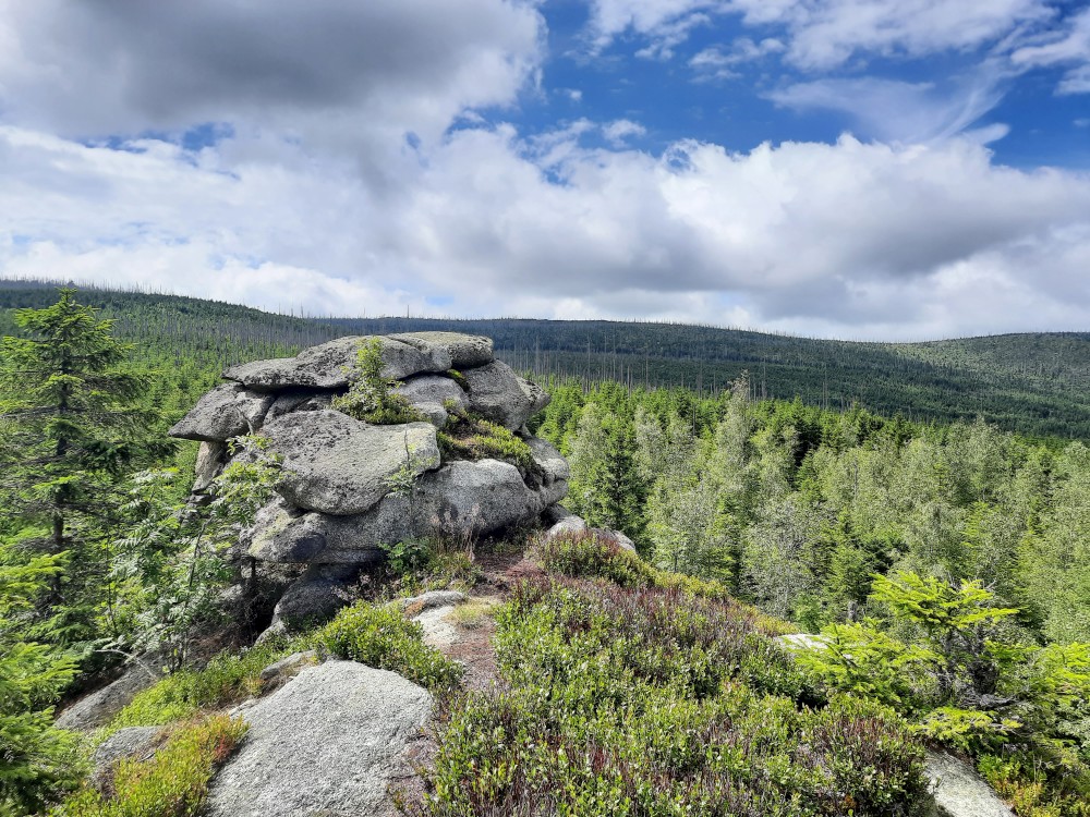 Jdu podle GPS, už bych měl být u vrcholu. Proderu se z hustého lesa a vidím krásnou skálu. Obcházím ji, abych zjistil, zda na ní lze vylézt. Z druhé strany to jde. Vydrápal jsem se na vrchol. Je odtud nádherný výhled na další skály i do širého kraje. Slézám ze skály a klesám na jih kamenným polem.