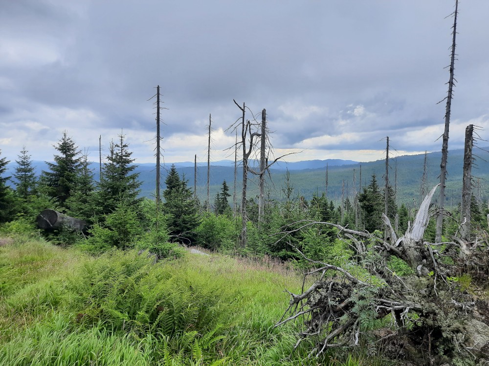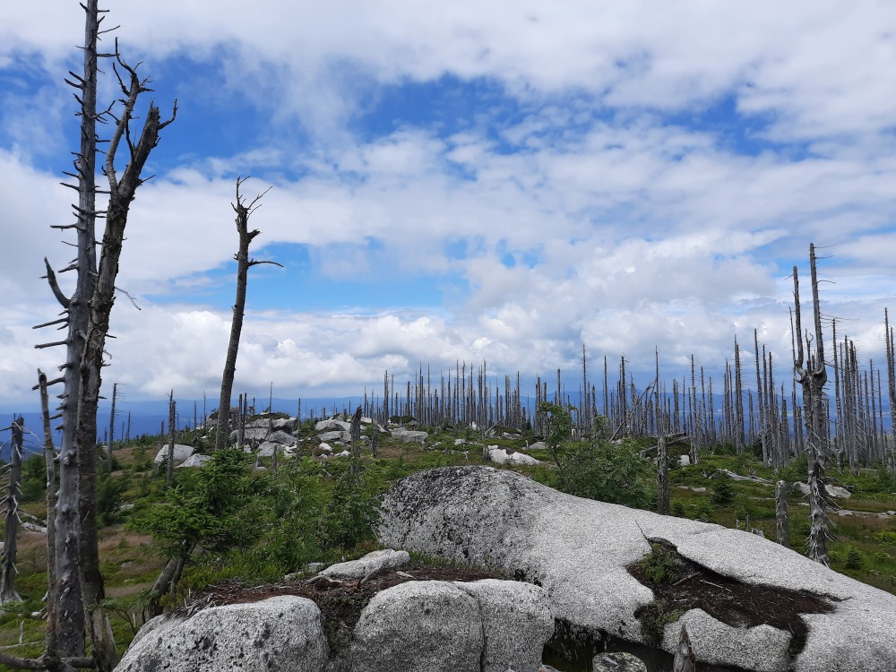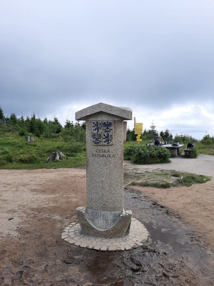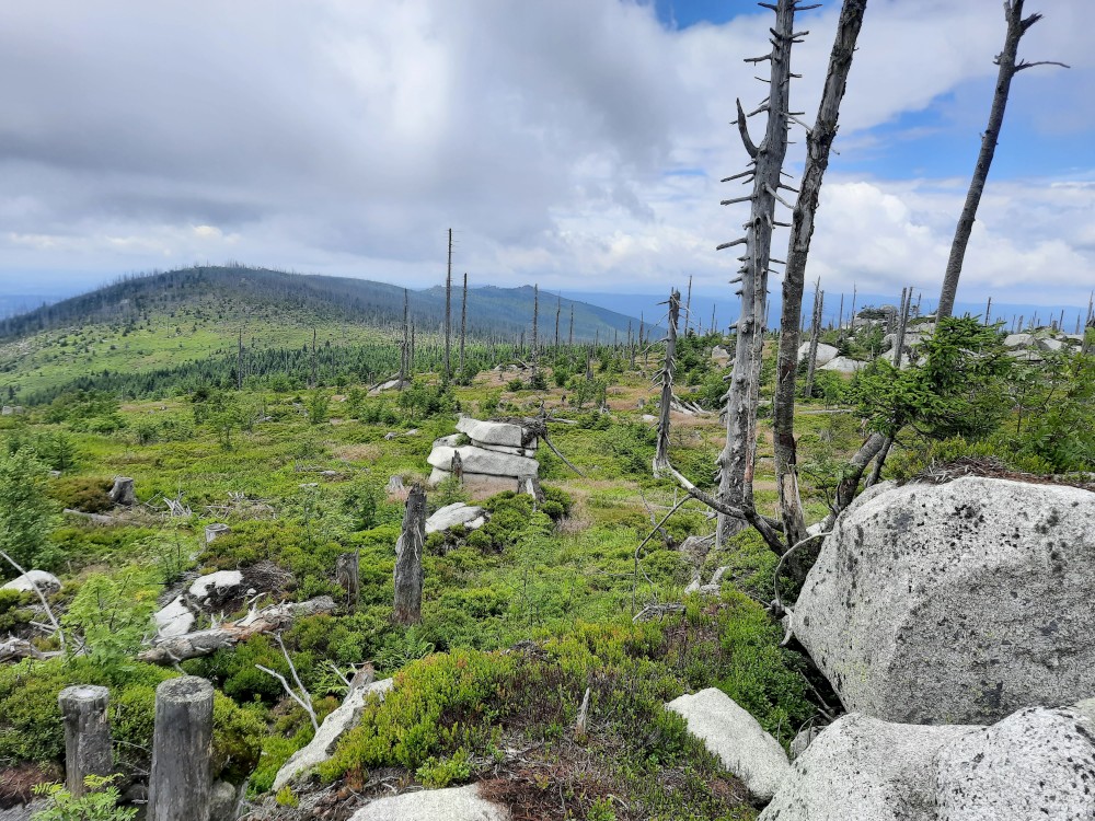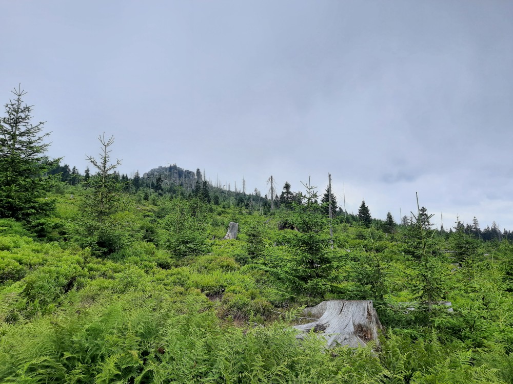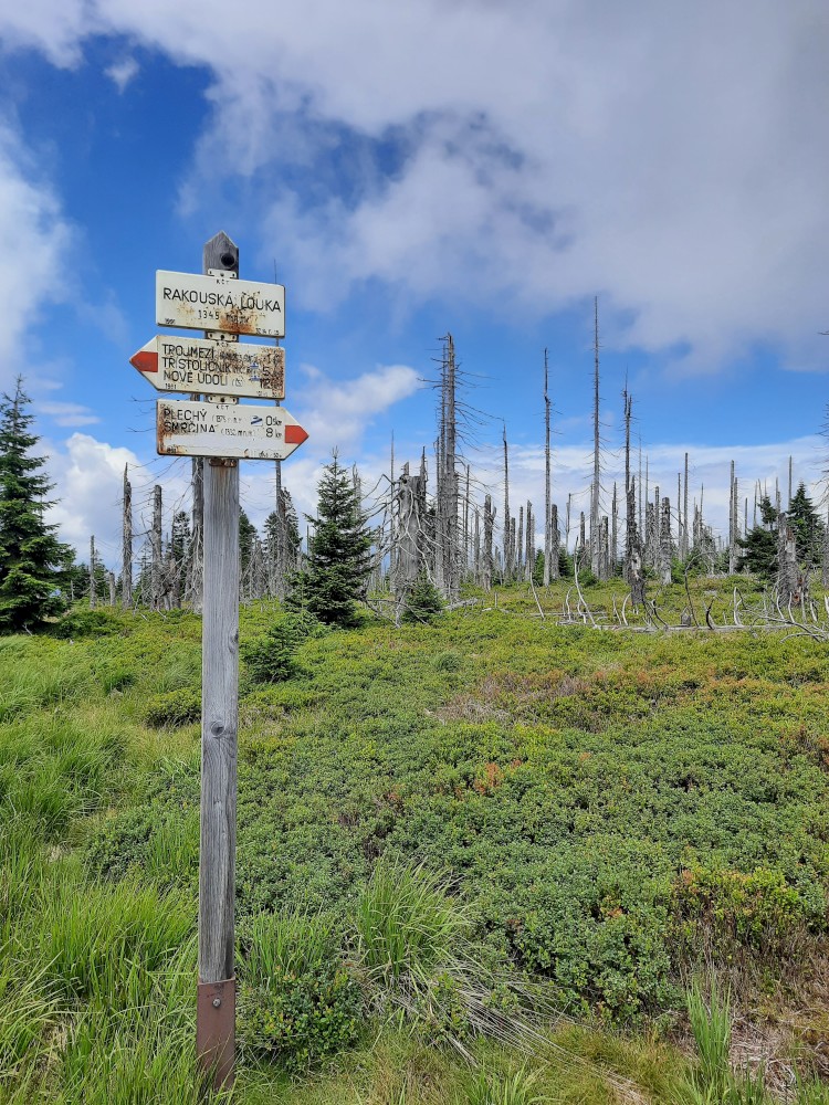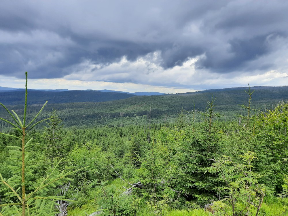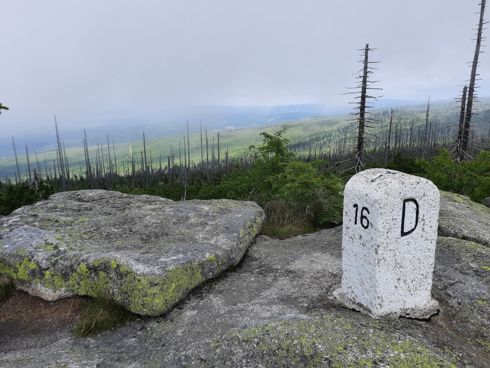 Nahoře je oblačno. Jsem rád, že je otevřená místní restaurace. Dávám si pivo a gulasch suppe. Posilněn vyrážím dále. Jdu po červené hřebenovku, přes Vysoký hřeben, Trojmeznou, Trojmezí, Nad Rakouskou loukou až na Plechý. Kochám se výhledy i tím, jak se místní les přirozeně obnovuje.