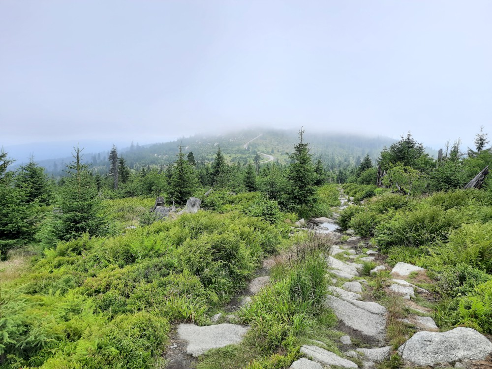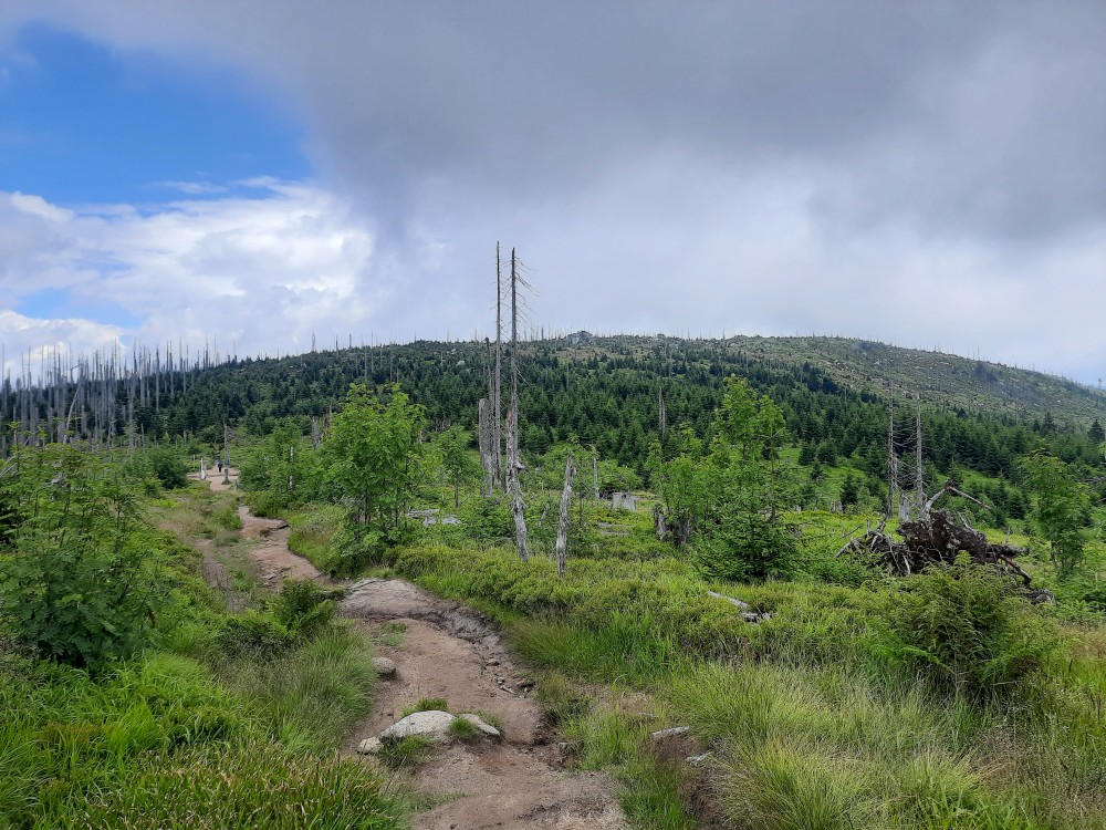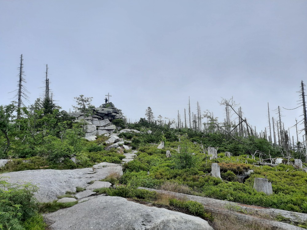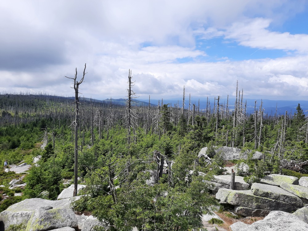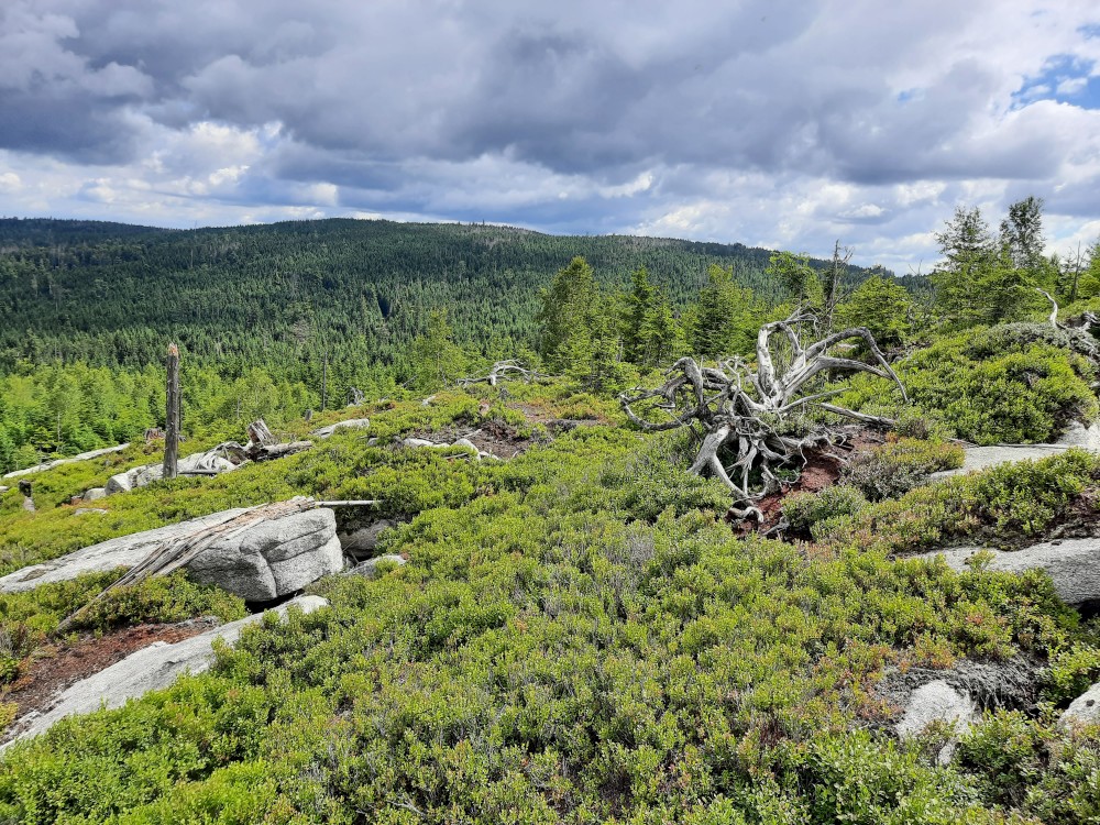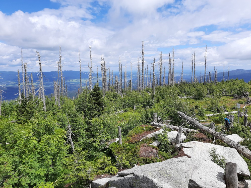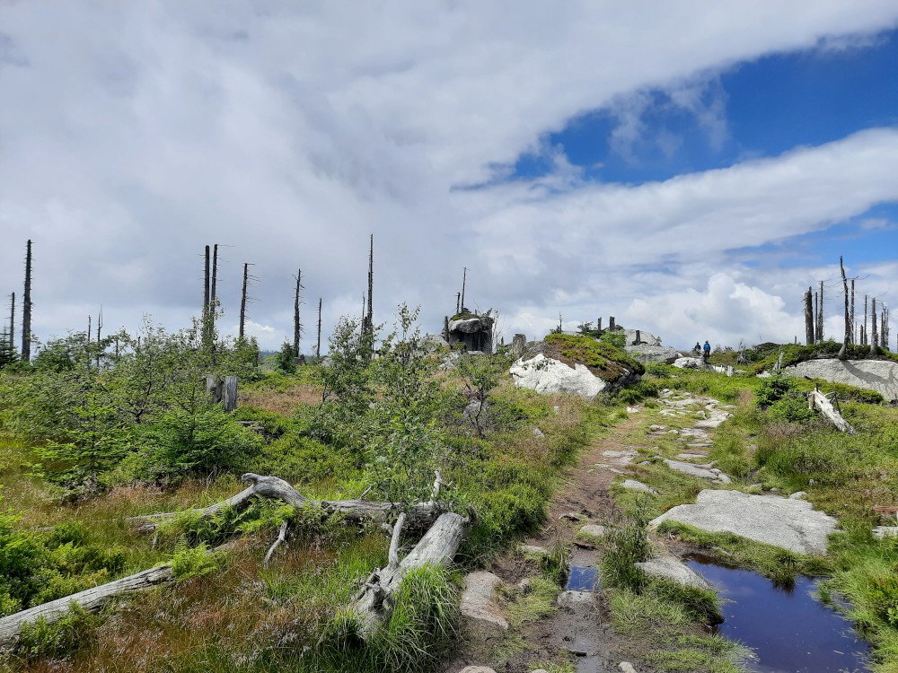 Nahoře je oblačno. Jsem rád, že je otevřená místní restaurace. Dávám si pivo a gulasch suppe. Posilněn vyrážím dále. Jdu po červené hřebenovku, přes Vysoký hřeben, Trojmeznou, Trojmezí, Nad Rakouskou loukou až na Plechý. Kochám se výhledy i tím, jak se místní les přirozeně obnovuje.
