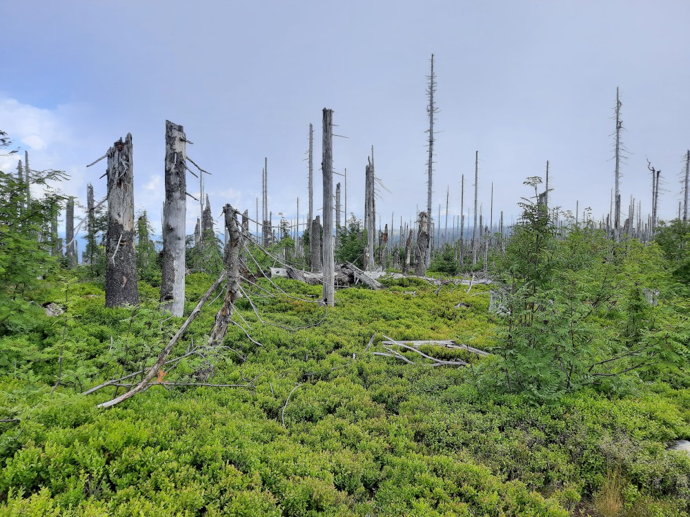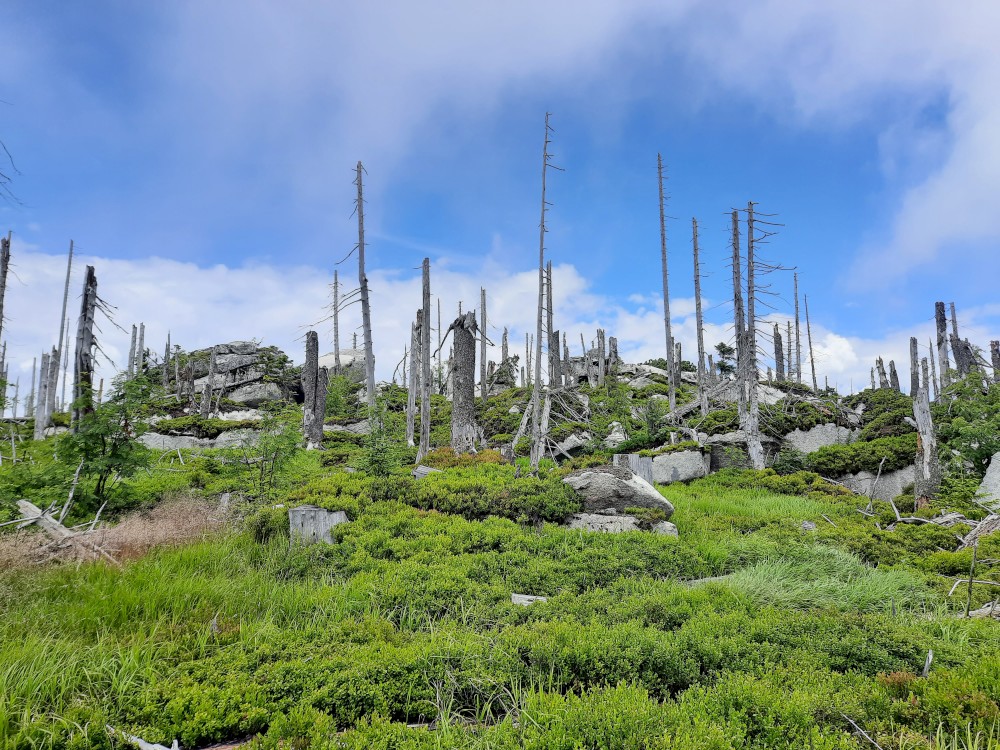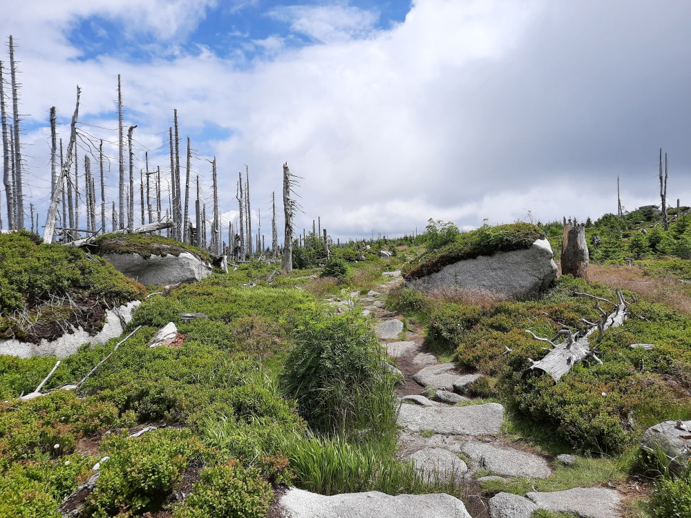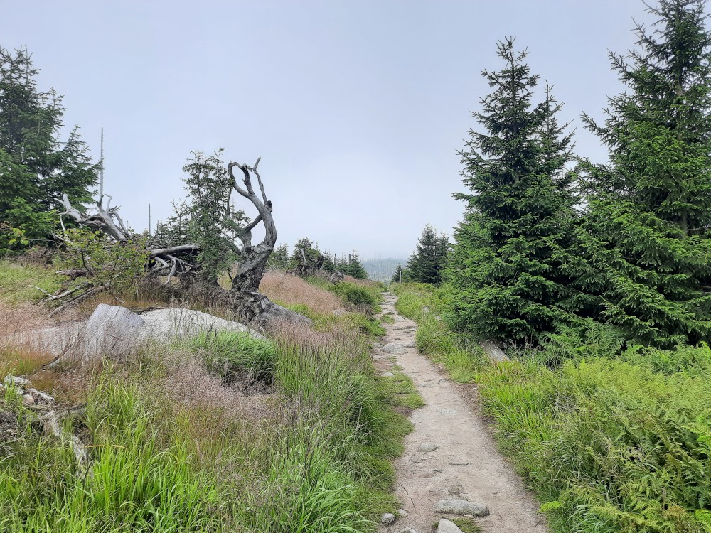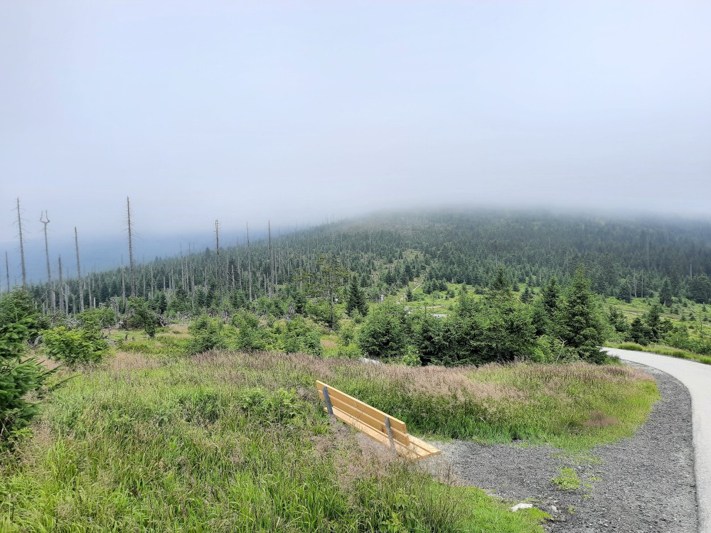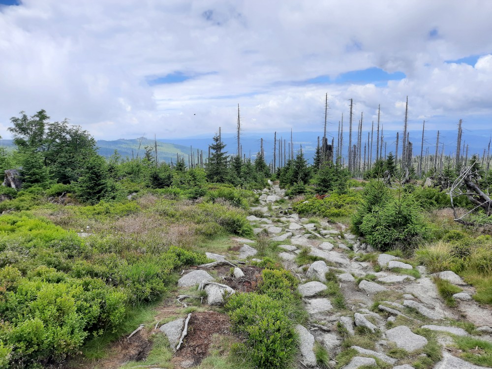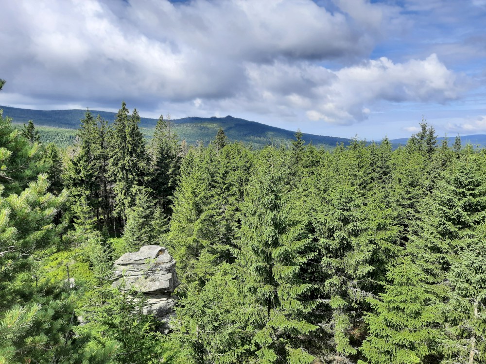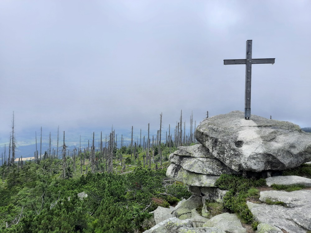 Nahoře je oblačno. Jsem rád, že je otevřená místní restaurace. Dávám si pivo a gulasch suppe. Posilněn vyrážím dále. Jdu po červené hřebenovku, přes Vysoký hřeben, Trojmeznou, Trojmezí, Nad Rakouskou loukou až na Plechý. Kochám se výhledy i tím, jak se místní les přirozeně obnovuje.