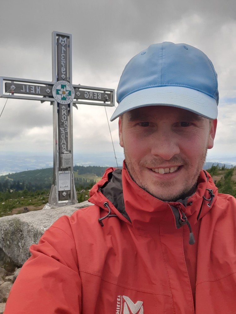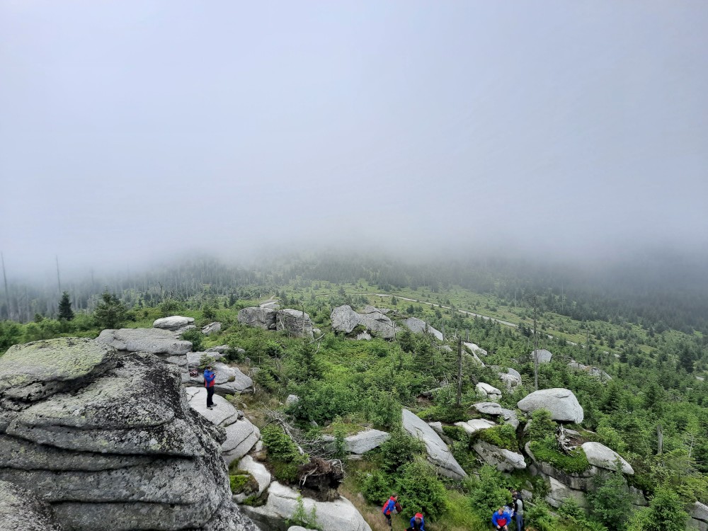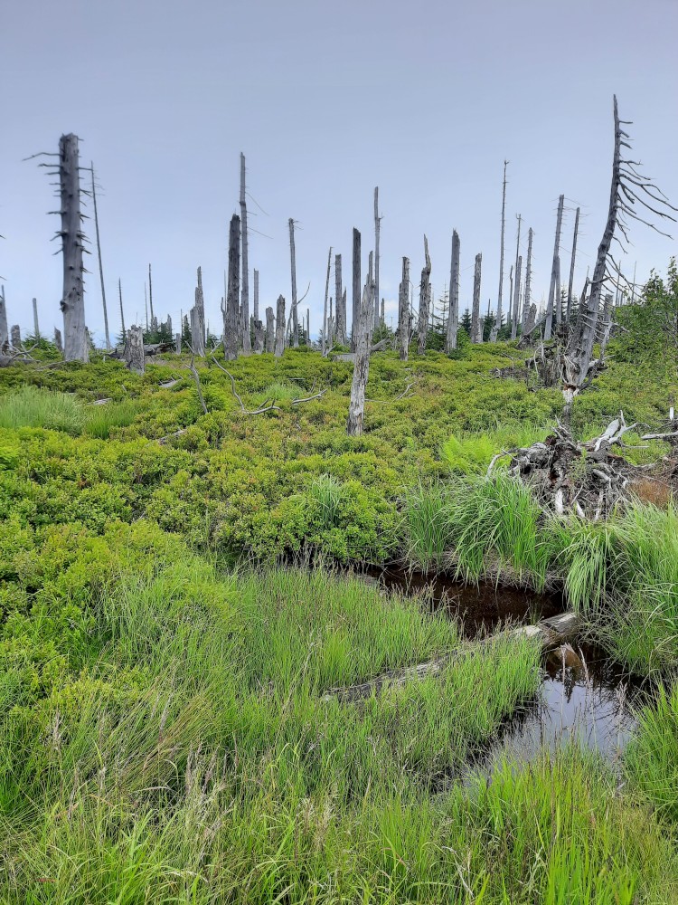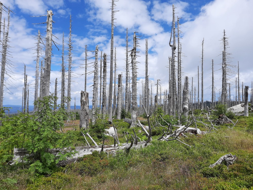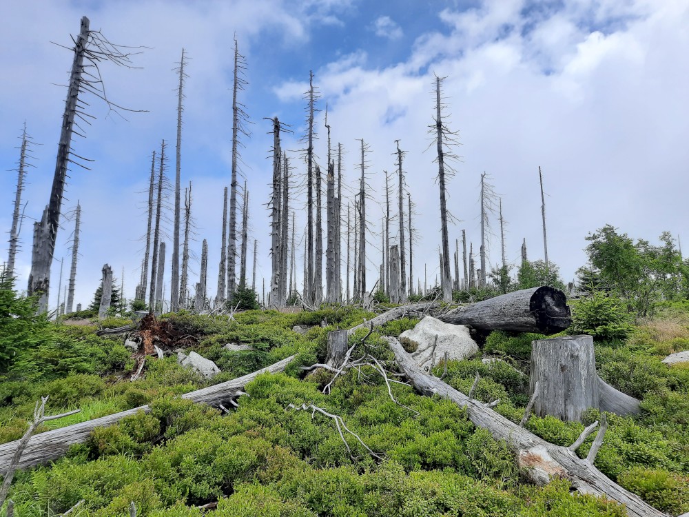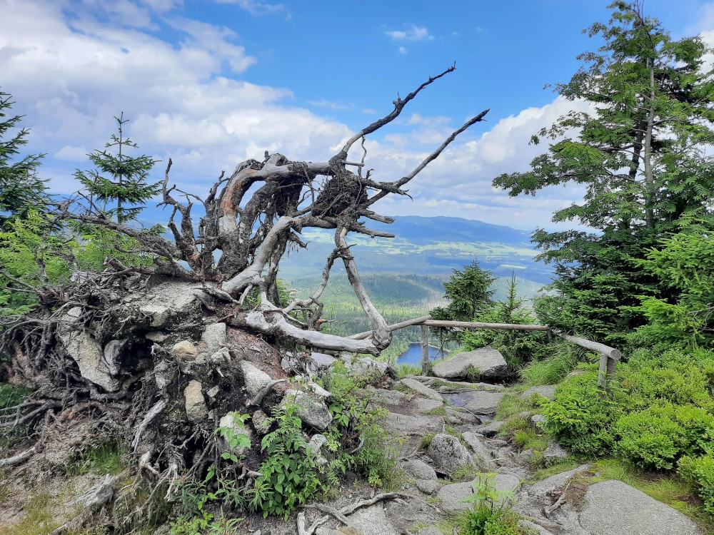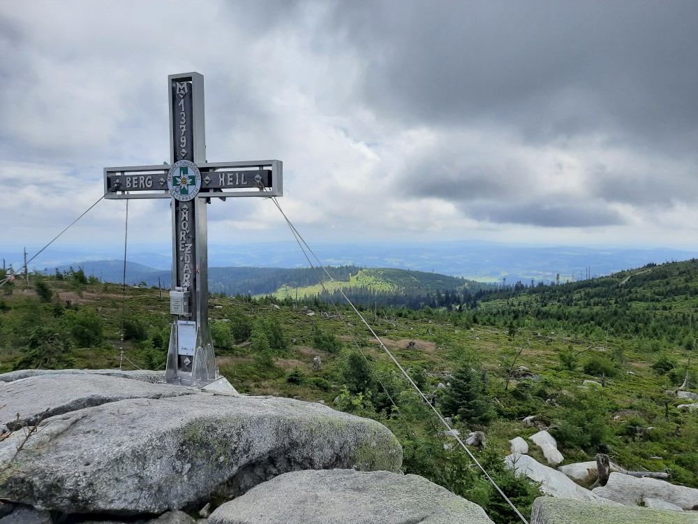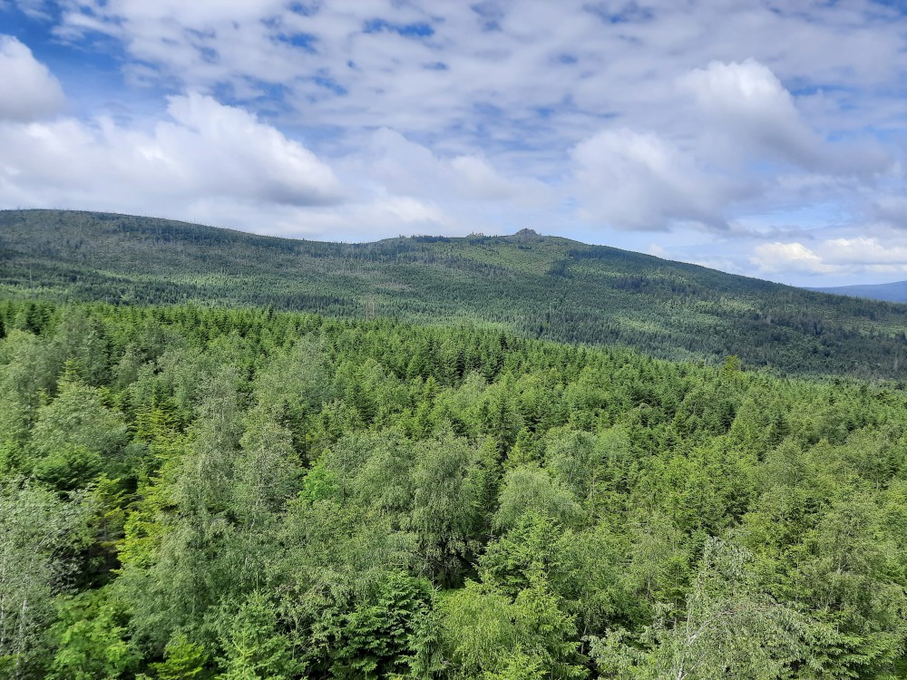 Nahoře je oblačno. Jsem rád, že je otevřená místní restaurace. Dávám si pivo a gulasch suppe. Posilněn vyrážím dále. Jdu po červené hřebenovku, přes Vysoký hřeben, Trojmeznou, Trojmezí, Nad Rakouskou loukou až na Plechý. Kochám se výhledy i tím, jak se místní les přirozeně obnovuje.