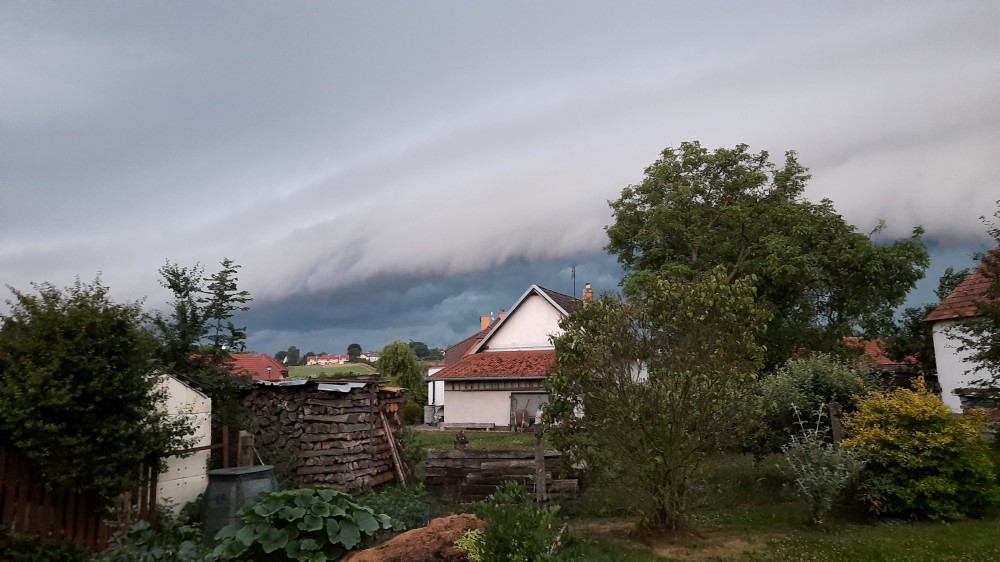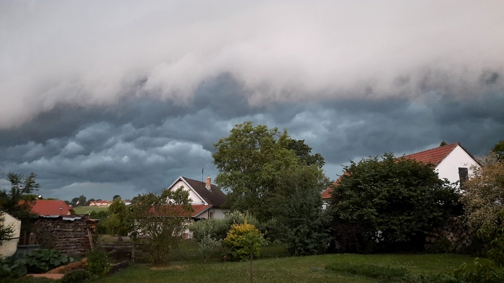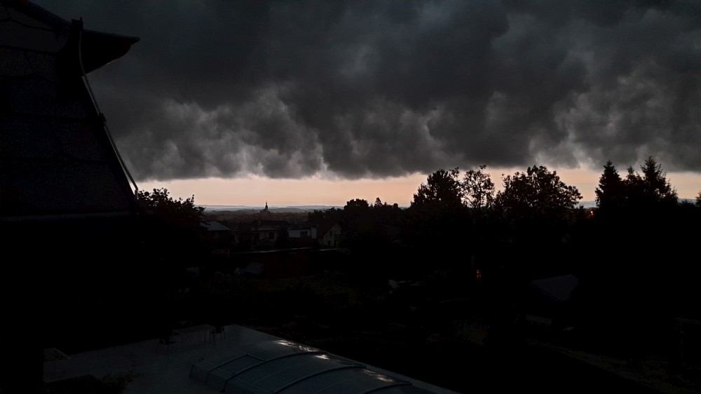 Dnes nás přijeli navštívit Pecmanovi. Jedou do Týna za babičkou, tak budou v pátek u nás, přespí a pak pojedou do Týna. Děláme oheň, opékáme buřty a bavorské klobásky. Večer přichází děsivé bouřkové mraky a bouřka. Sedíme u nás v kuchyni a povídáme dlouho do noci. Společnou fotku s Pelcíkama jsme si neudělali. Tak aspoň ty mraky :-).