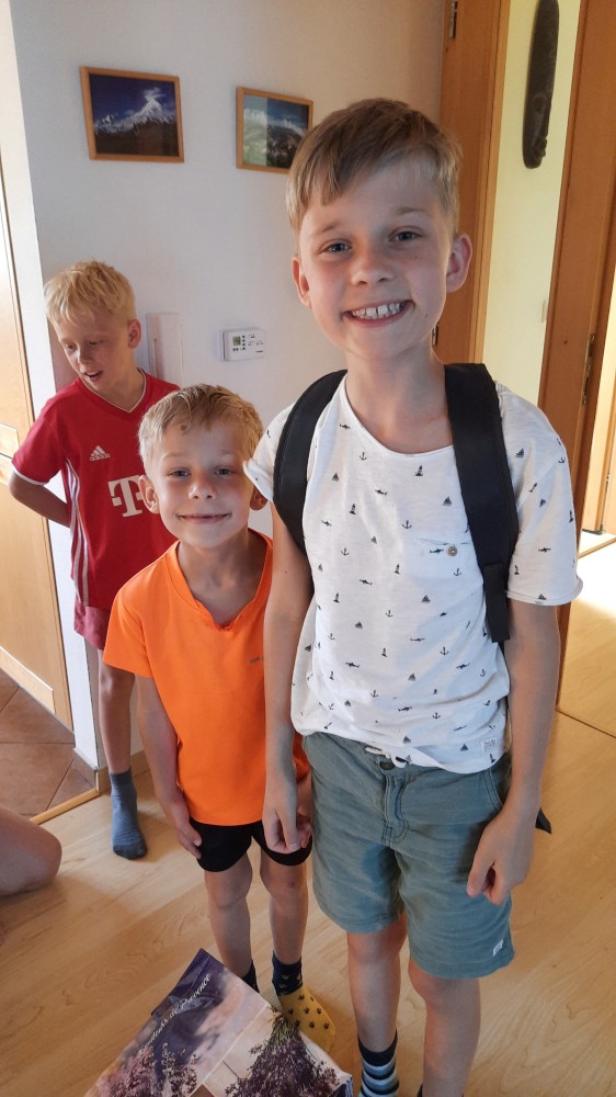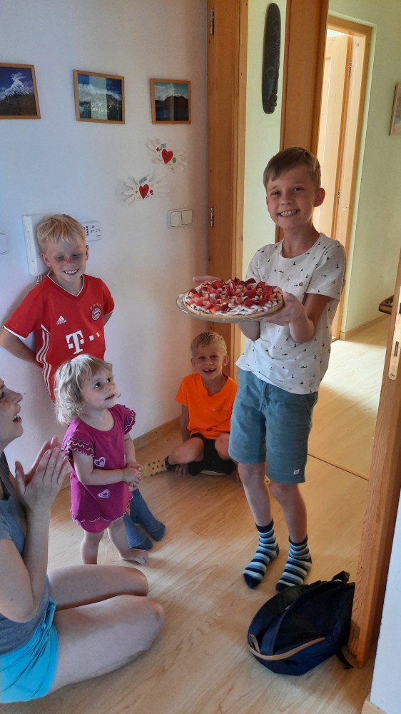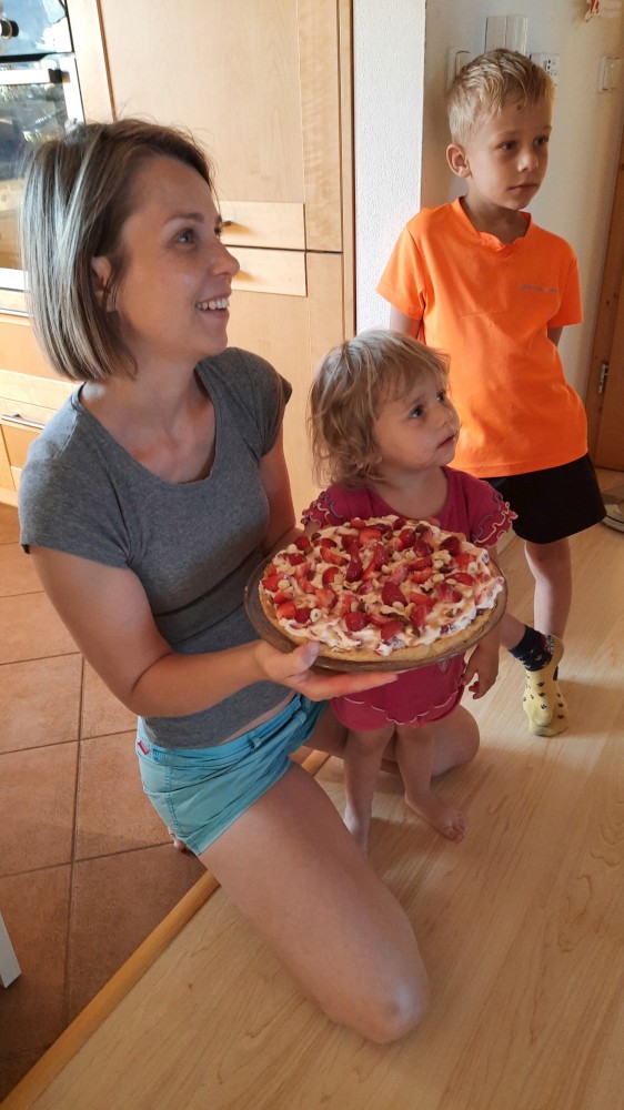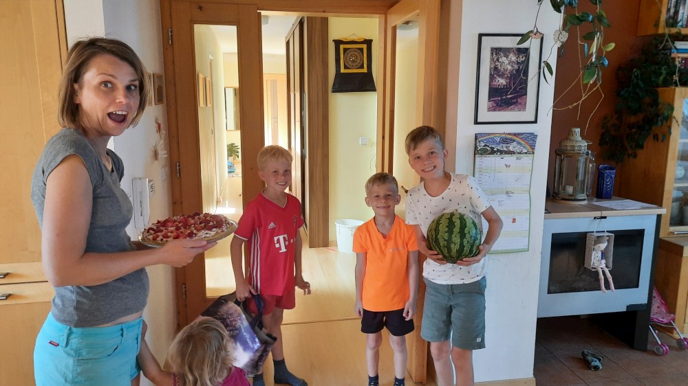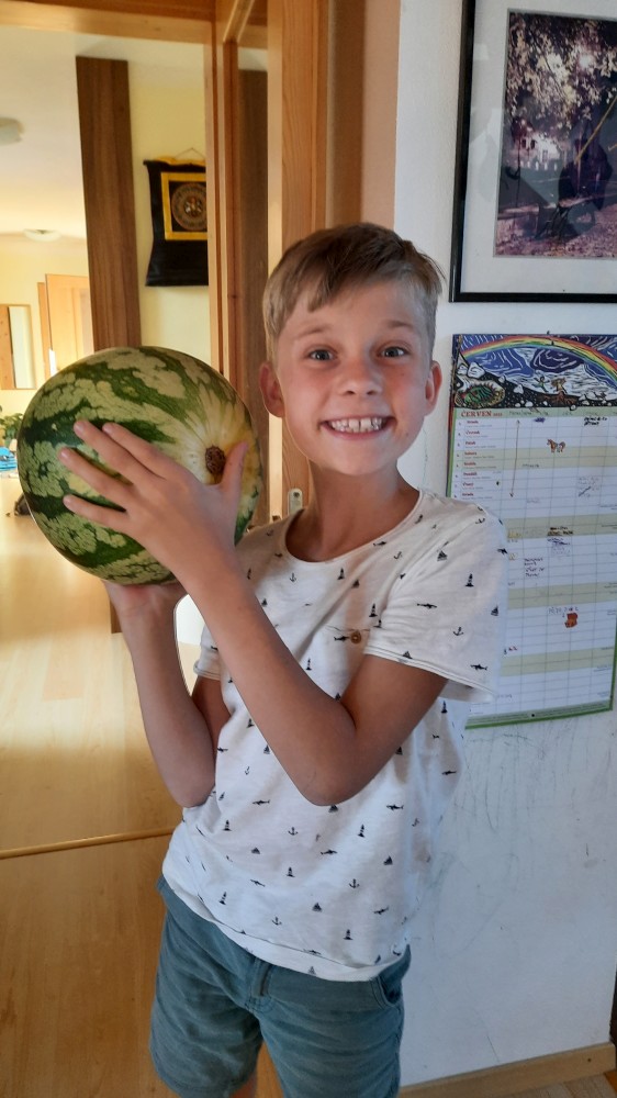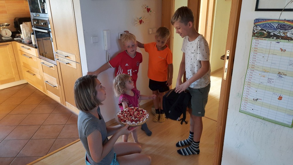 Dnes slavíme Víti svátek. Dostává meloun, batůžek na atletiku a dort.