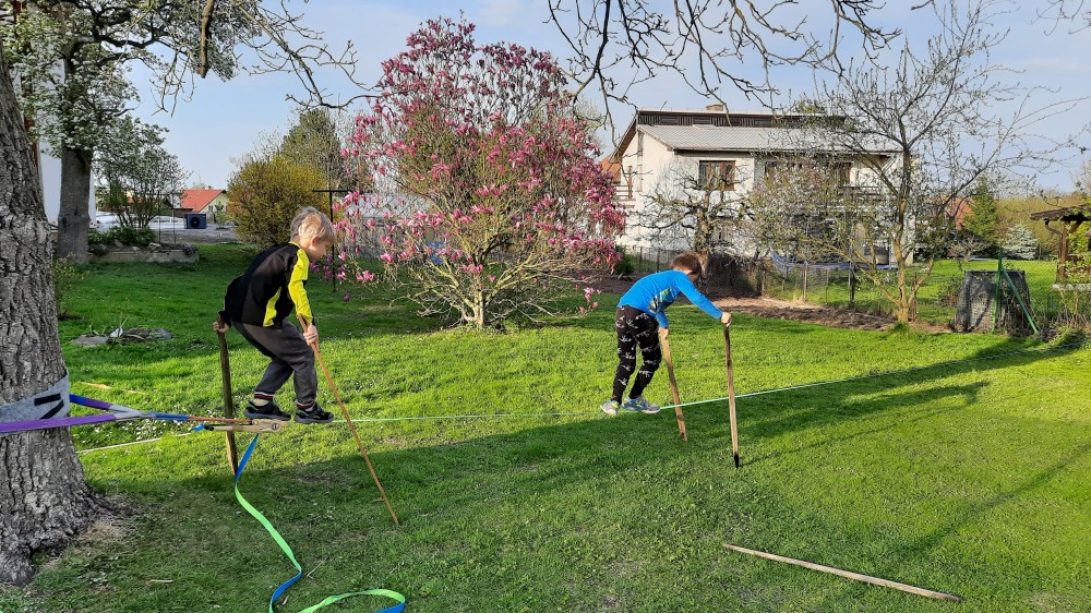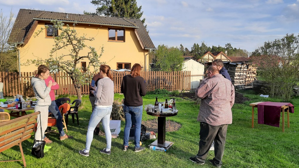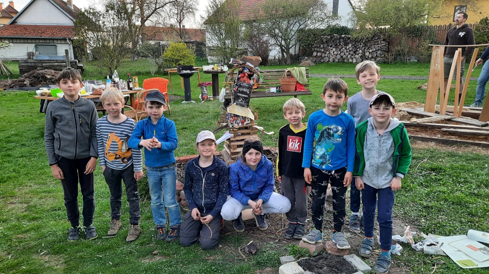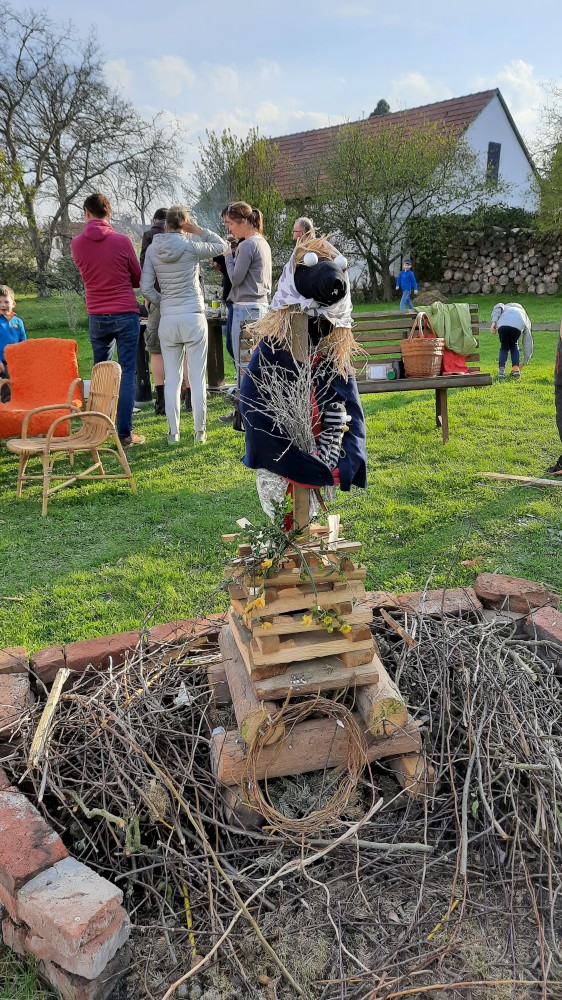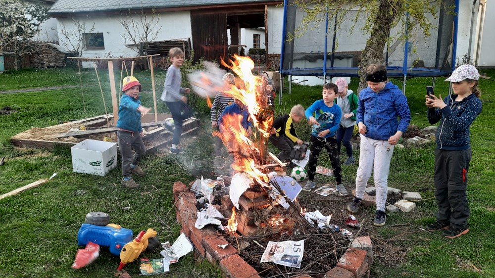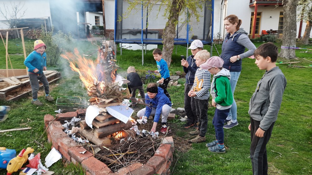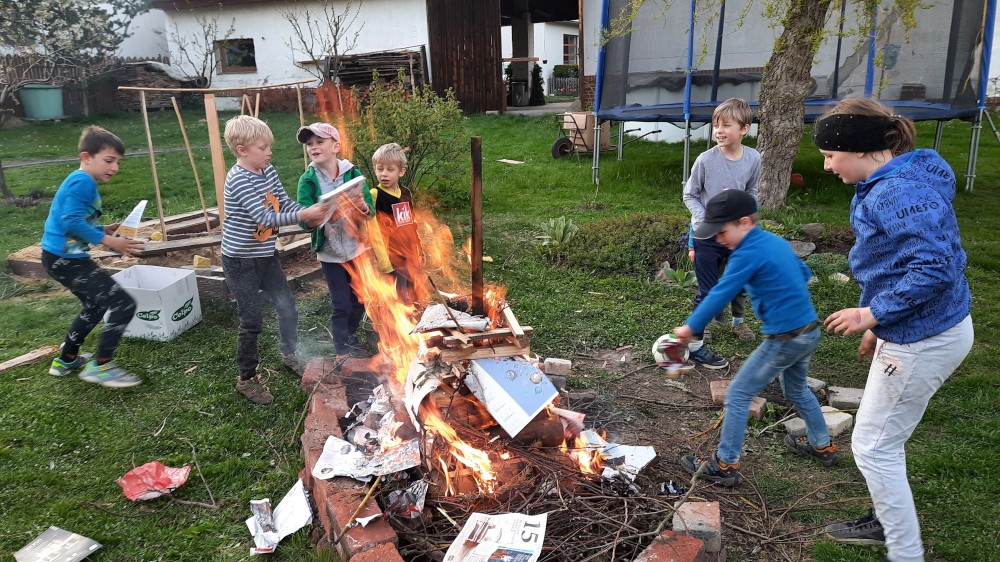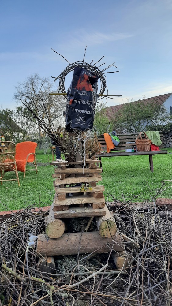 Pálíme čarodějnice na Horkách. Sešlo se nás letos dost - Jimmy s rodinkou, Kepkovi, Míla, Kultovka. Mací udělala krásnou čarodějnici. Ale dozvídáme se, že se musí spálit až bude tma. To nebudeme čekat, tak děti dělají čarodějnici improvizovanou.