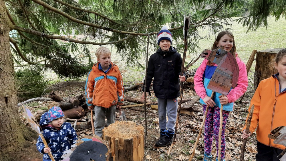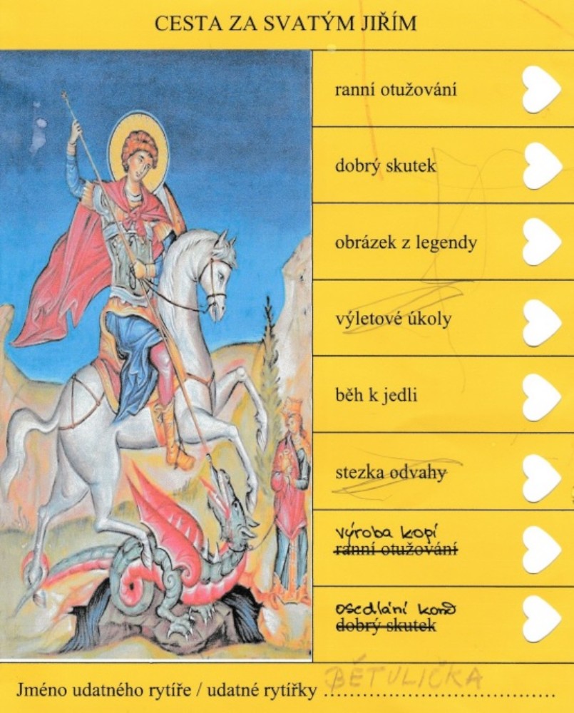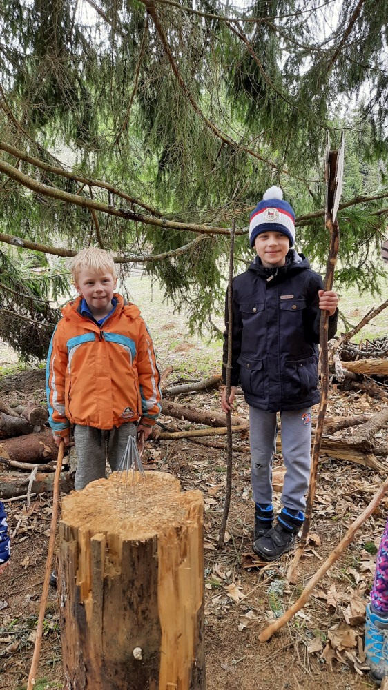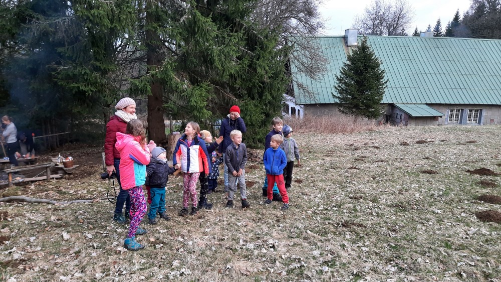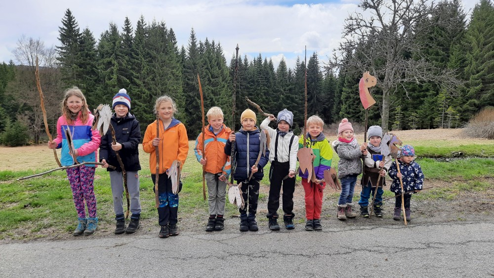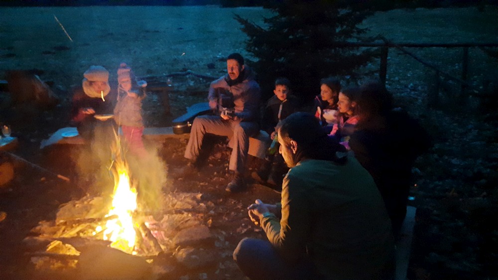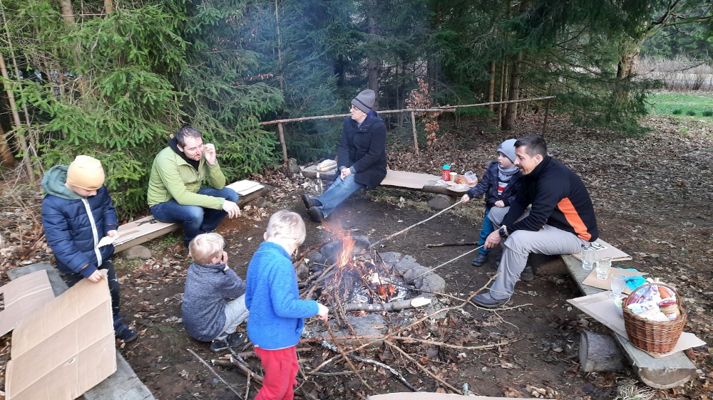 Pak už sedáme do Jimmyho auta, které jsme si sem ráno před výletem zaparkovali. Jedeme na chaloupku a dalšími auty pak vyzvedáváme ostatní. Večer pečeme buřty, děti vyrábí koně a kopí. Po setmění děti čeká ještě stezka odvahy.