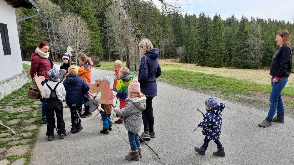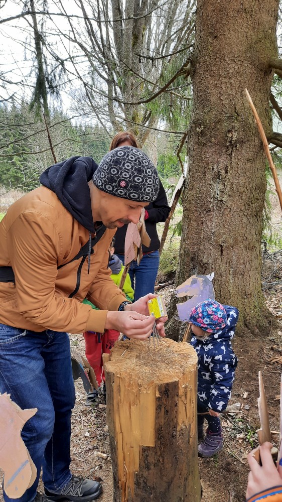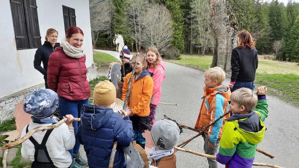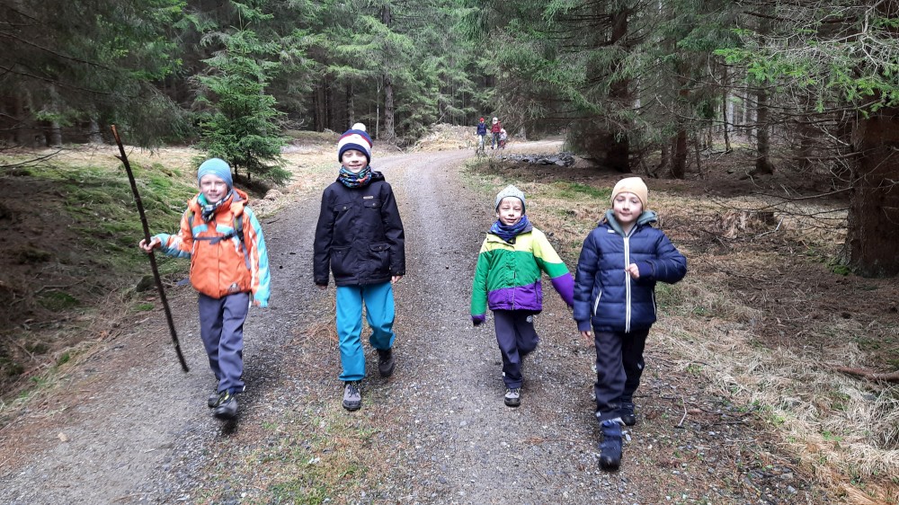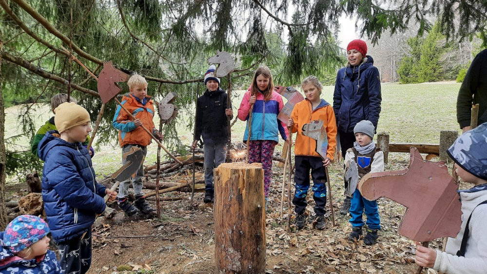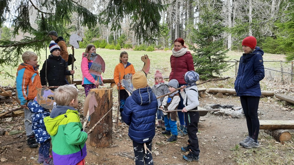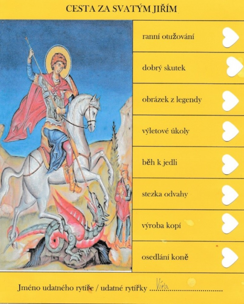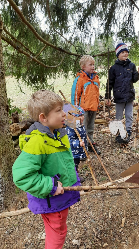 Pak už sedáme do Jimmyho auta, které jsme si sem ráno před výletem zaparkovali. Jedeme na chaloupku a dalšími auty pak vyzvedáváme ostatní. Večer pečeme buřty, děti vyrábí koně a kopí. Po setmění děti čeká ještě stezka odvahy.